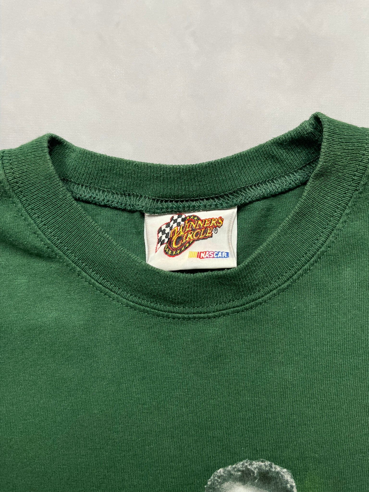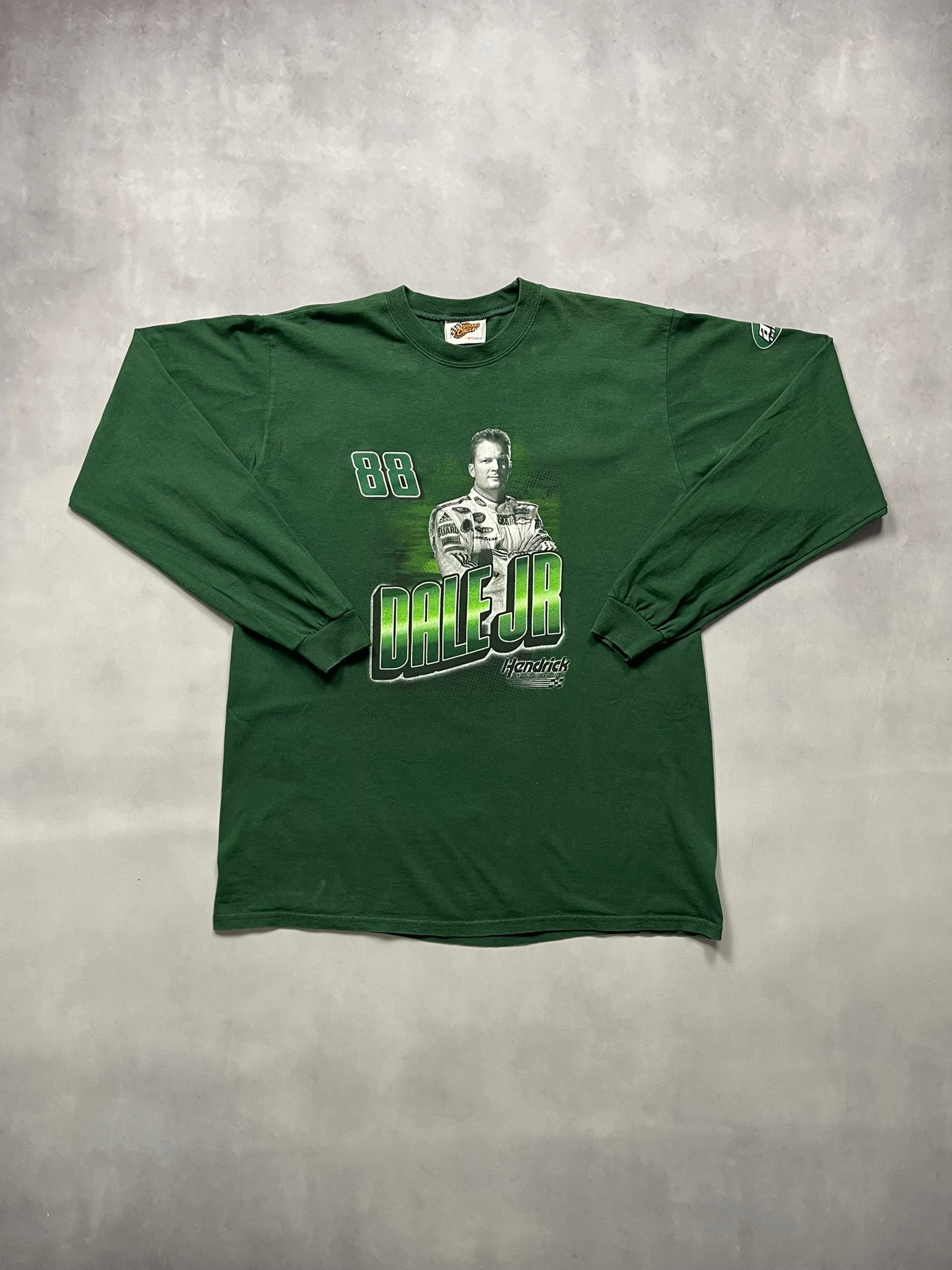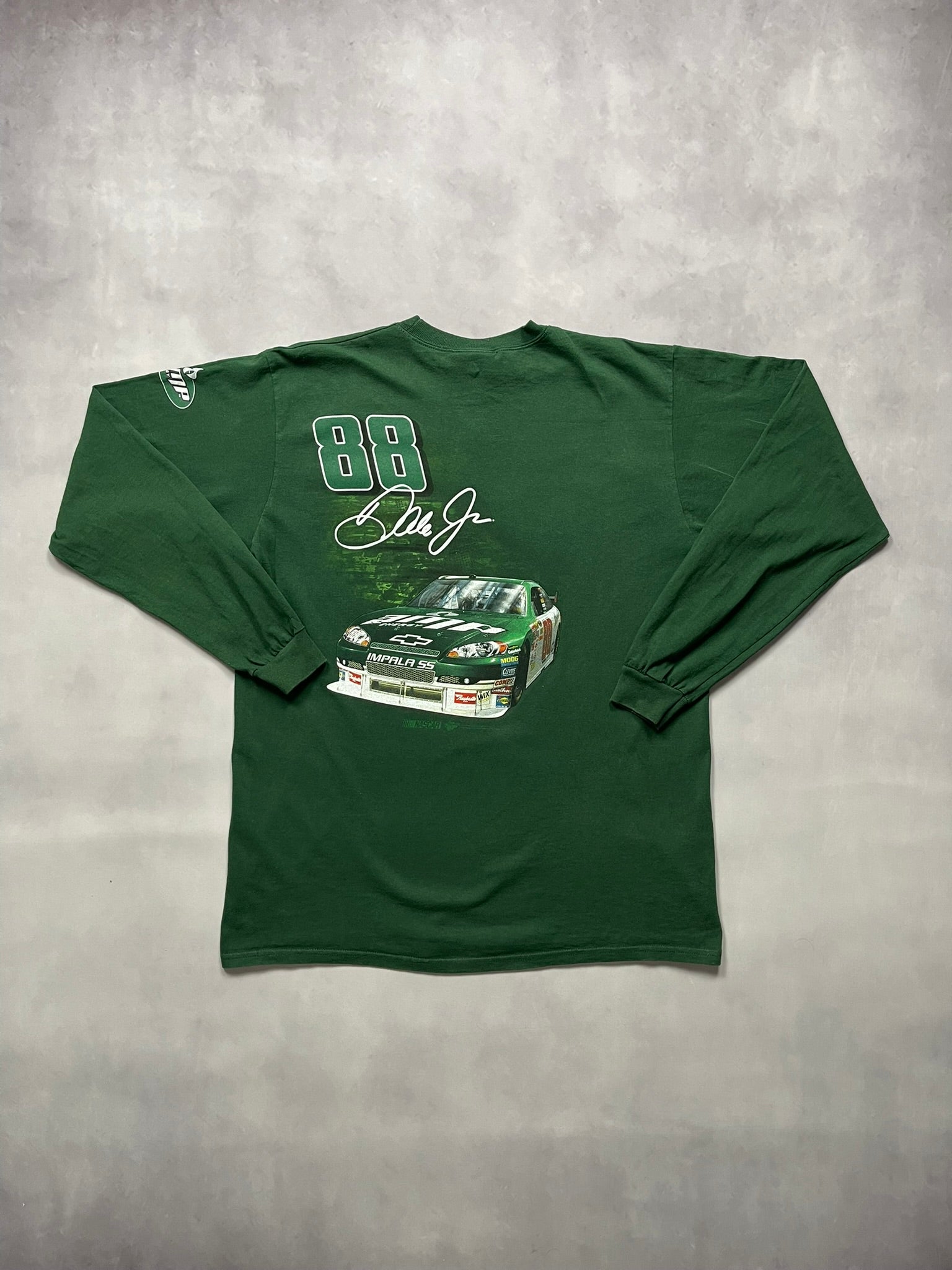 Y2K Dale Jr. long sleeve in bold forest green with full front and back graphics of the No. 88 Amp Energy Impala SS. Killer portrait and car combo with Hendrick Motorsports branding — great piece for fans of the NASCAR legend. Tagged Winner’s Circle.
