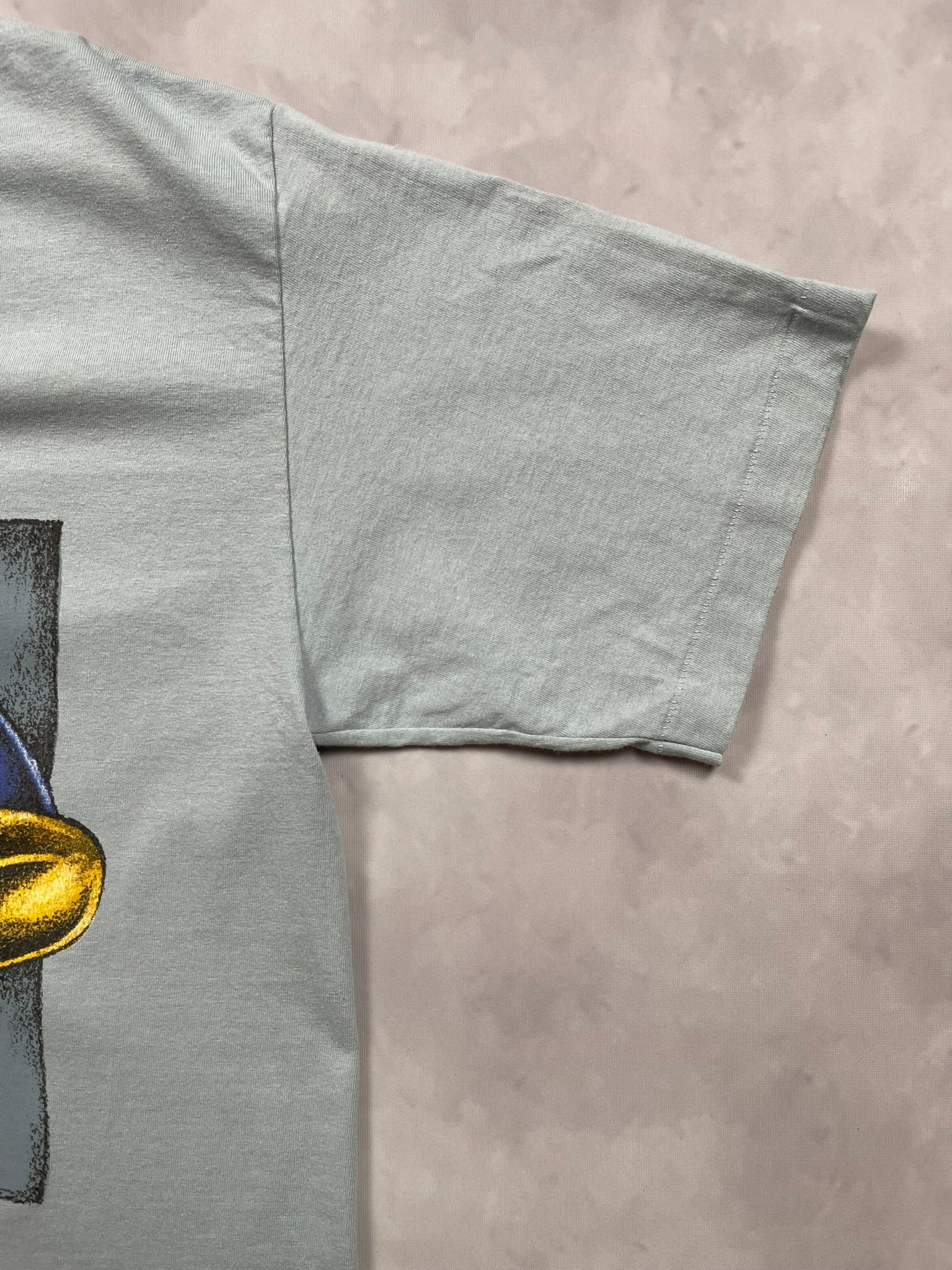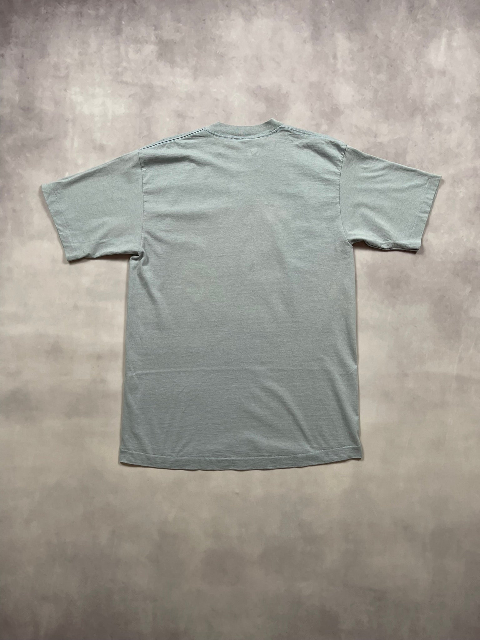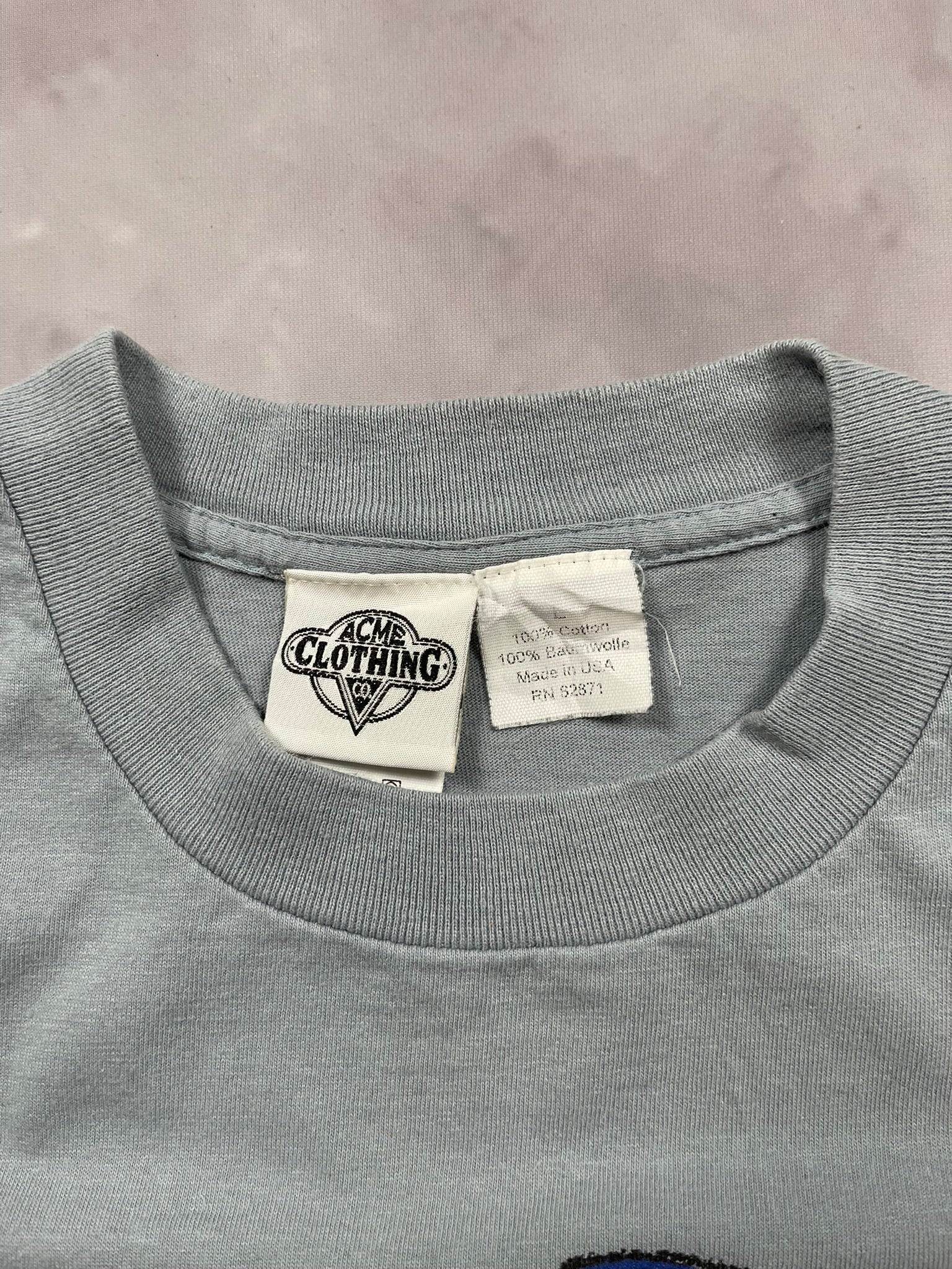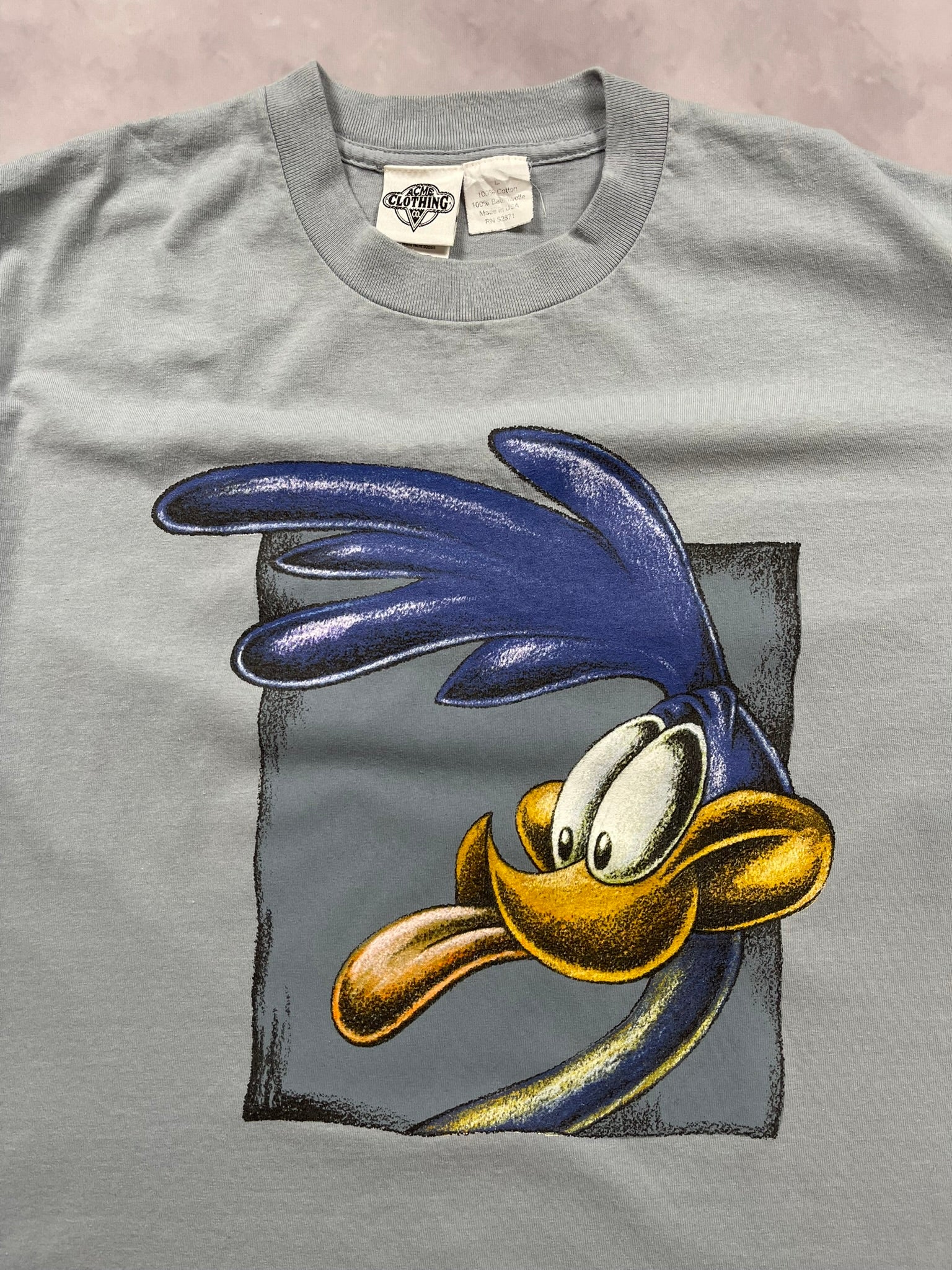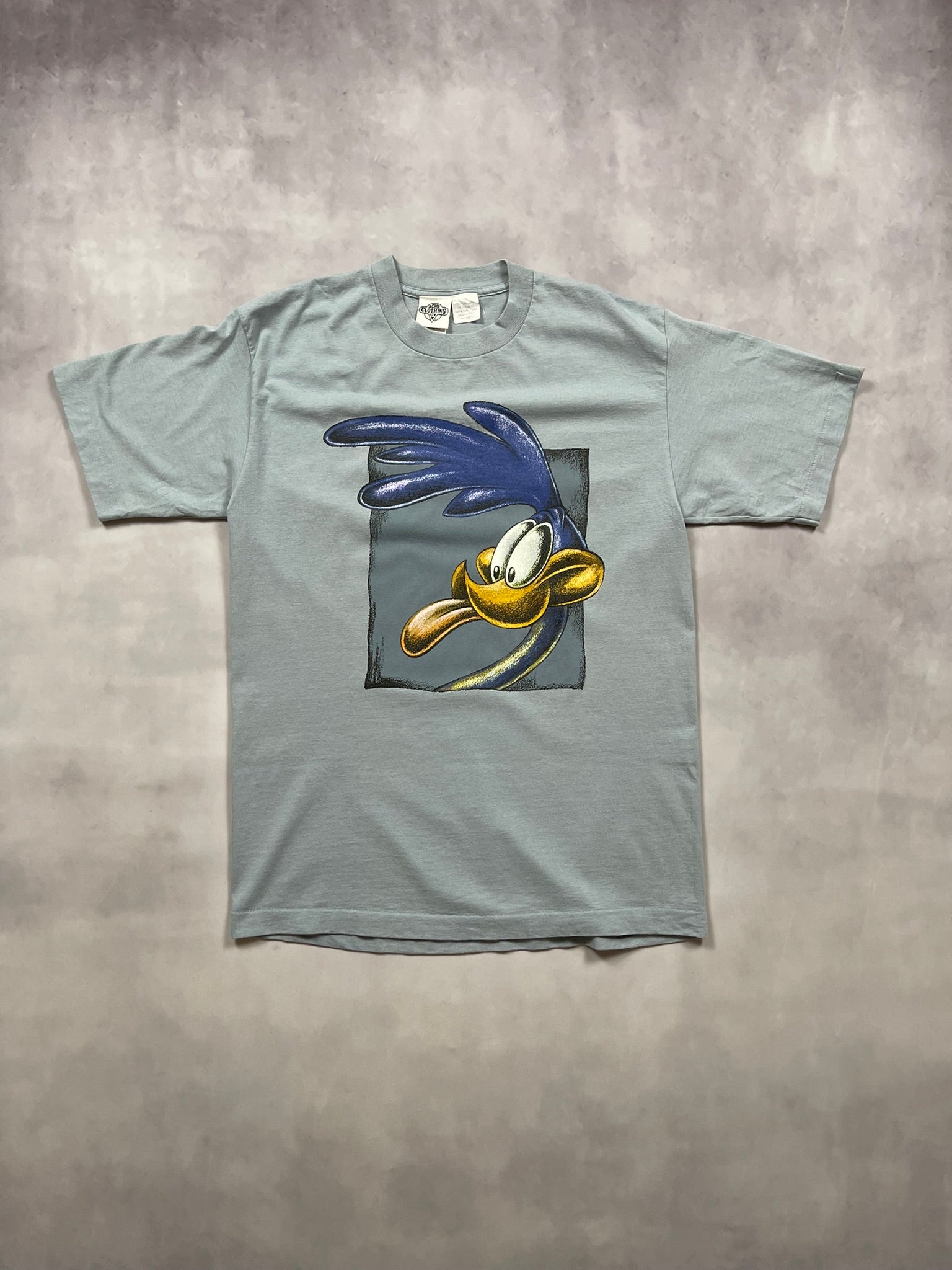 Classic 1991 Road Runner tee with big character energy, printed on a pale blue Acme Clothing Co. USA-made blank. Bold Looney Tunes graphic with textured detailing pops front and center — sharp eyes, slick tongue, and that signature mid-sprint expression. Soft single-stitch feel and early ‘90s animation style make this a great grab for toon collectors and vintage heads alike.