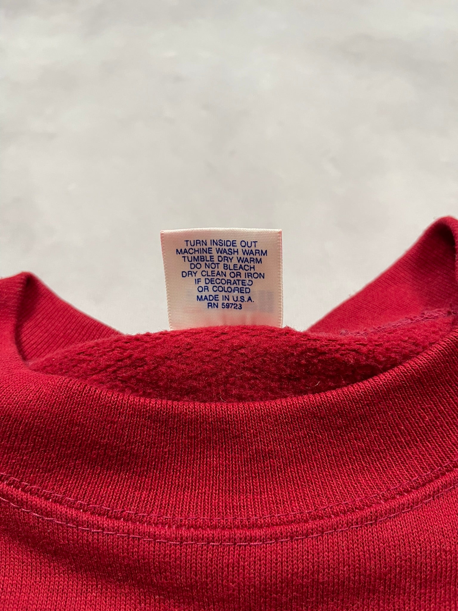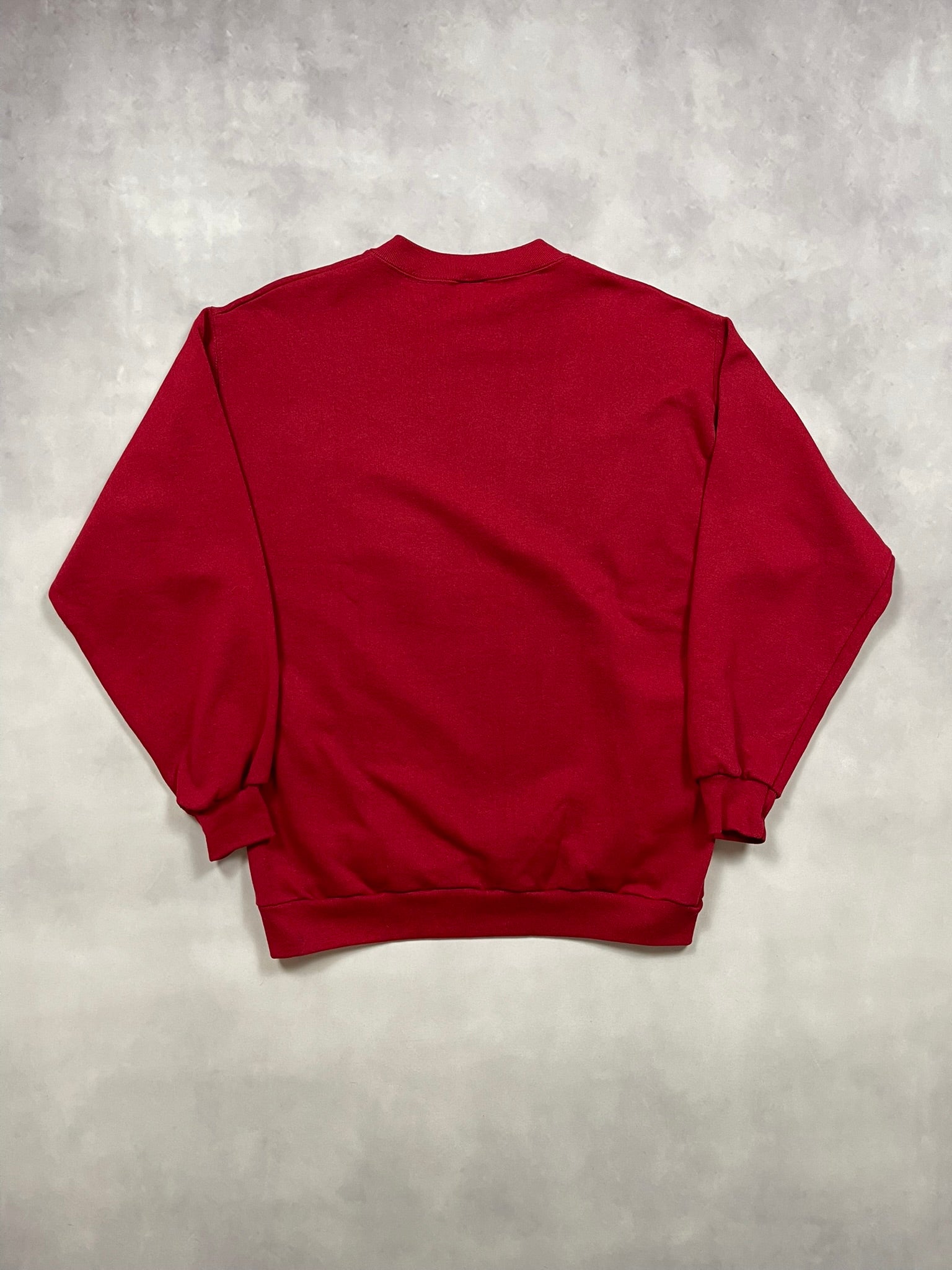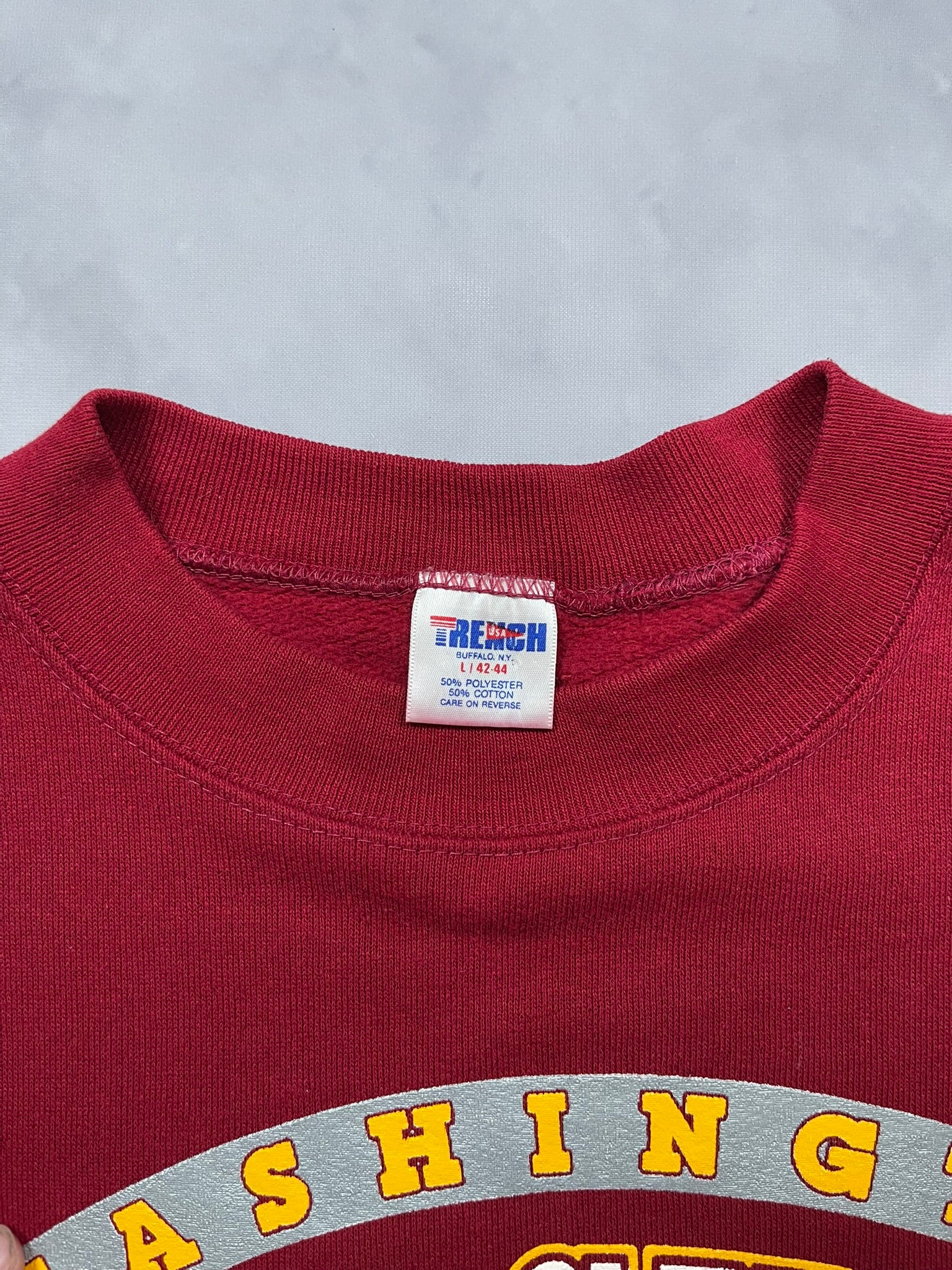 1991 Washington Redskins NFC Eastern Division Champs sweatshirt on a deep burgundy Trench tag, made in USA. Classic puffy paint-style front hit with bold helmet graphic and big CHAMPS arc — a clean piece of early 90s NFL playoff history. Soft fleece interior with strong ribbing at the cuffs and hem. Must-have for vintage football collectors or fans of retro sports crewnecks with that authentic Made in USA build.