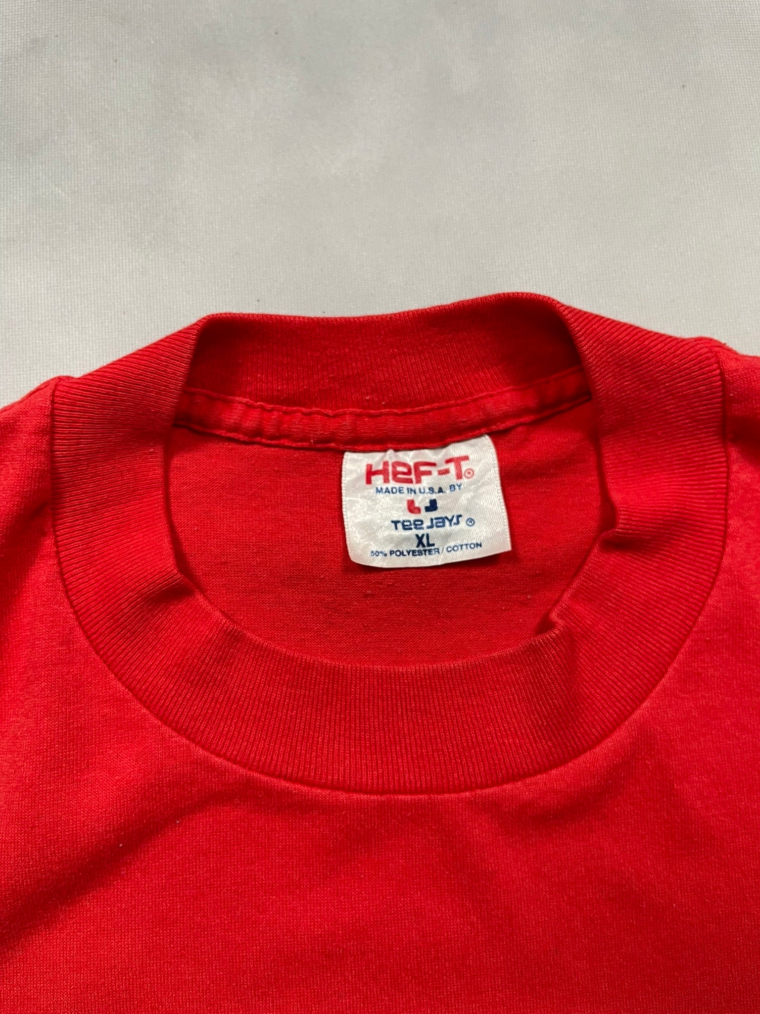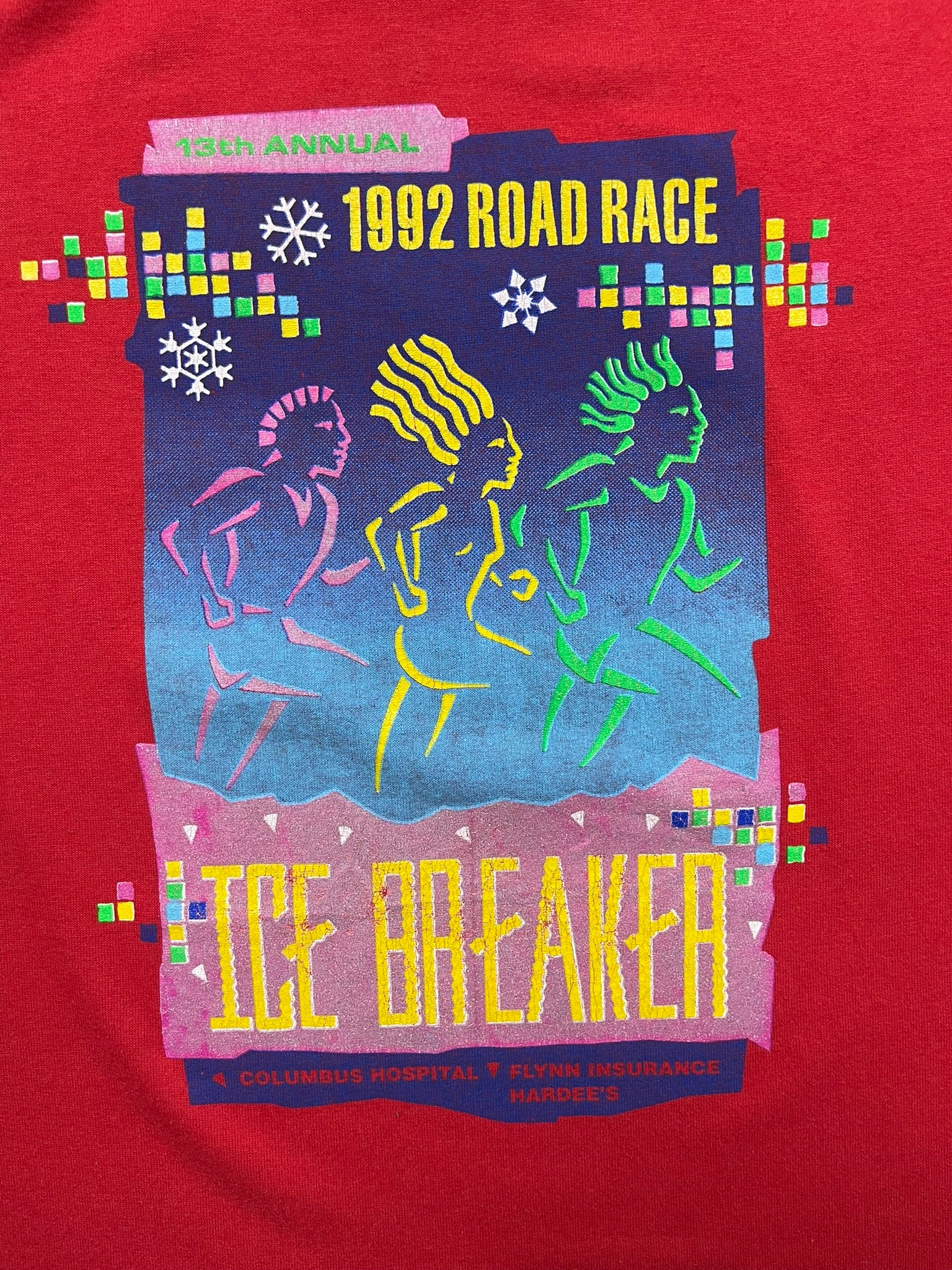 Bold and colorful long sleeve from the 13th Annual Ice Breaker 1992 Road Race, printed on a red HEF-T x Tee Jays tag and made in USA. Neon runners, snowflakes, and pixel blocks give this one peak early 90s energy with serious retro graphic appeal. Soft poly-cotton blend with a boxy cut and strong print hit. Great grab for runners, vintage race tee collectors, or anyone chasing that loud 90s athletic look.