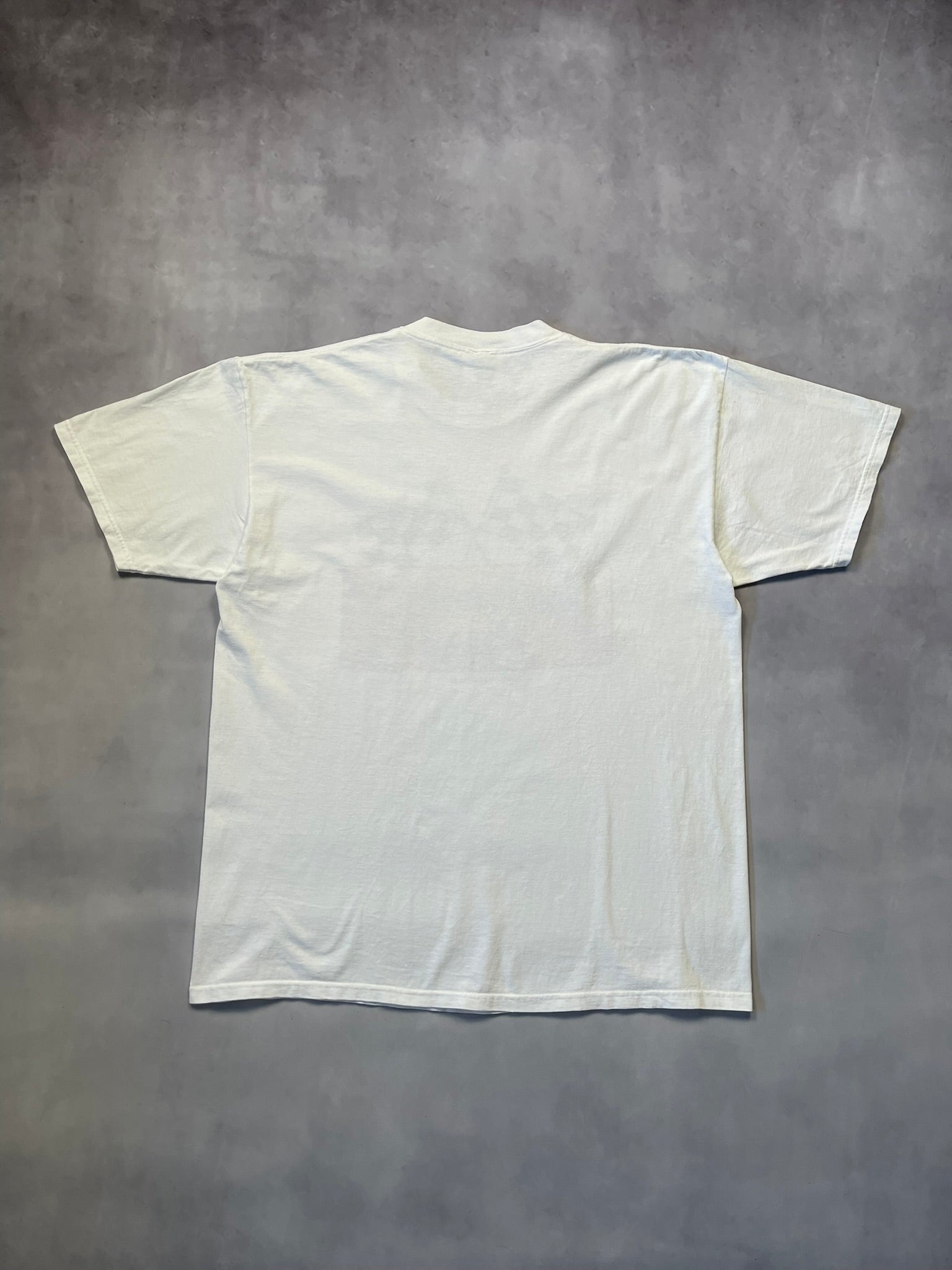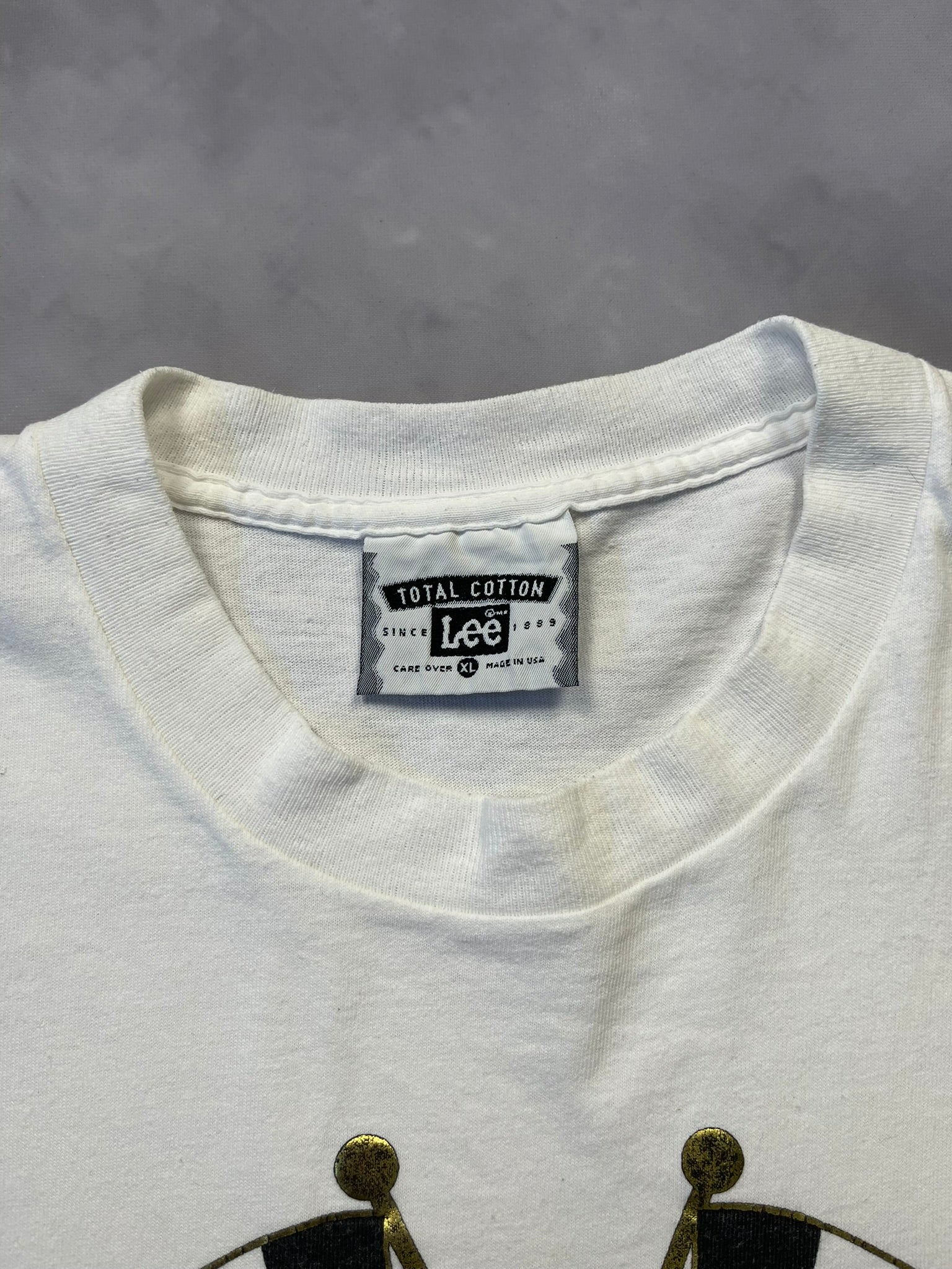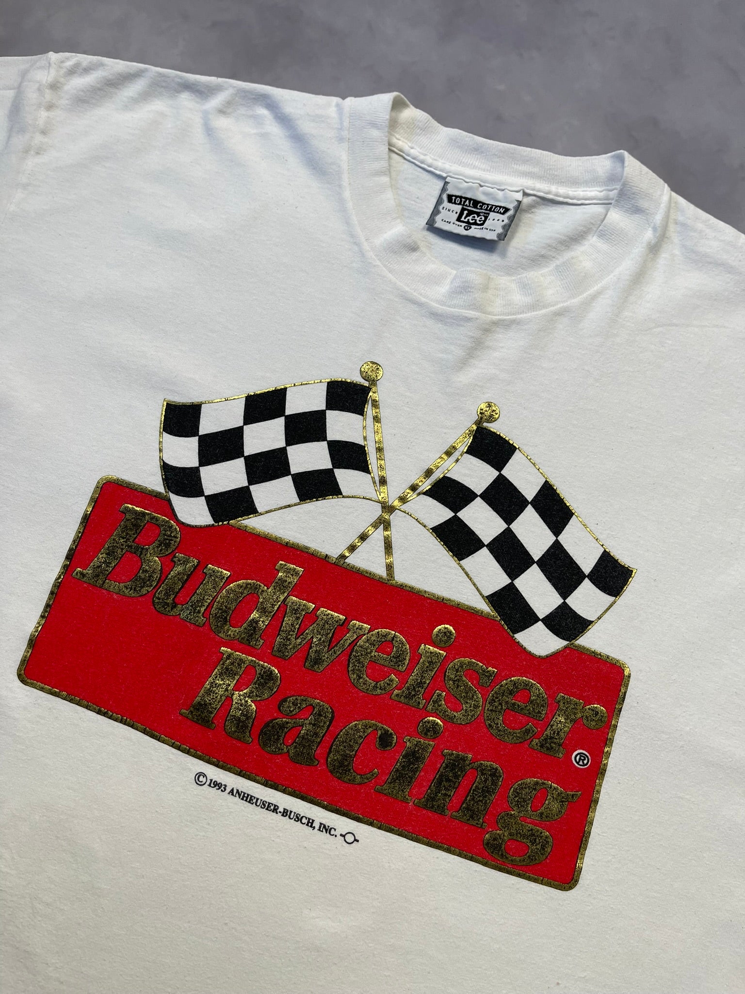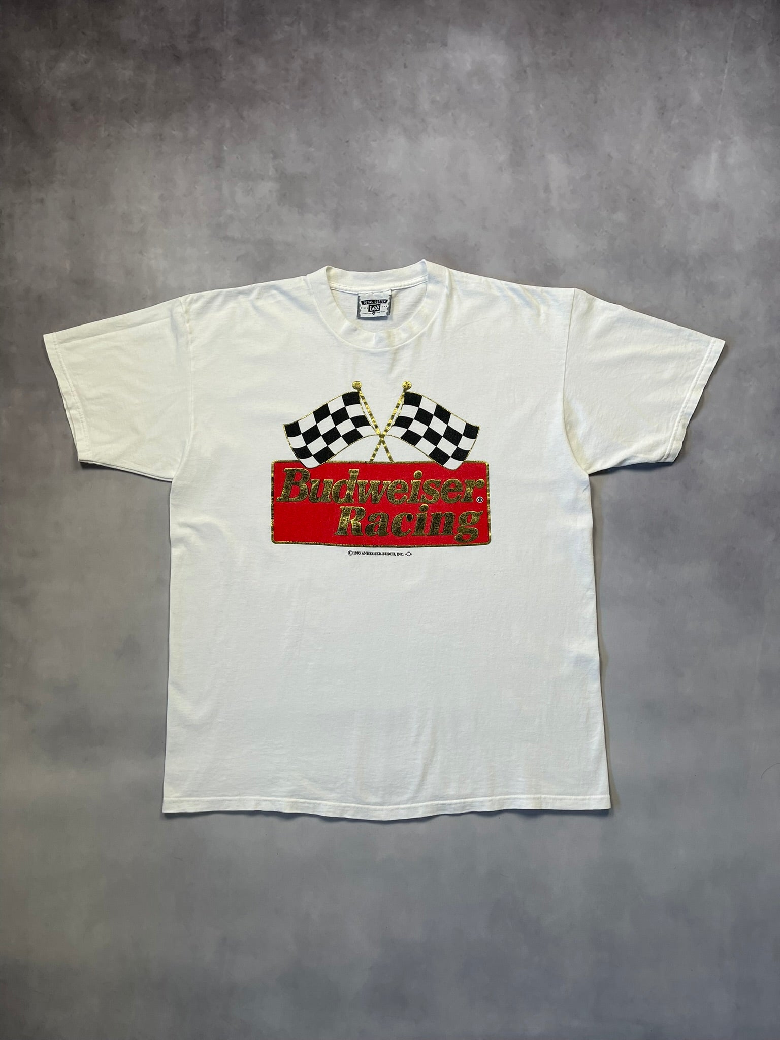 1993 Budweiser Racing tee with bold metallic gold and red graphic front and center — checkered flags crossed up over the iconic Bud logo. Made in USA on a heavyweight Lee Total Cotton blank, this one's got that crisp early '90s NASCAR promo energy. Clean back, classic fit, and killer shine on the print. Great pickup for racing collectors or fans of beer-branded motorsport gear.