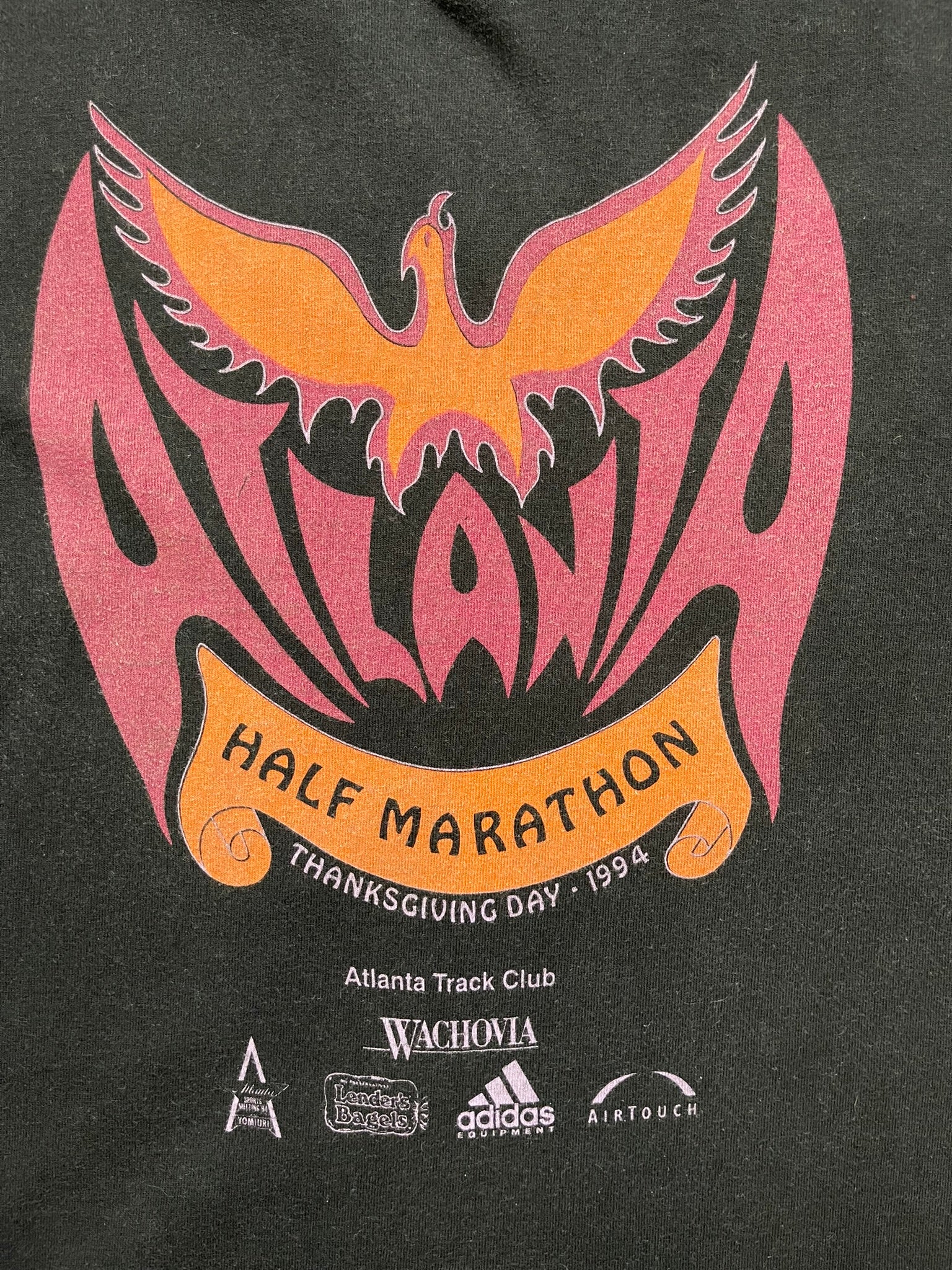 1994 Atlanta Half Marathon long sleeve on a USA-made Fruit of the Loom tag. Killer phoenix flame graphic in bold red and orange — classic 90s sportswear energy with sponsors like Adidas and Wachovia locked in below. Crisp single-sided print, perfect for collectors of vintage running tees, race day shirts, or Atlanta history pieces. Great pickup for fans of retro athletic wear, marathon gear, or 90s graphic longsleeves.