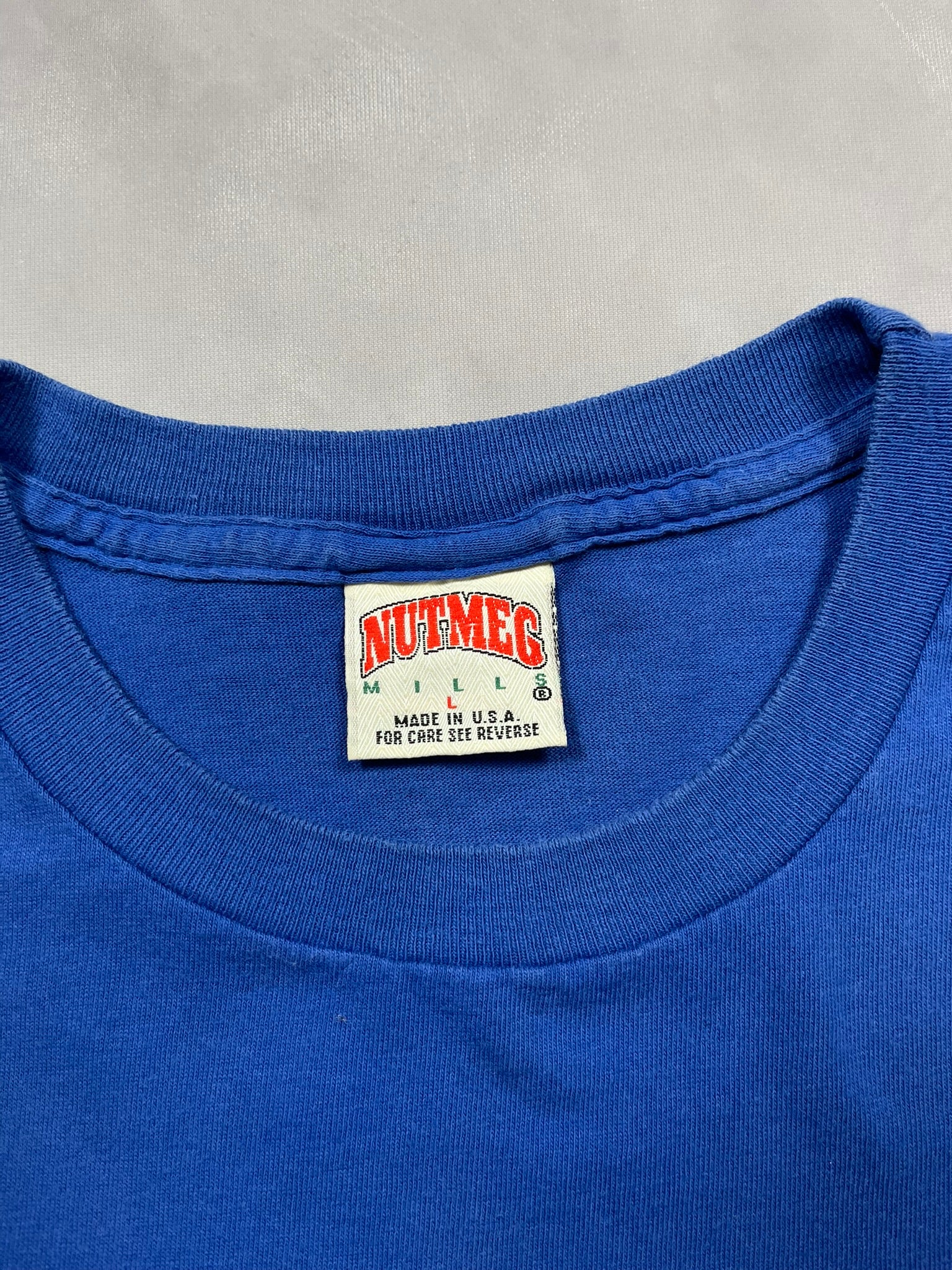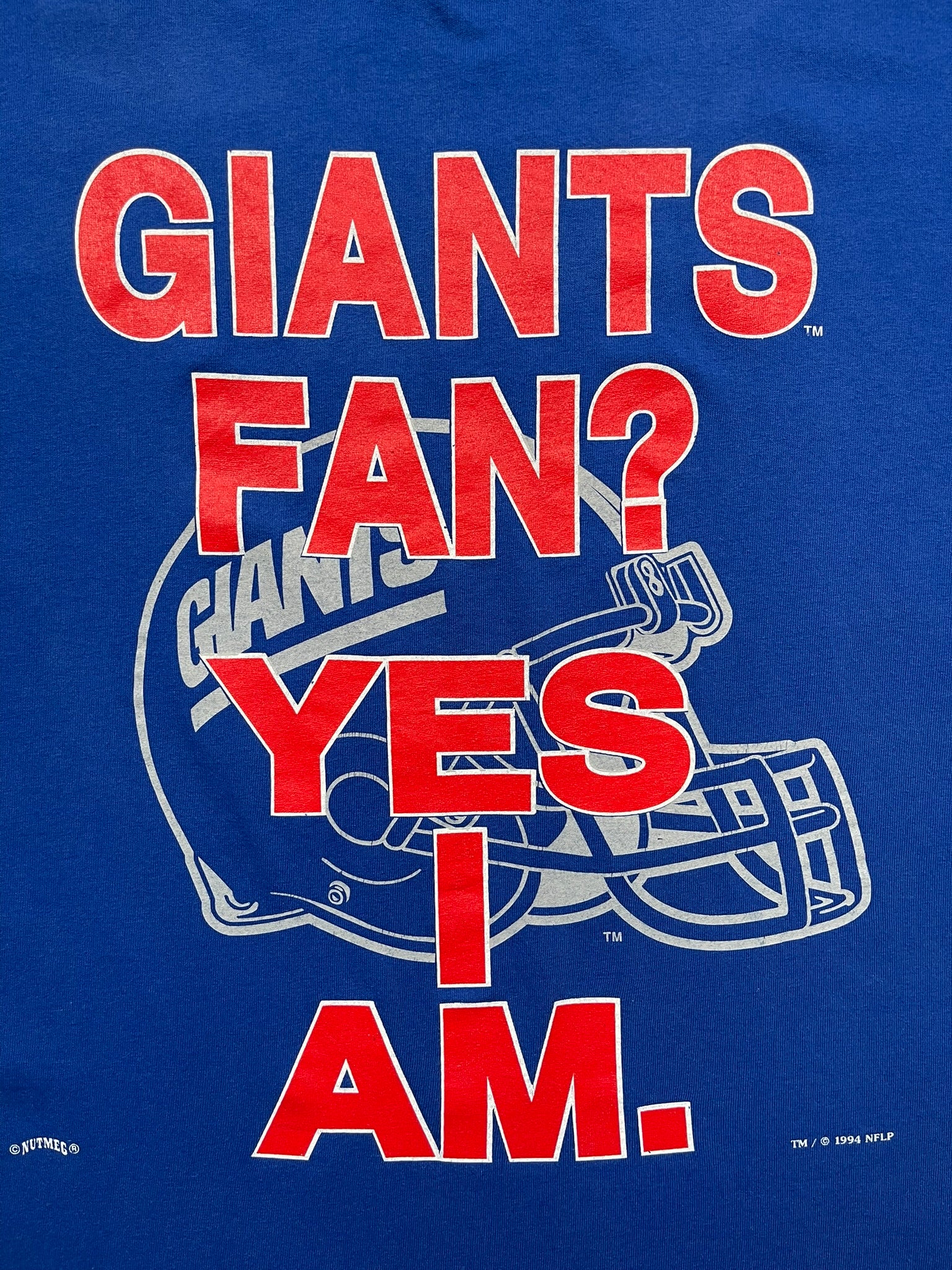 Vintage 1994 New York Giants fan tee from Nutmeg Mills, officially licensed by the NFL. Bright royal blue base with bold red and white print that reads “GIANTS FAN? YES I AM.” Classic 90s sportswear energy on a Made in USA cotton tee. Perfectly preserved with that crisp Nutmeg quality and heavyweight feel. Essential piece for any vintage football or Giants collector.