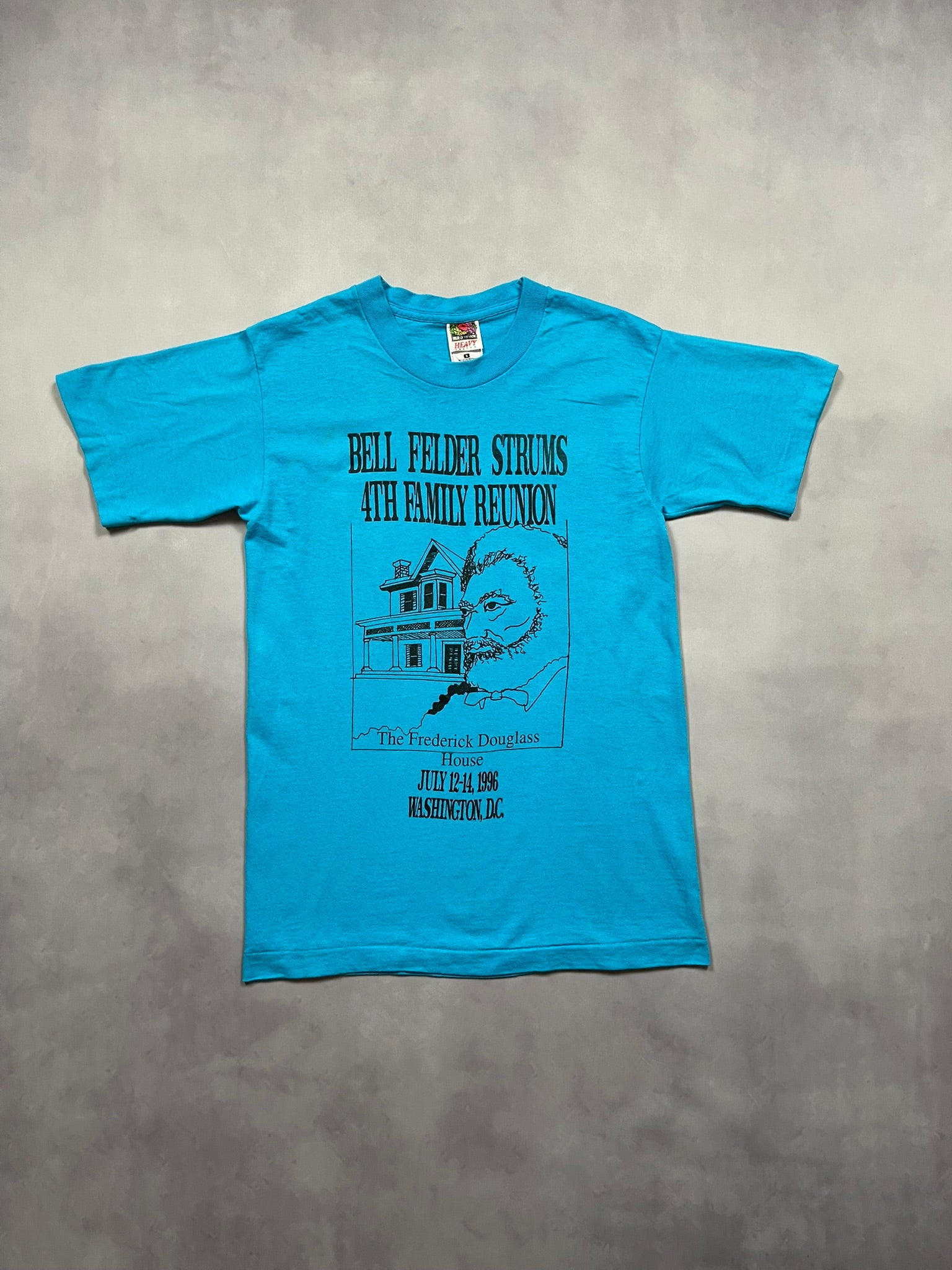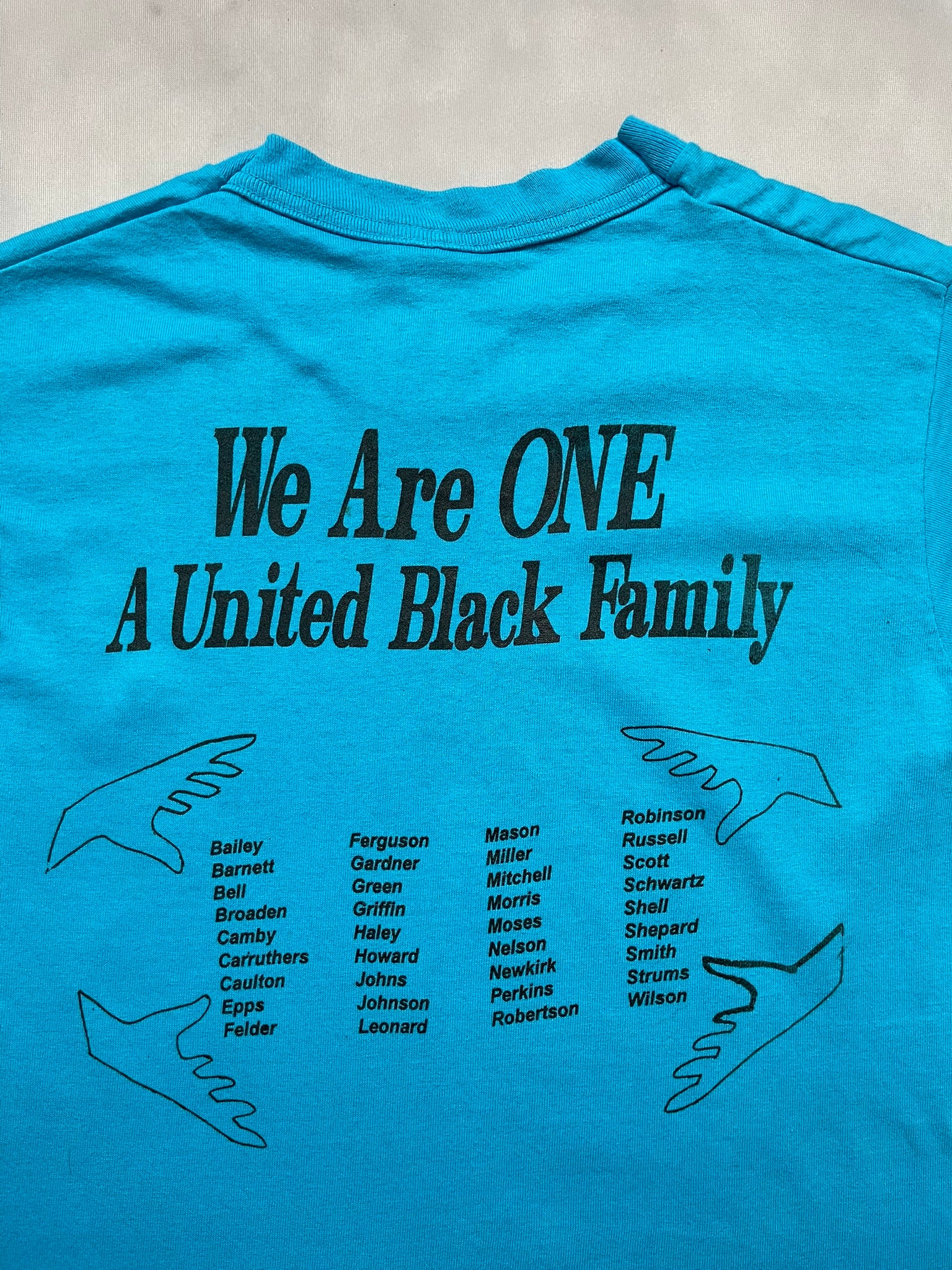 True 90s family reunion tee from the Bell-Felder-Strums gathering held at the historic Frederick Douglass House in Washington D.C., dated July 12–14, 1996. Bold two-sided print with powerful “We Are ONE: A United Black Family” back hit, listing surnames in unity across a bright aqua Fruit of the Loom Heavy Cotton blank. Made in USA and built to last, this one blends heritage, history, and deep cultural roots. Great pick for vintage collectors, BHM-inspired styling, or anyone chasing rare 90s graphic tees.