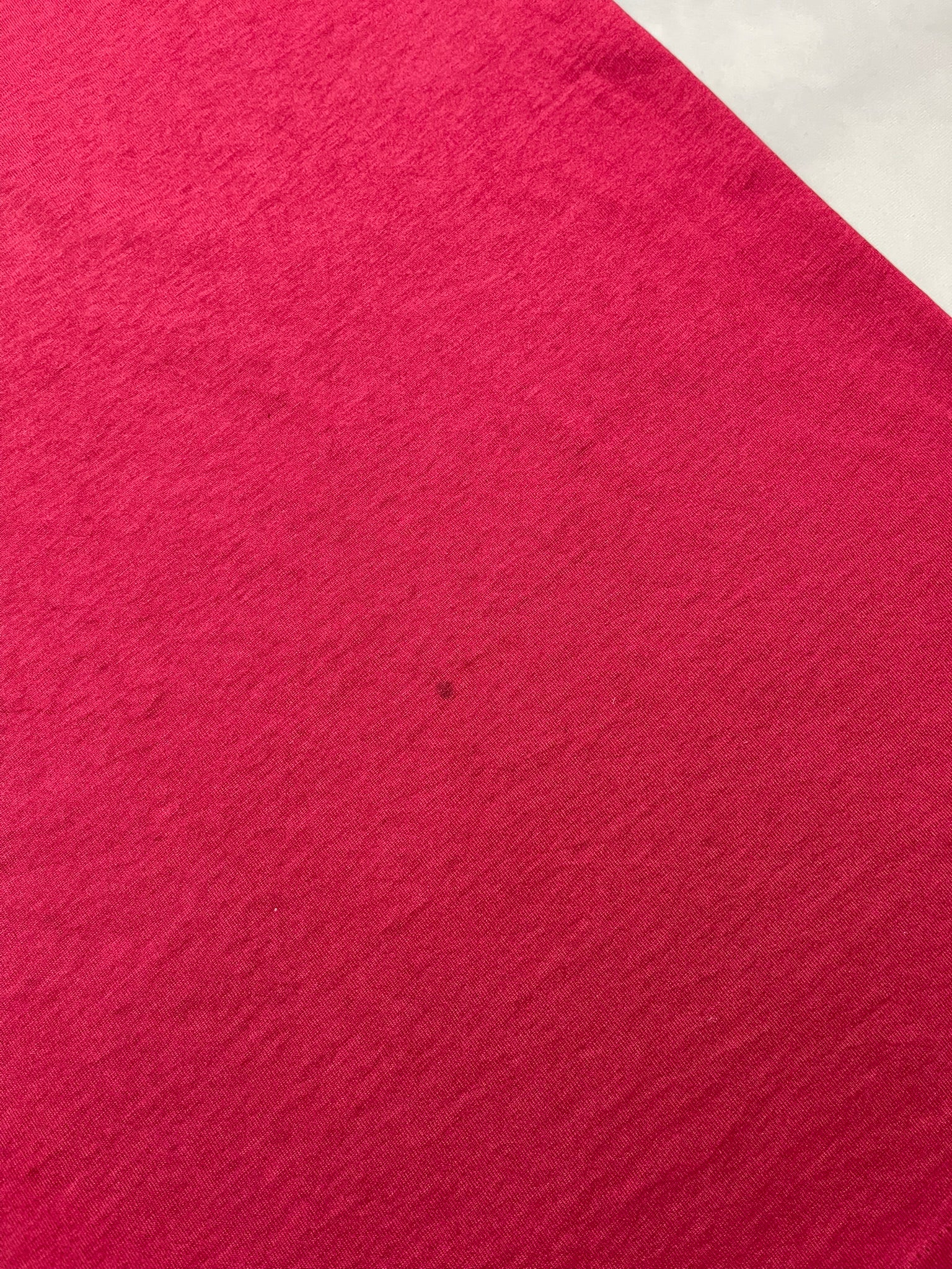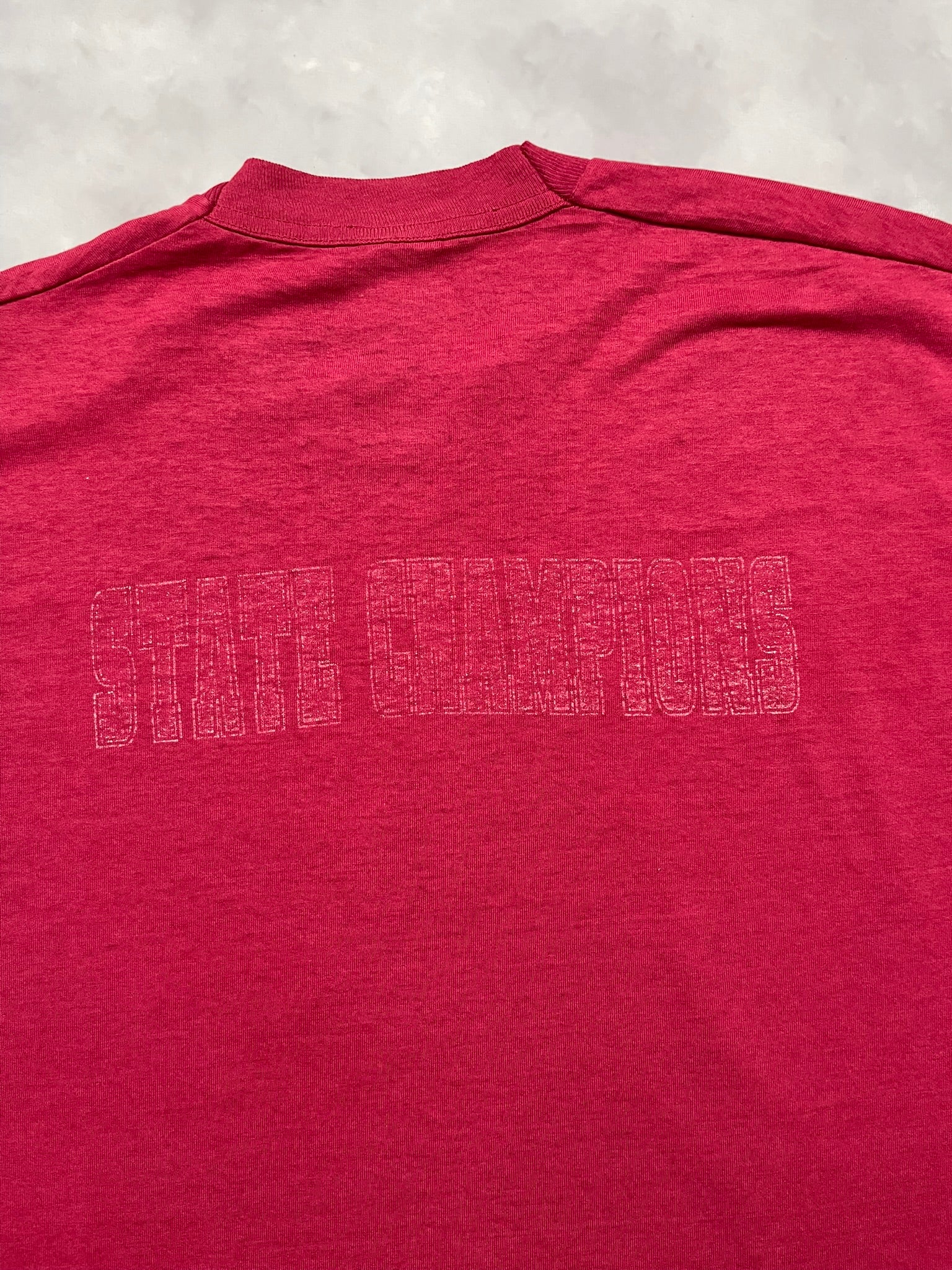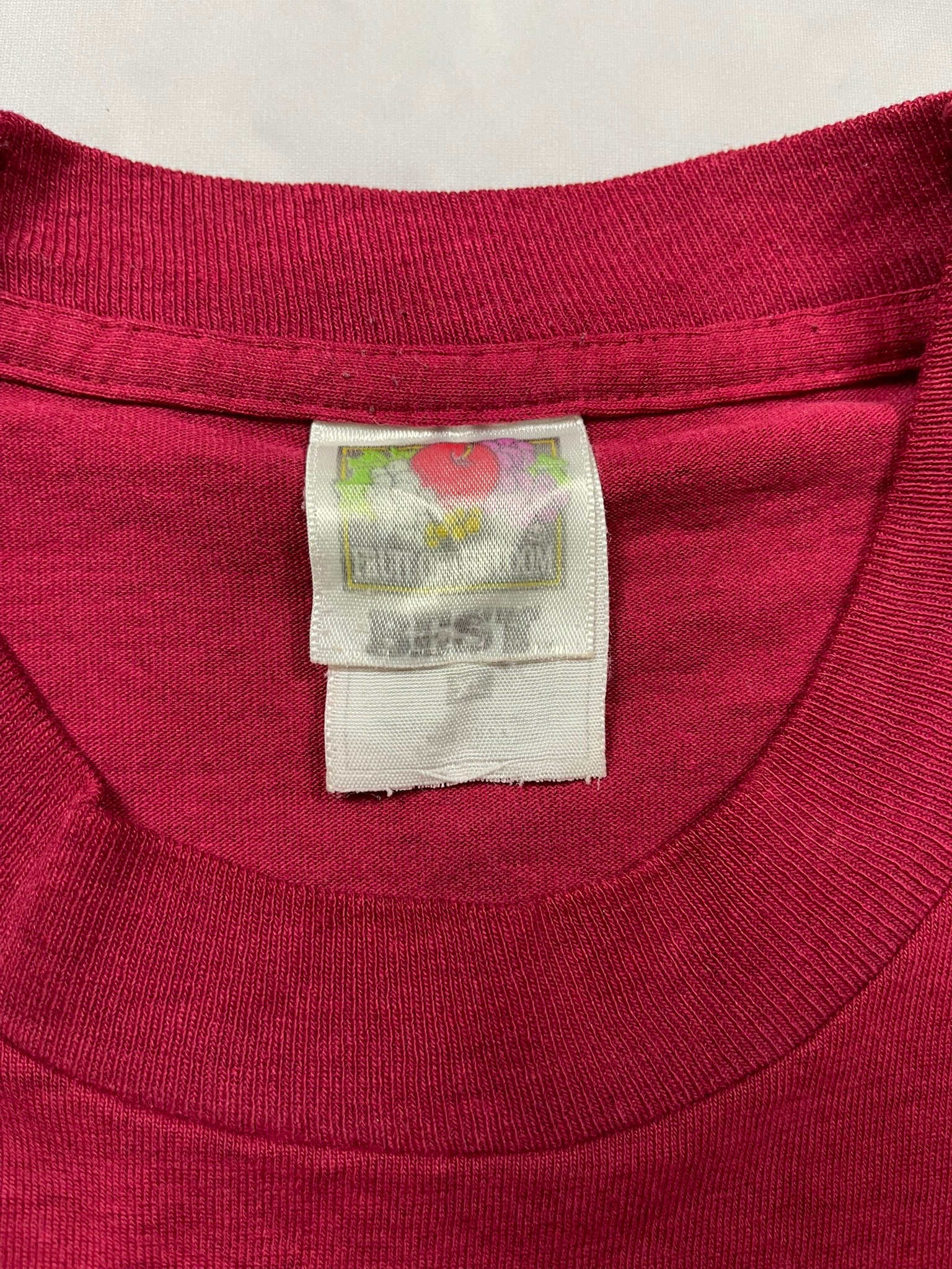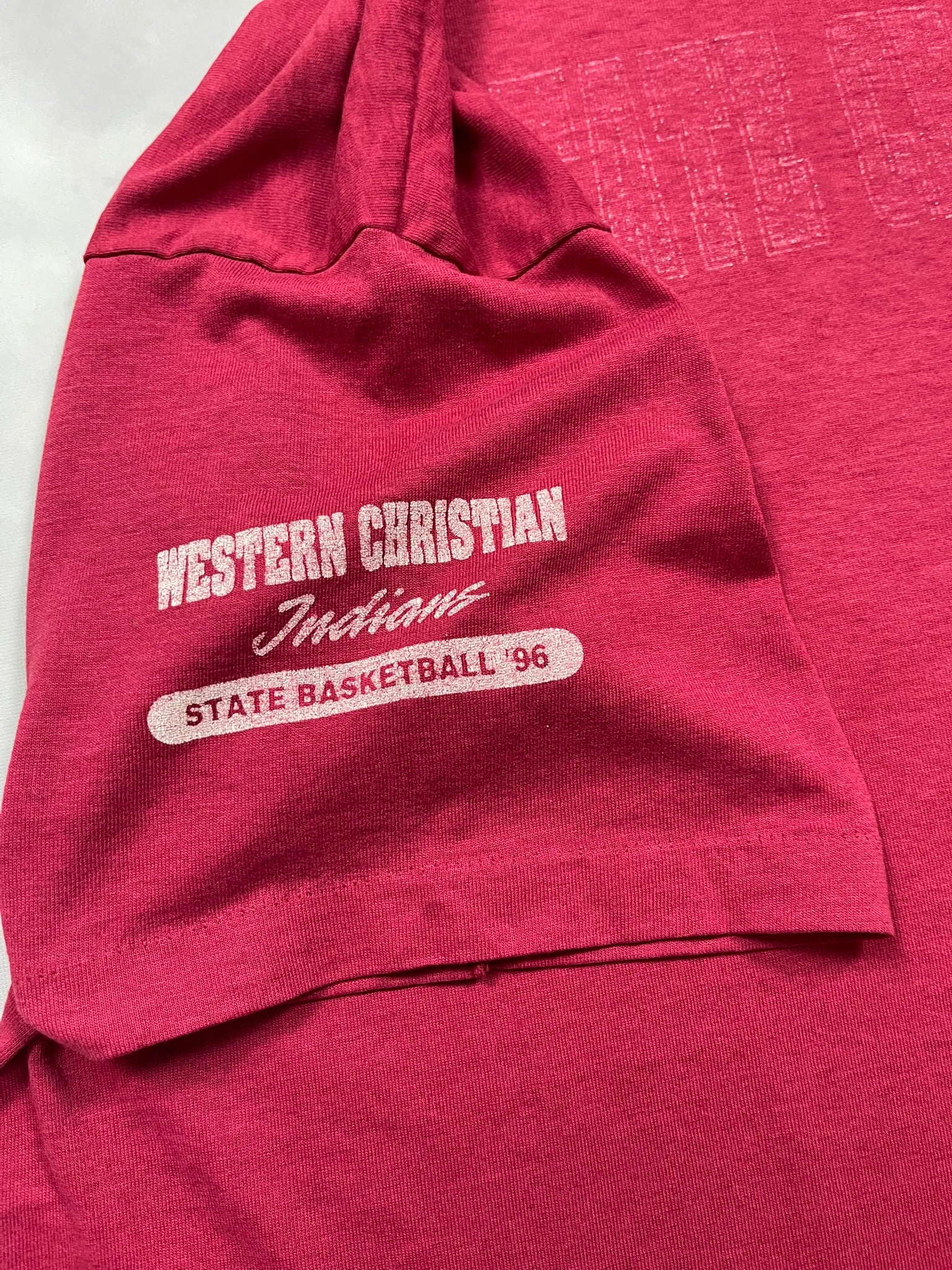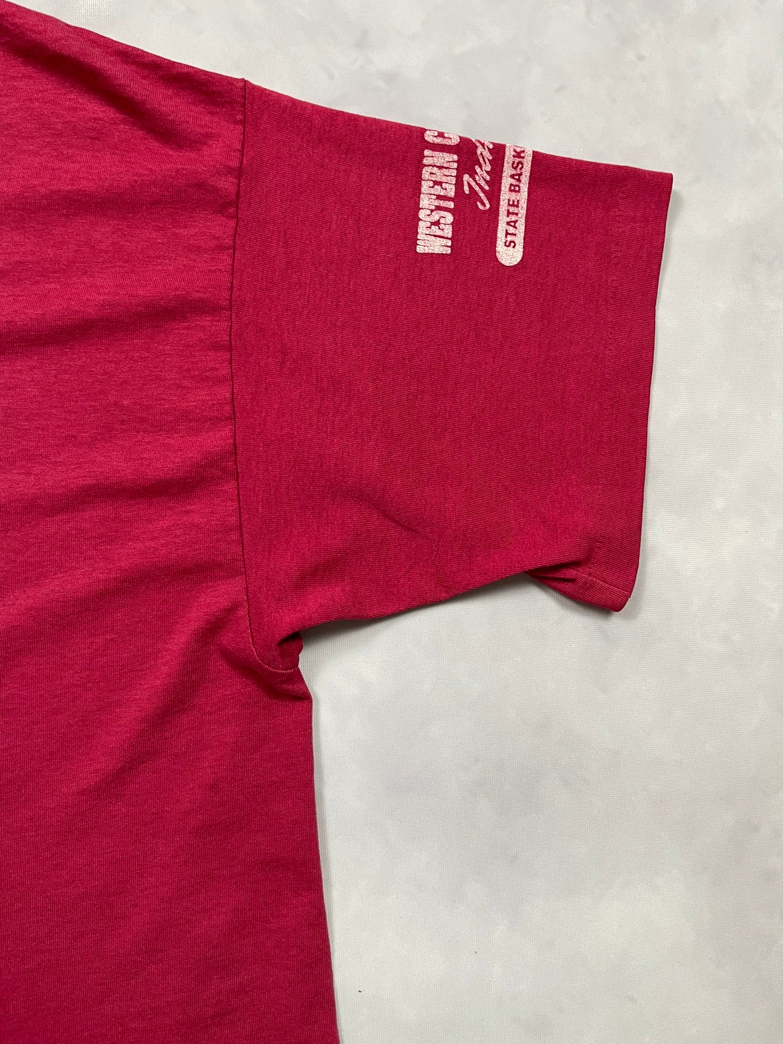 1996 Iowa High School State Basketball tee on a soft red Fruit of the Loom blank — great gym-class energy with a bold vertical print and player silhouette. Features front and back hits plus a “Western Christian Indians” sleeve graphic, repping their state run that year. Lightweight and broken in with nice texture throughout. Solid pickup for 90s sports tee collectors, vintage basketball fans, or anyone into local high school tournament graphics.