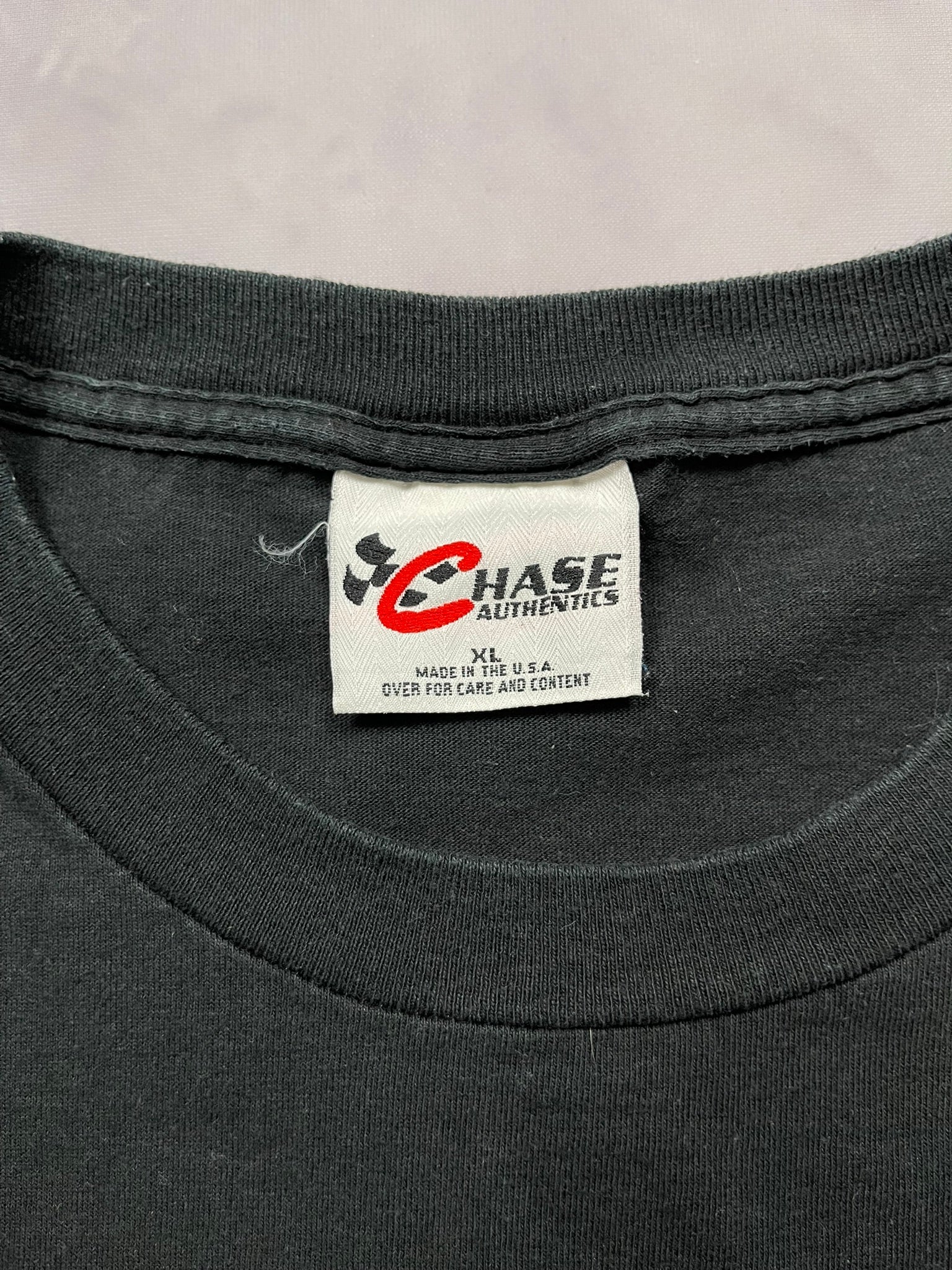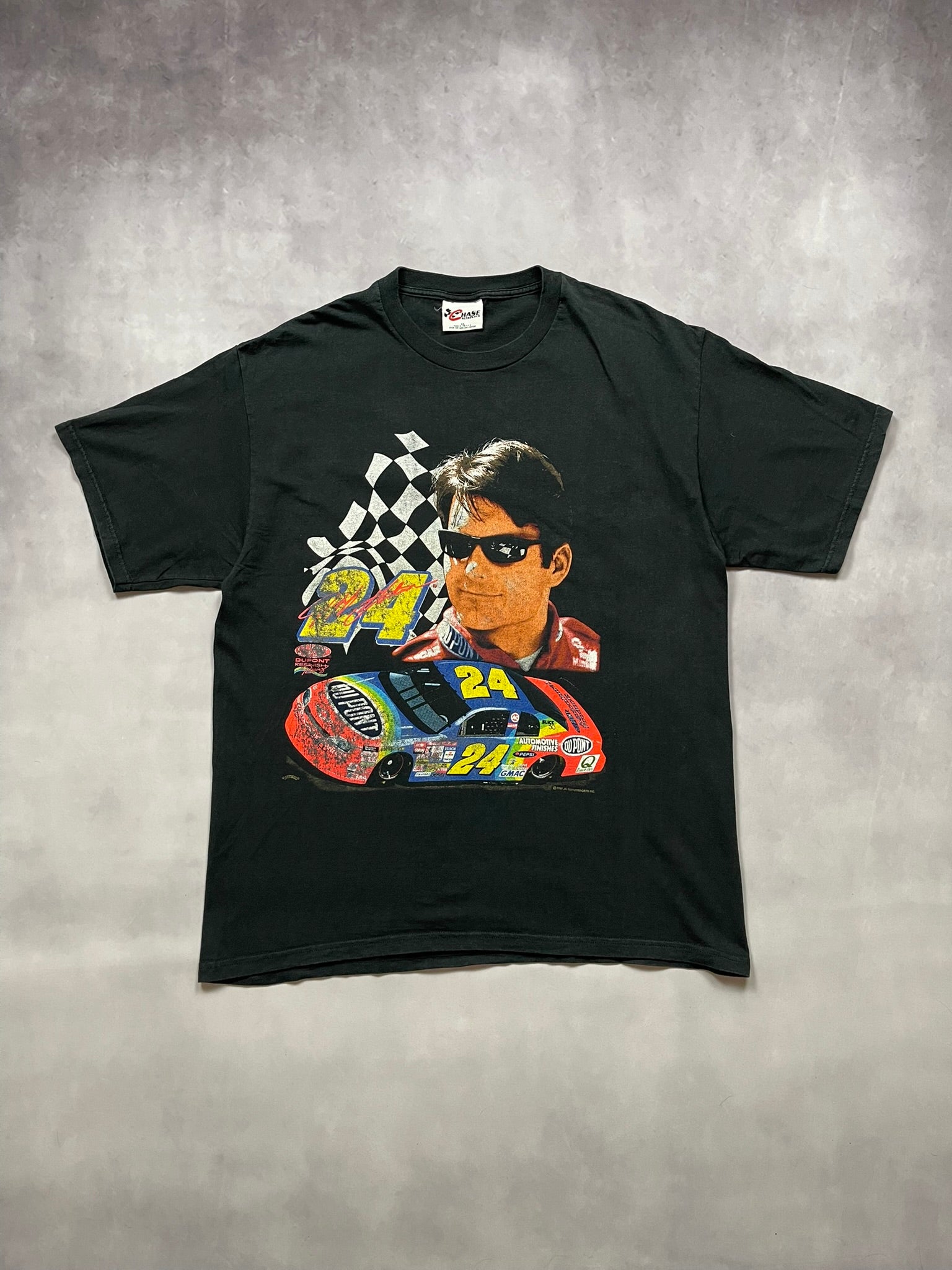 An incredible Nascar tee of our (third) favorite Nascar driver of all time: Jeff Gordon (behind Earnhardt). On the Chase Authentics tag, made in USA. Got a slight fade to is. This is truly what we would call: "the perfect Nascar tee".