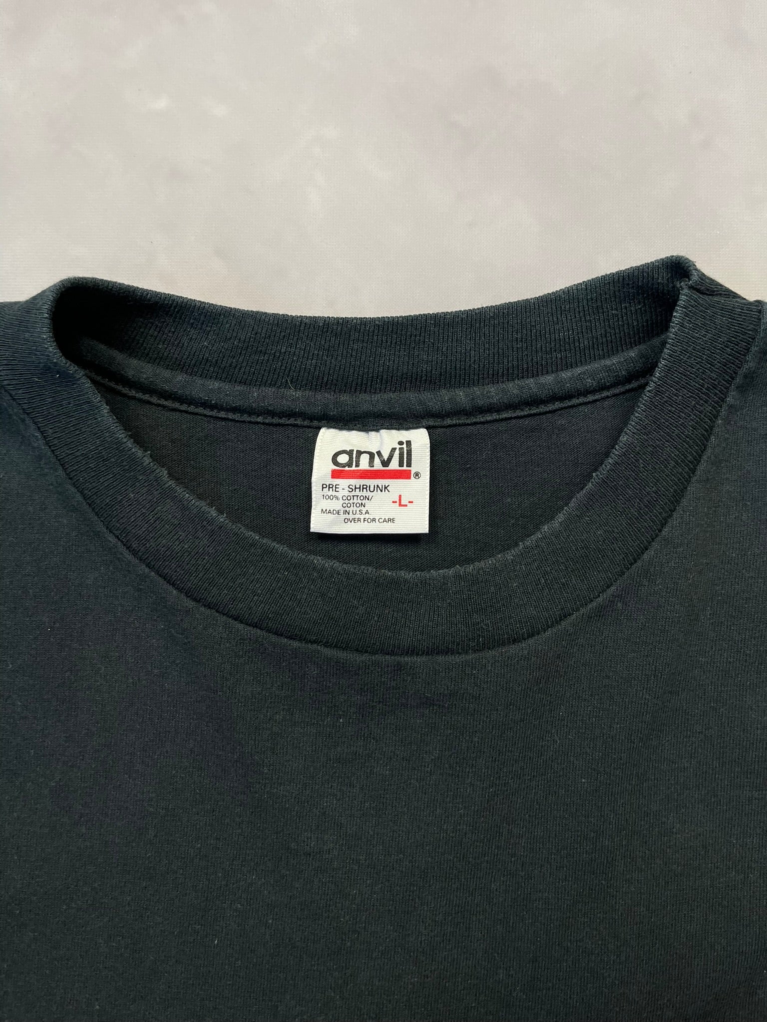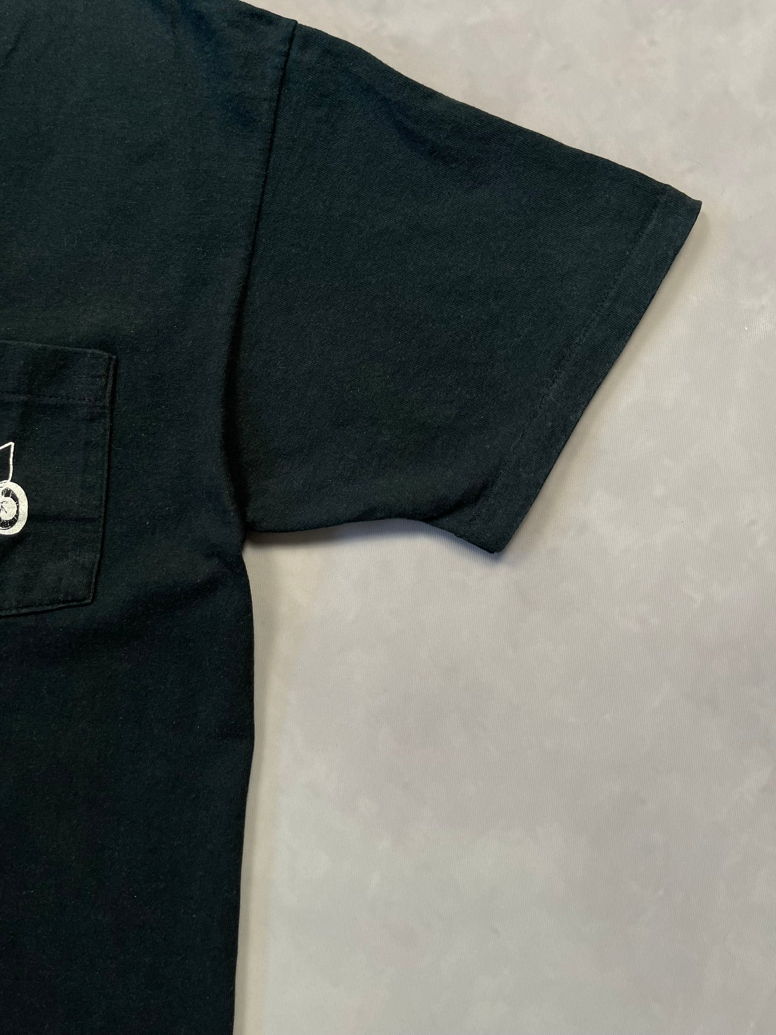 Straight from the 1998 Southern Ohio Bikers Summer Tour, this tee reps classic midwestern biker rally energy with sponsor hits from bars, taverns, and hometown heroes across Ohio and Indiana. Bold front pocket print with S.O.B. chopper graphic over the state outline, and a stacked back featuring everything from stadium hangs to Shriners support. Printed on a made-in-USA Anvil tee with a nicely worn fade. Killer piece for rally vets, Harley heads, or anyone chasing that late-90s biker vibe.