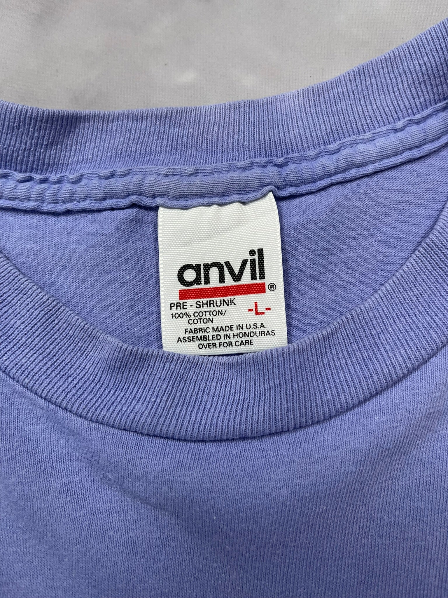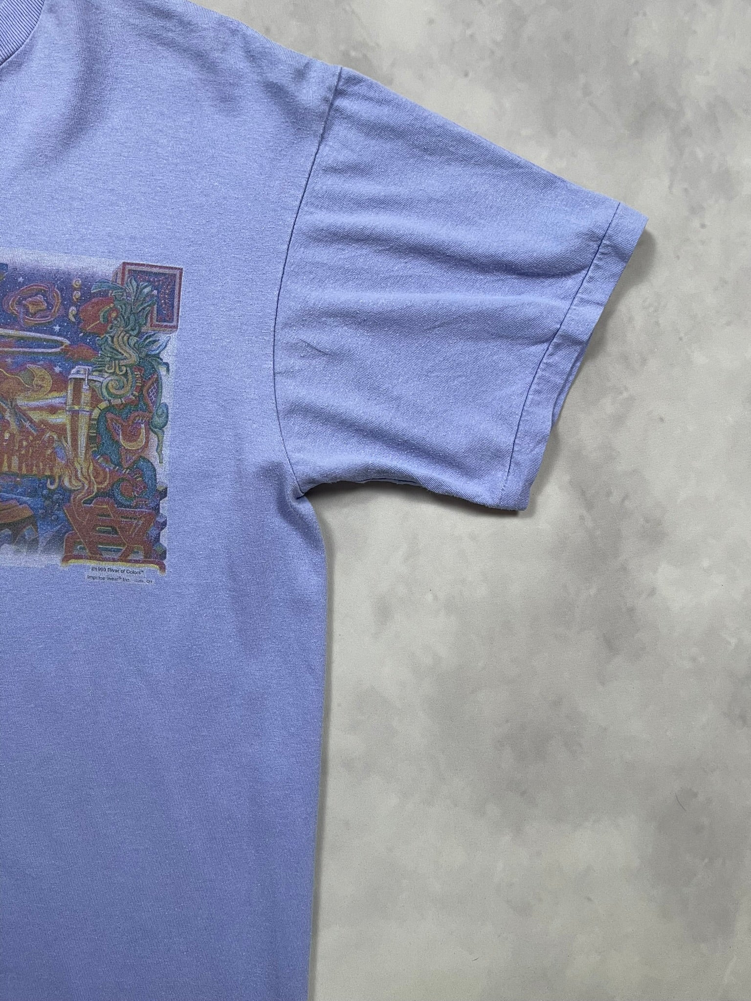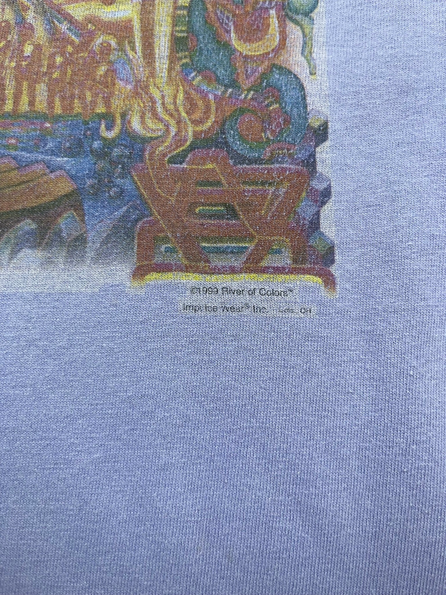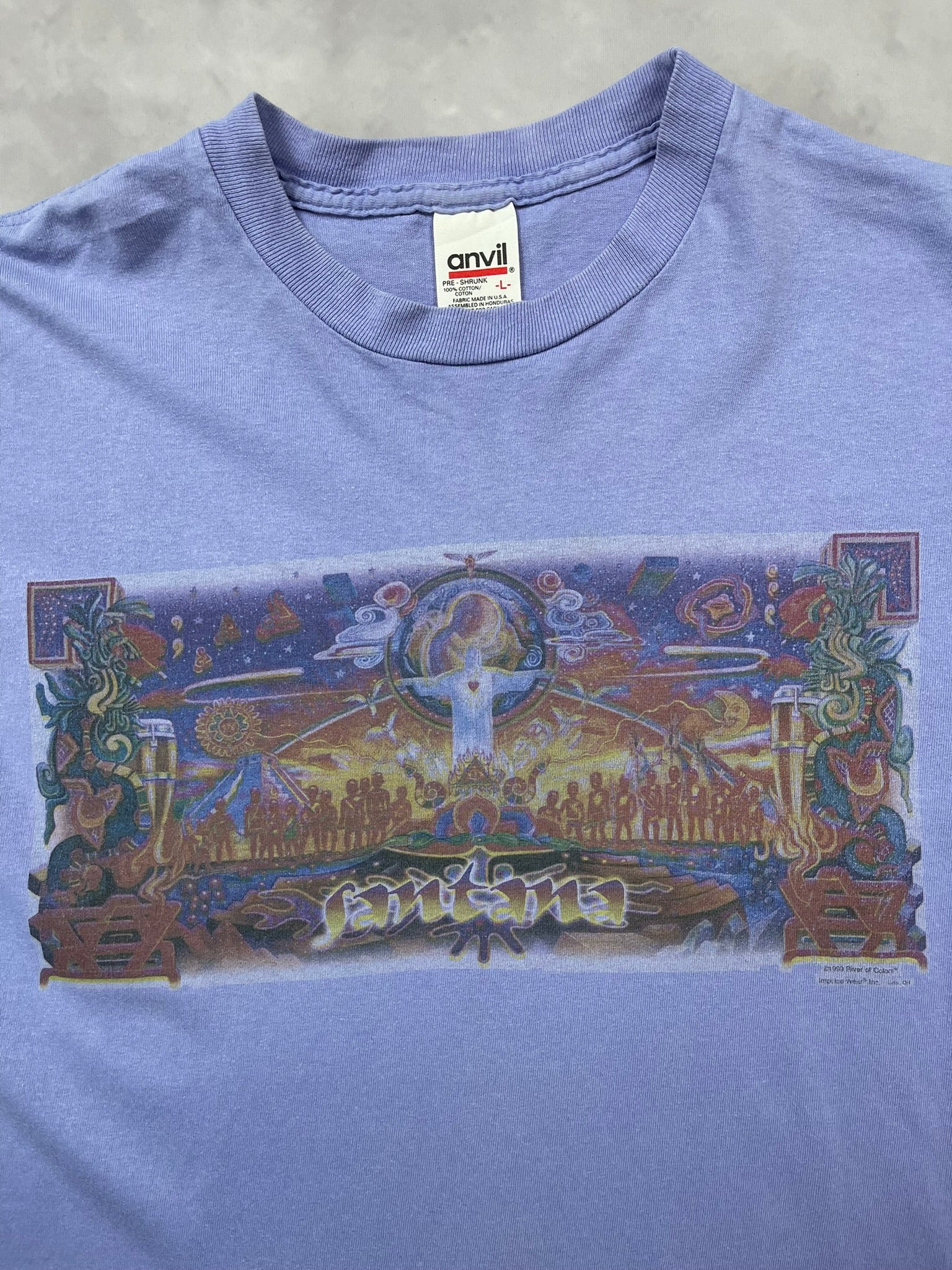 Late 90s Santana graphic tee with a wild River of Colors print, dated 1999. Surreal psychedelic art piece by Impulse Wear, featuring celestial beings, tribal motifs, and cosmic energy — a visual nod to Santana’s spiritual Latin rock legacy. Printed on a lavender Anvil tee (fabric made in USA), this one hits hard for fans of 90s music tees, jam band culture, or trippy festival art. Great piece for Santana collectors or lovers of visionary concert-style graphics.