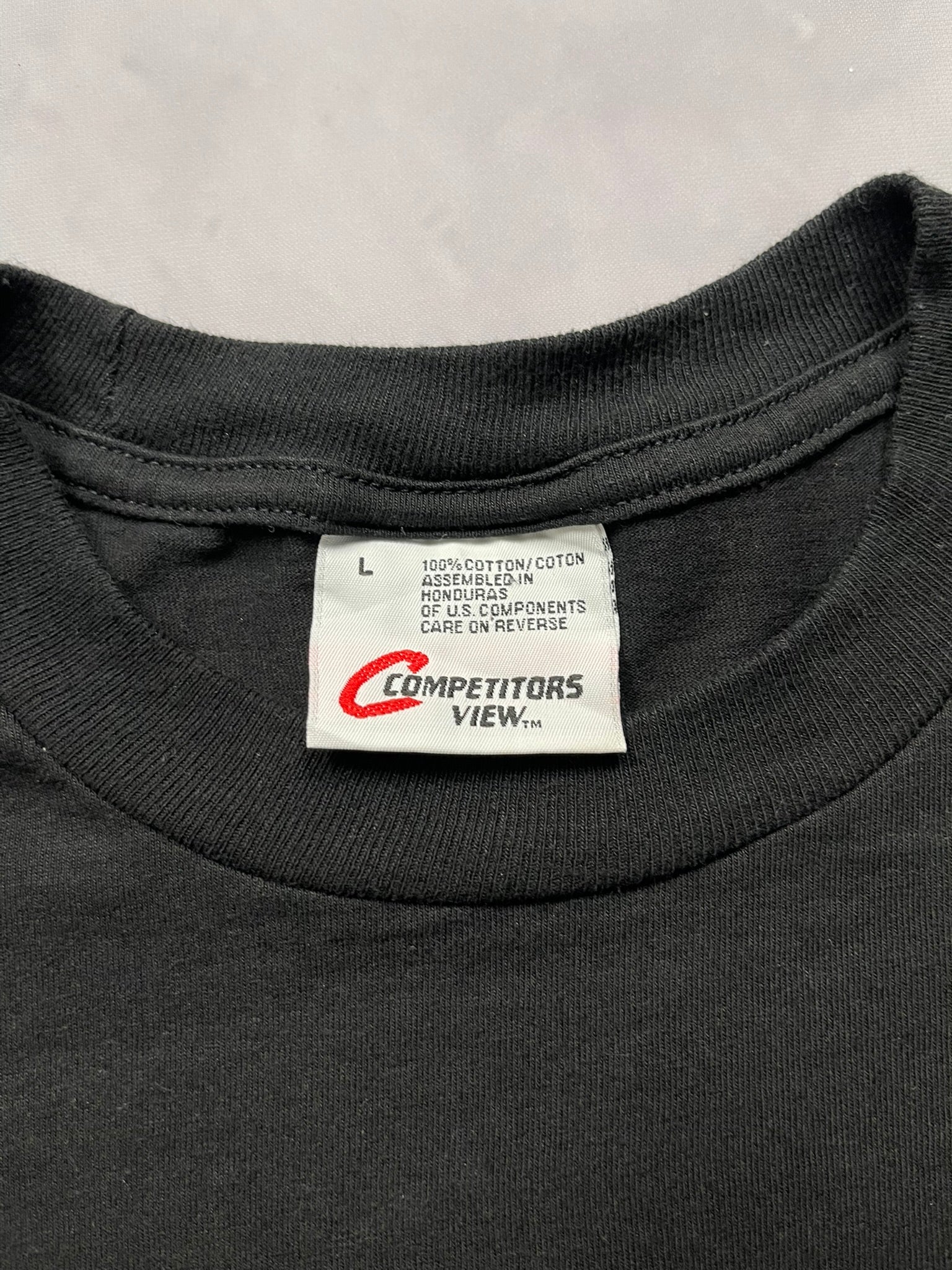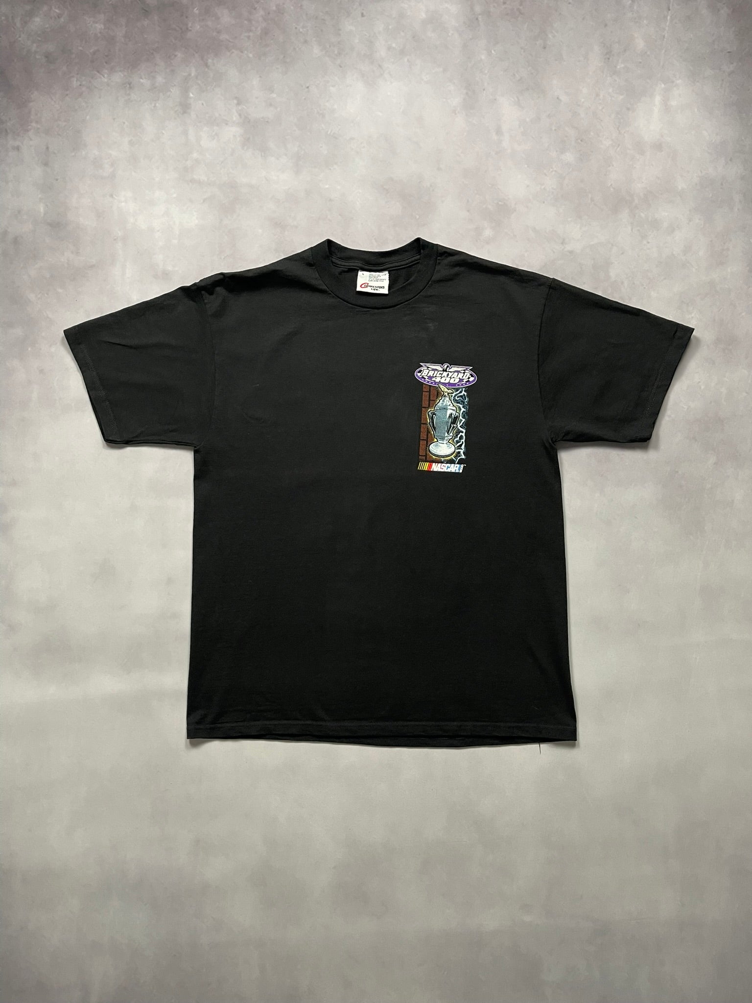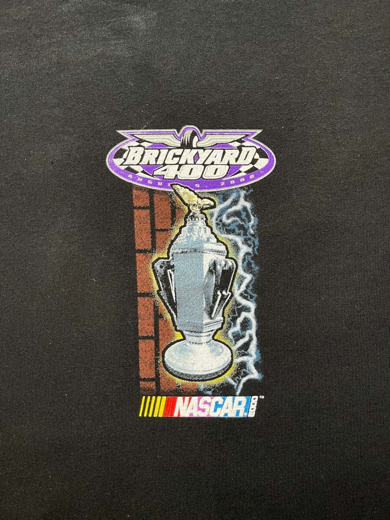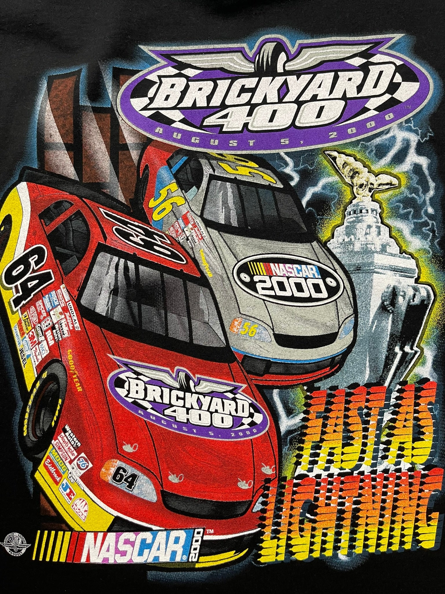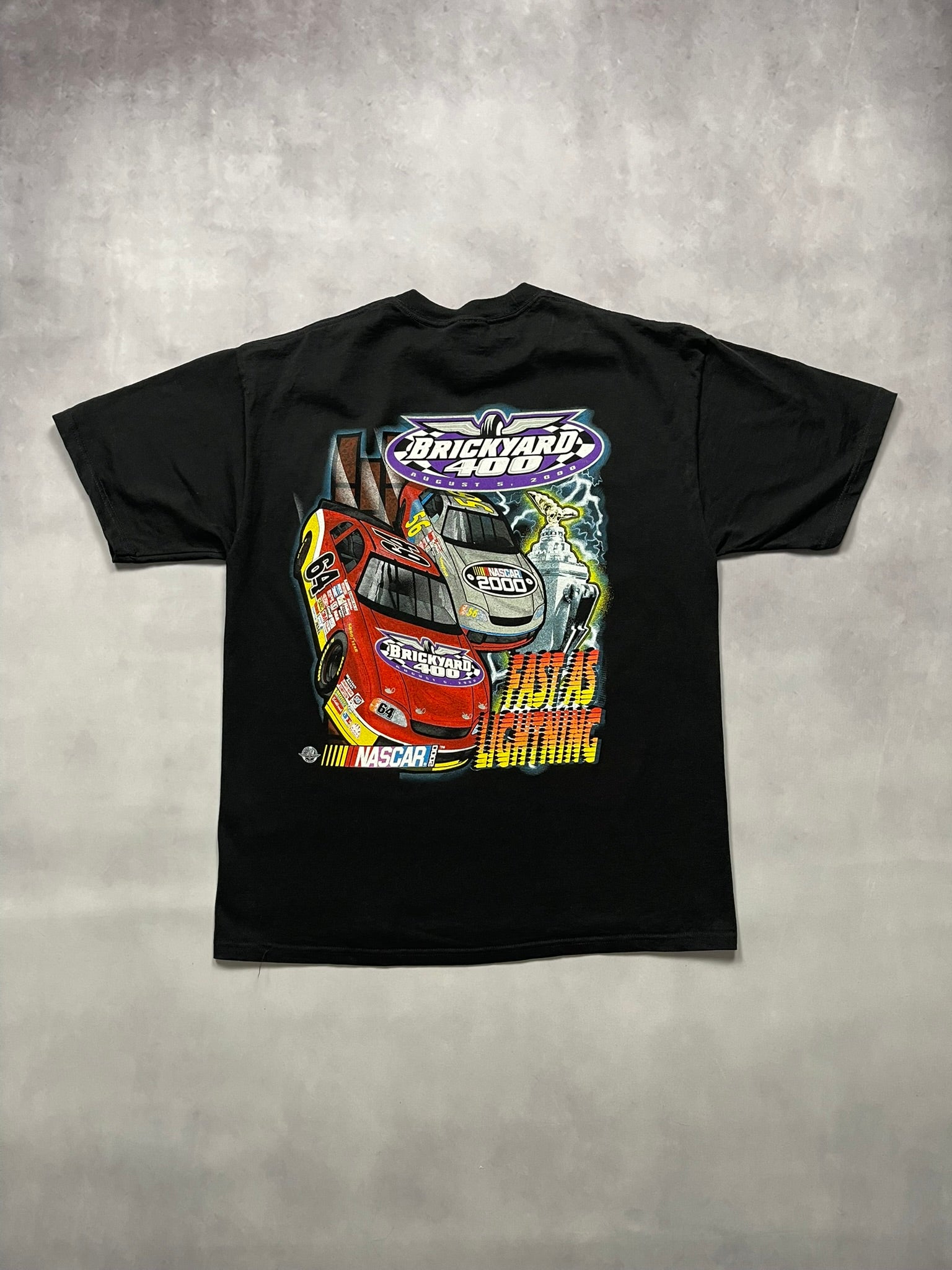 Y2K NASCAR heat with this 2000 Brickyard 400 racing tee, loaded with lightning bolts, checkered flags, and high-octane graphics. Double car print with “Fast As Lightning” type — a perfect grab for NASCAR 2000 collectors and motorsport heads. Tagged Competitors View.
