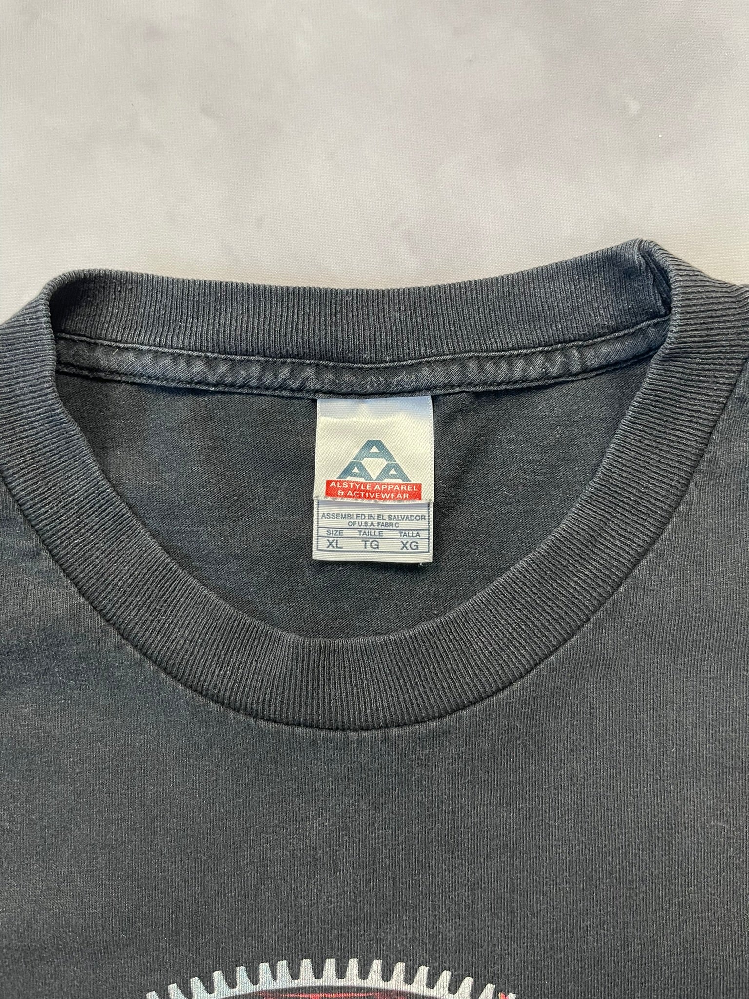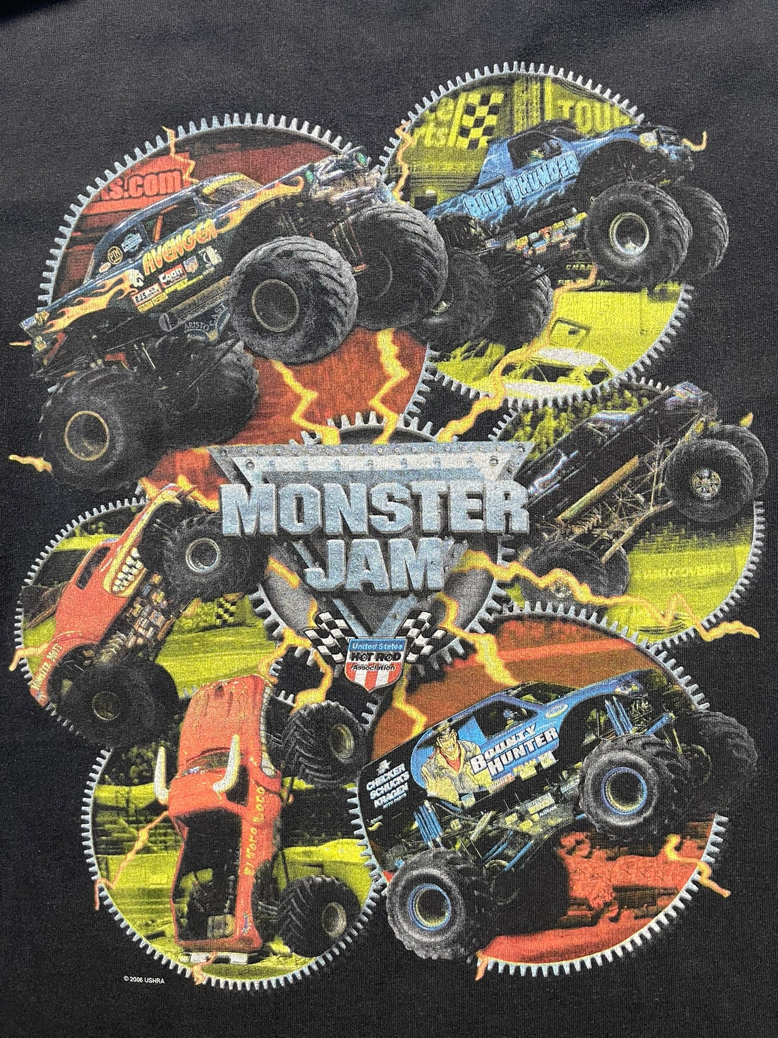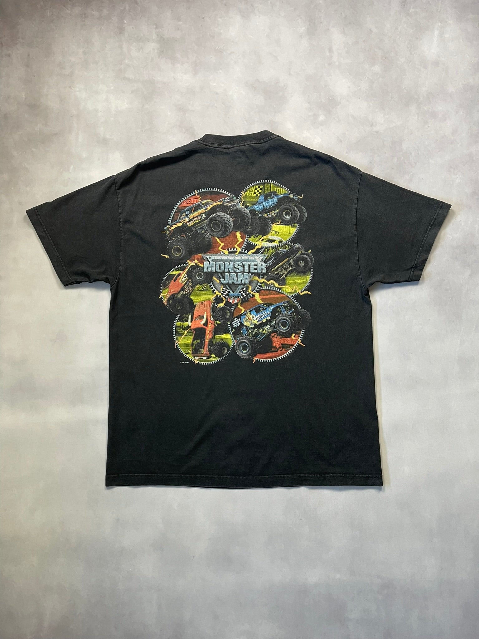 Monster truck madness from the 2000s — double-sided Monster Jam World Tour tee featuring Grave Digger, Avenger, Blue Thunder, and more legends of the dirt. Explosive all-over graphics with lightning bolts and gearwheel backdrops, packed with that high-octane stadium energy. Printed on a black Alstyle tag, nicely broken in with a soft fade. Killer grab for Monster Jam fans or early 2000s motorsport collectors.