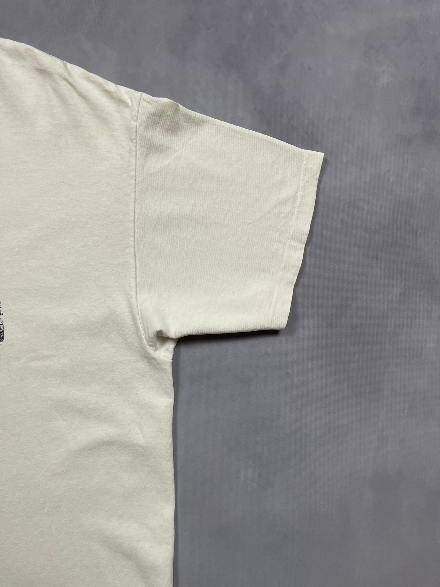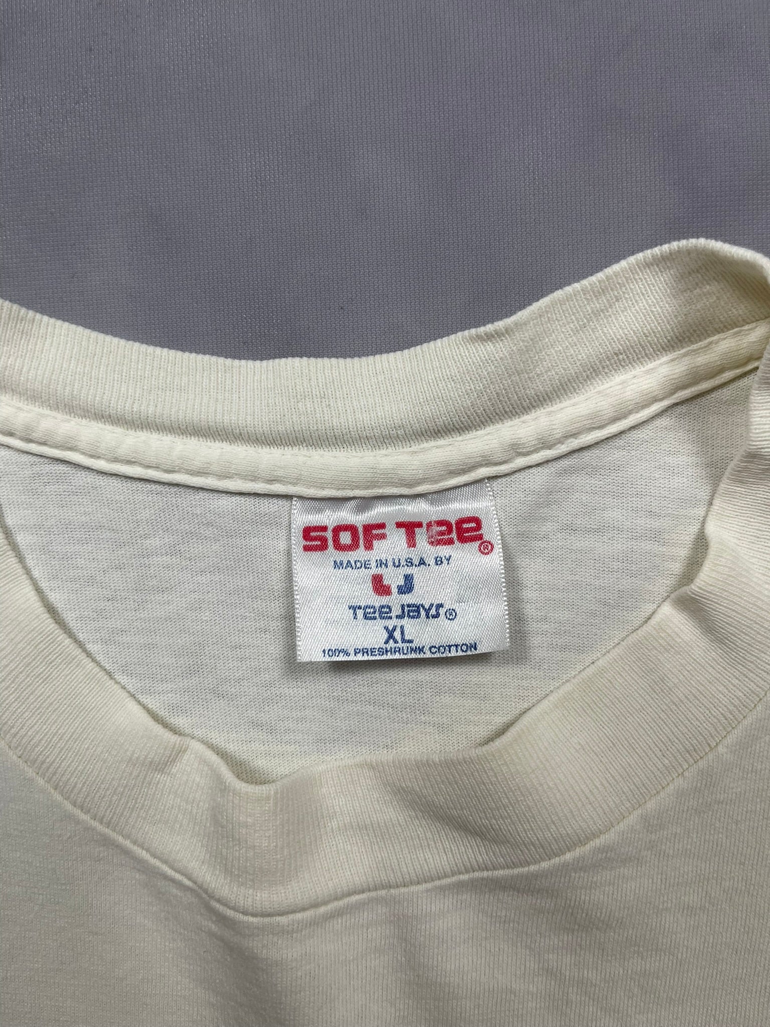 Late 80s “Cheers Boston” tee on an off-white Tee Jays Soft Tee tag, made in USA. Features a detailed black and red graphic of the iconic Beacon Street bar from the classic sitcom, printed on soft 100% preshrunk cotton. Clean single-sided print with that timeless late-80s souvenir energy and crisp screen texture. A perfect pickup for collectors of TV memorabilia and true vintage tees.