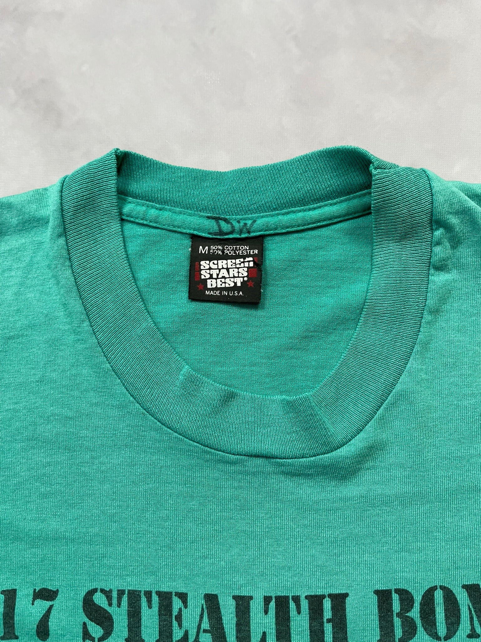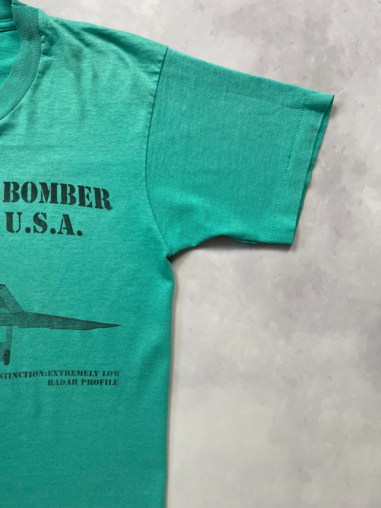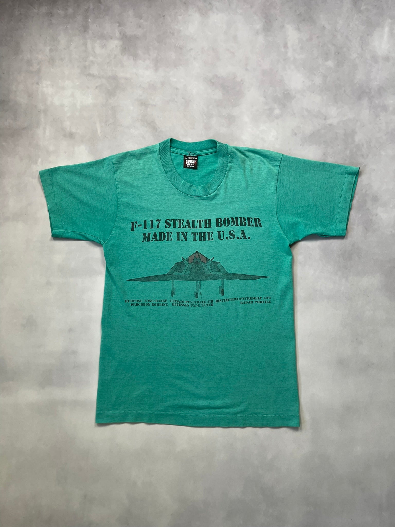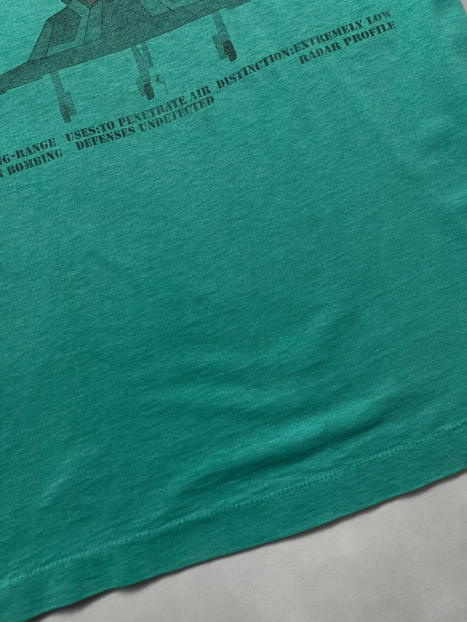 This vintage F-117 Stealth Bomber in aqua is a tagged size medium. (but do check measurements below)