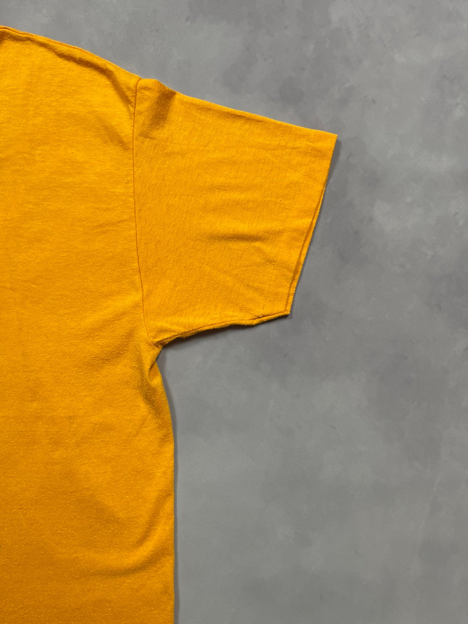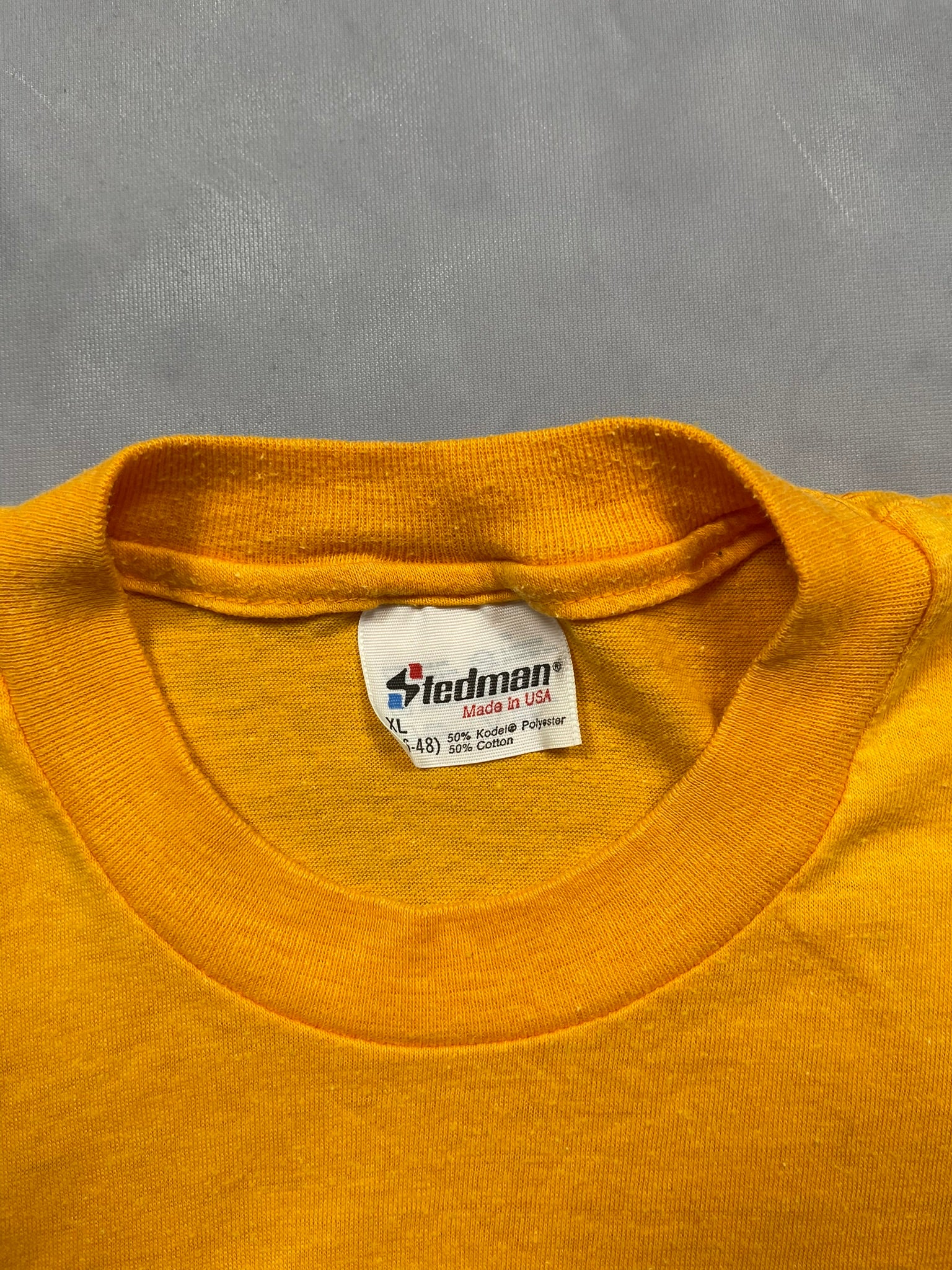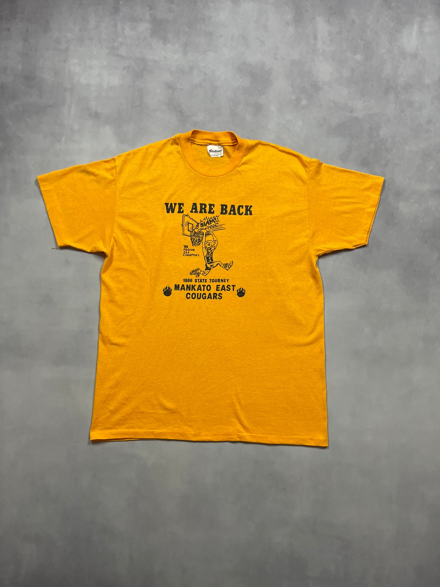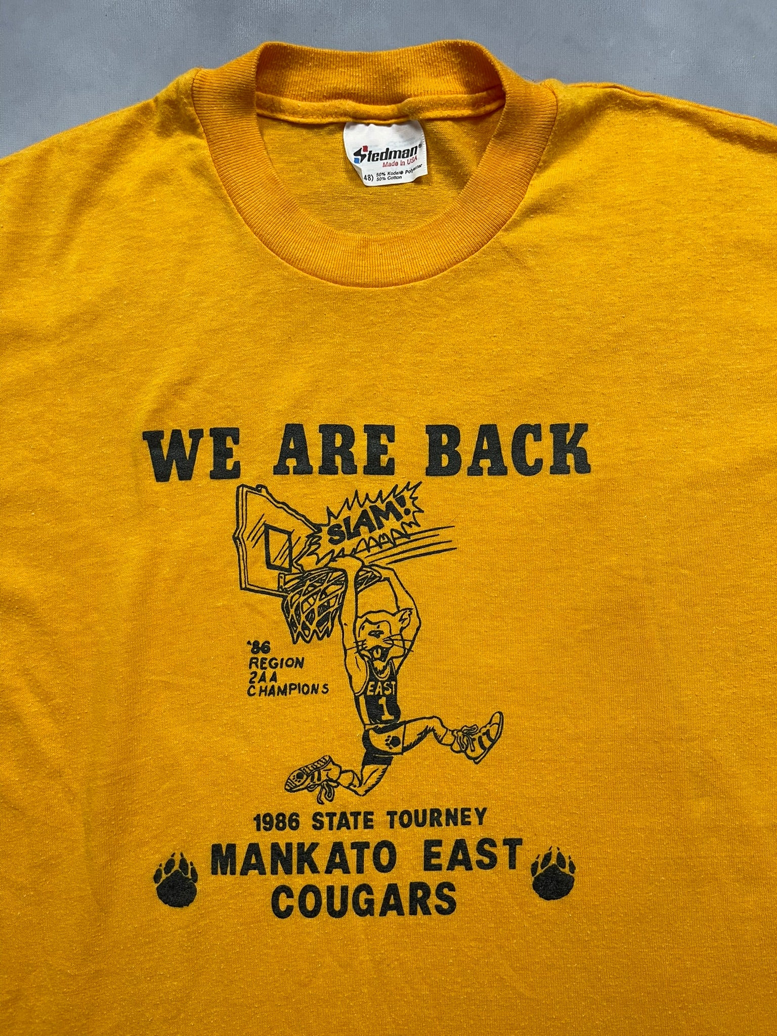 Vintage 1986 Mankato East Cougars State Tourney tee printed on a golden yellow Stedman tag, made in USA. Features a bold graphic of a wildcat dunking with “We Are Back” text and ‘86 Region 2A Champions shoutout. Soft 50/50 cotton/poly blend with a broken-in feel and perfect varsity energy. Some light pilling and minor wear near the hem adds character. Classic collectible for vintage sportswear heads or Minnesota locals.