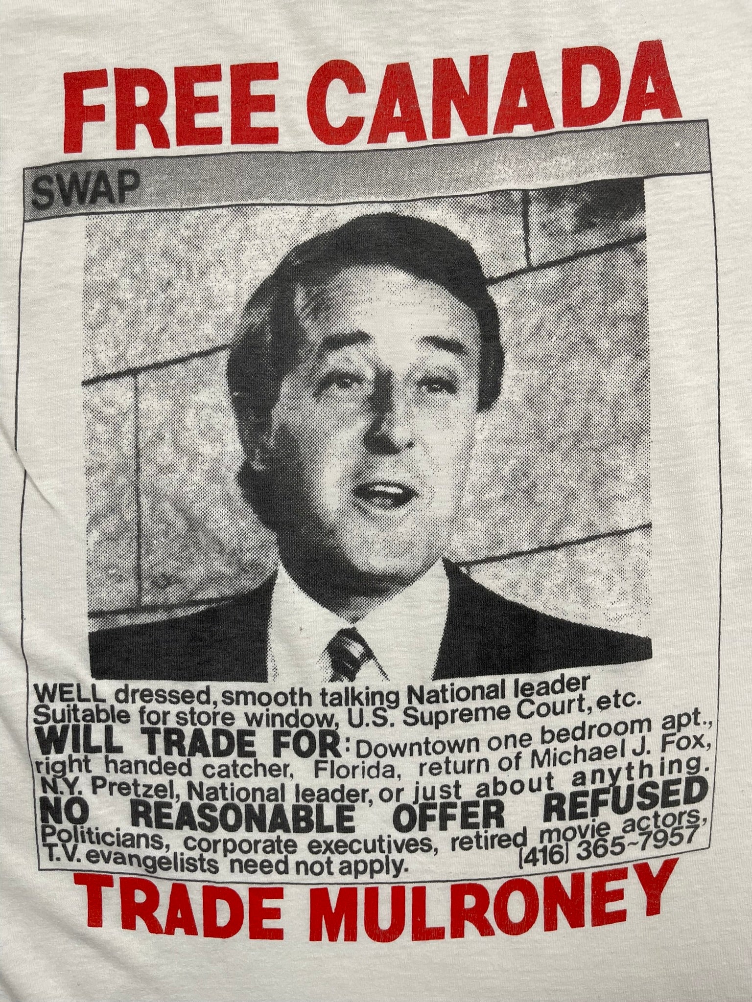 80s Rare “Free Canada / Trade Mulroney” political satire Single Stitch T-Shirt - XL