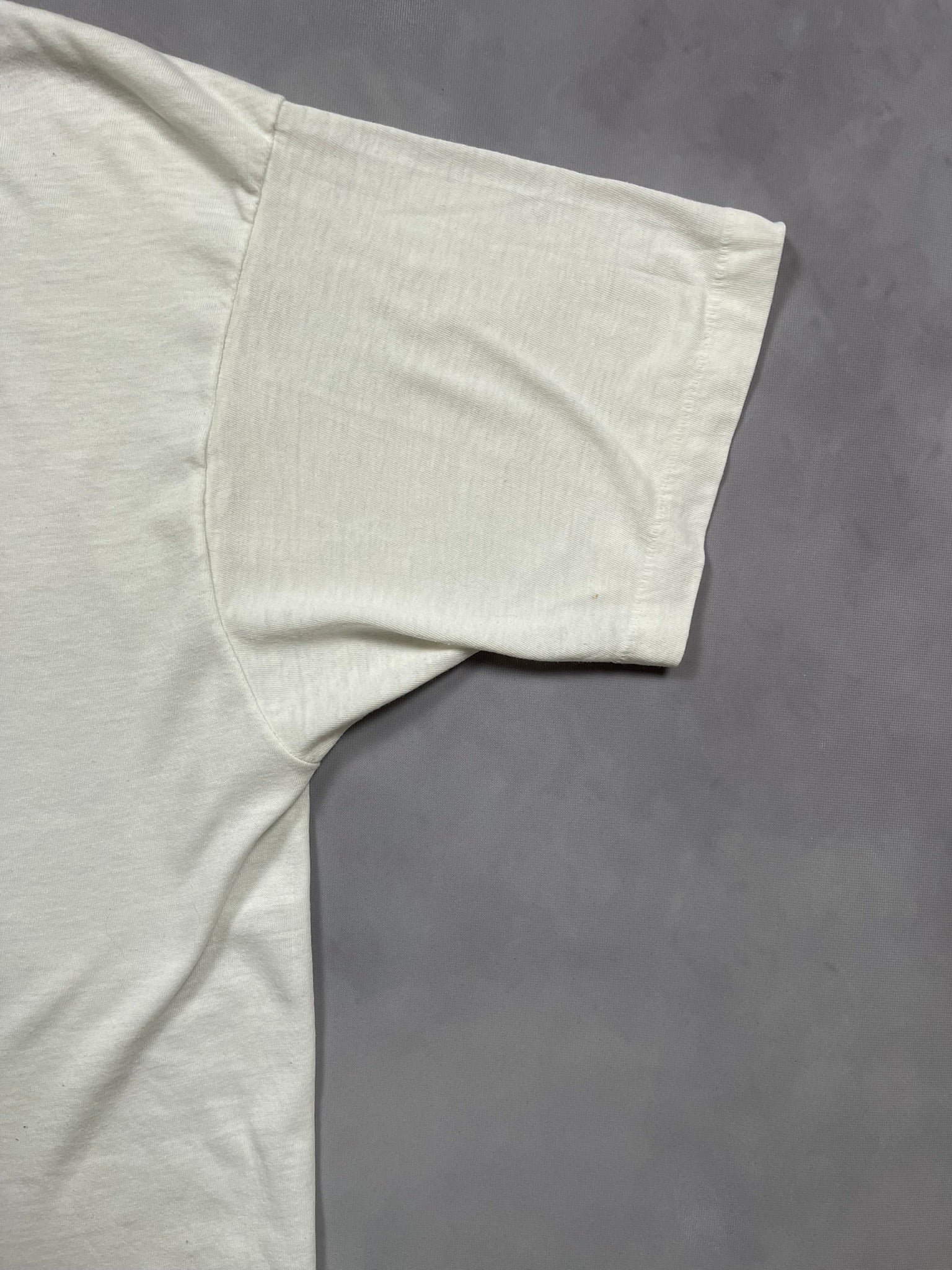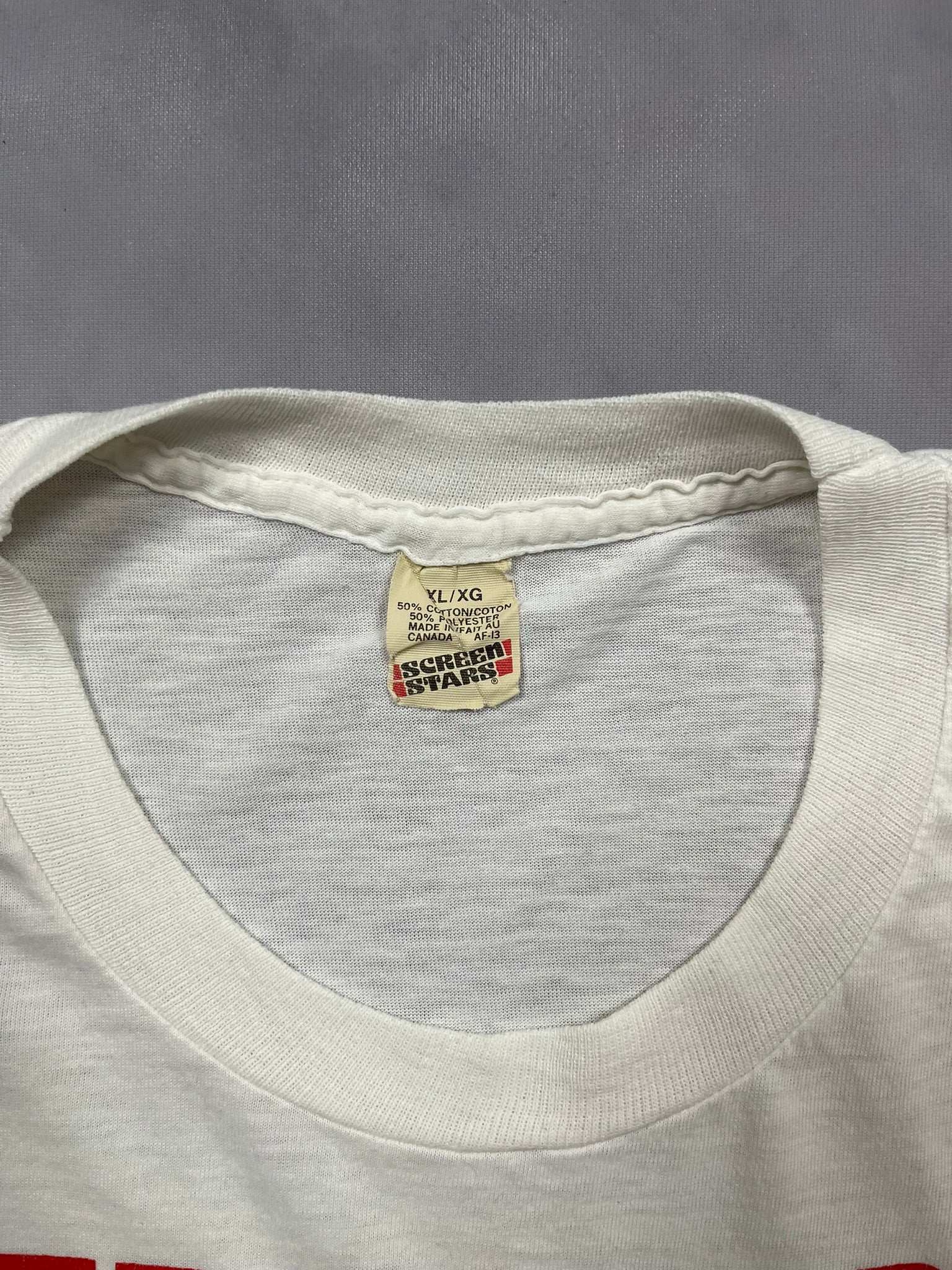 Rare 1980s “Free Canada / Trade Mulroney” political satire tee printed on a white Screen Stars tag, made in Canada. Features bold red and black newspaper-style print with humorous text mocking political leadership of the era. Super soft 50/50 cotton-poly blend with a vintage drape and light patina. An iconic piece of Canadian political protest history with true collector appeal.