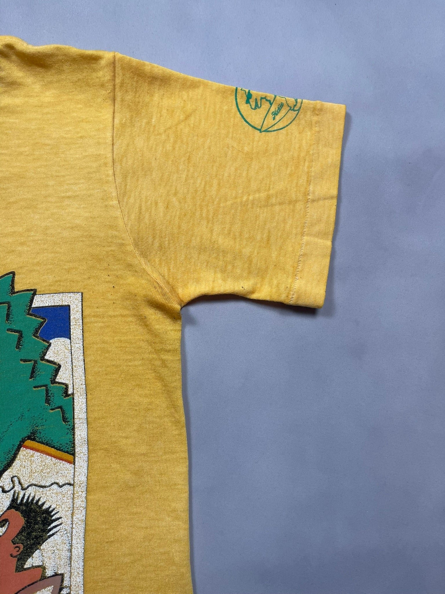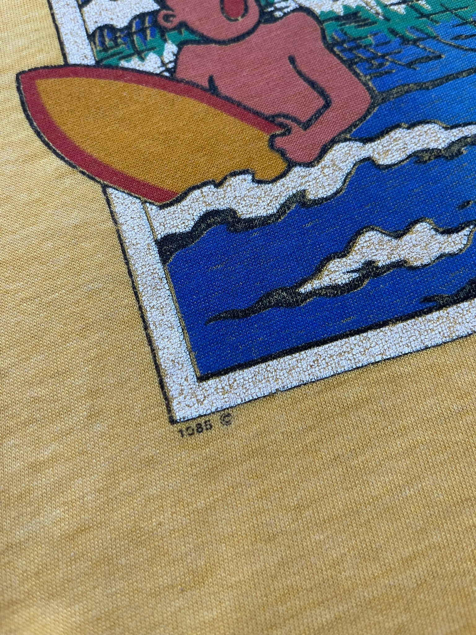 Wild 1985 “Surf Monster Attacks Coast Line” tee featuring a killer cartoon Godzilla on a Hobie board chasing stunned surfers. Printed on a buttery soft yellow blank with perfect 80s paper-thin wear and that classic cracked plastisol hit. You’ve got sleeve detail, bright comic book colors, and a hilarious California surf spoof graphic that screams vintage beachwear. A true early 80s single stitch tee with pop culture, novelty, and West Coast heritage in one rare piece.