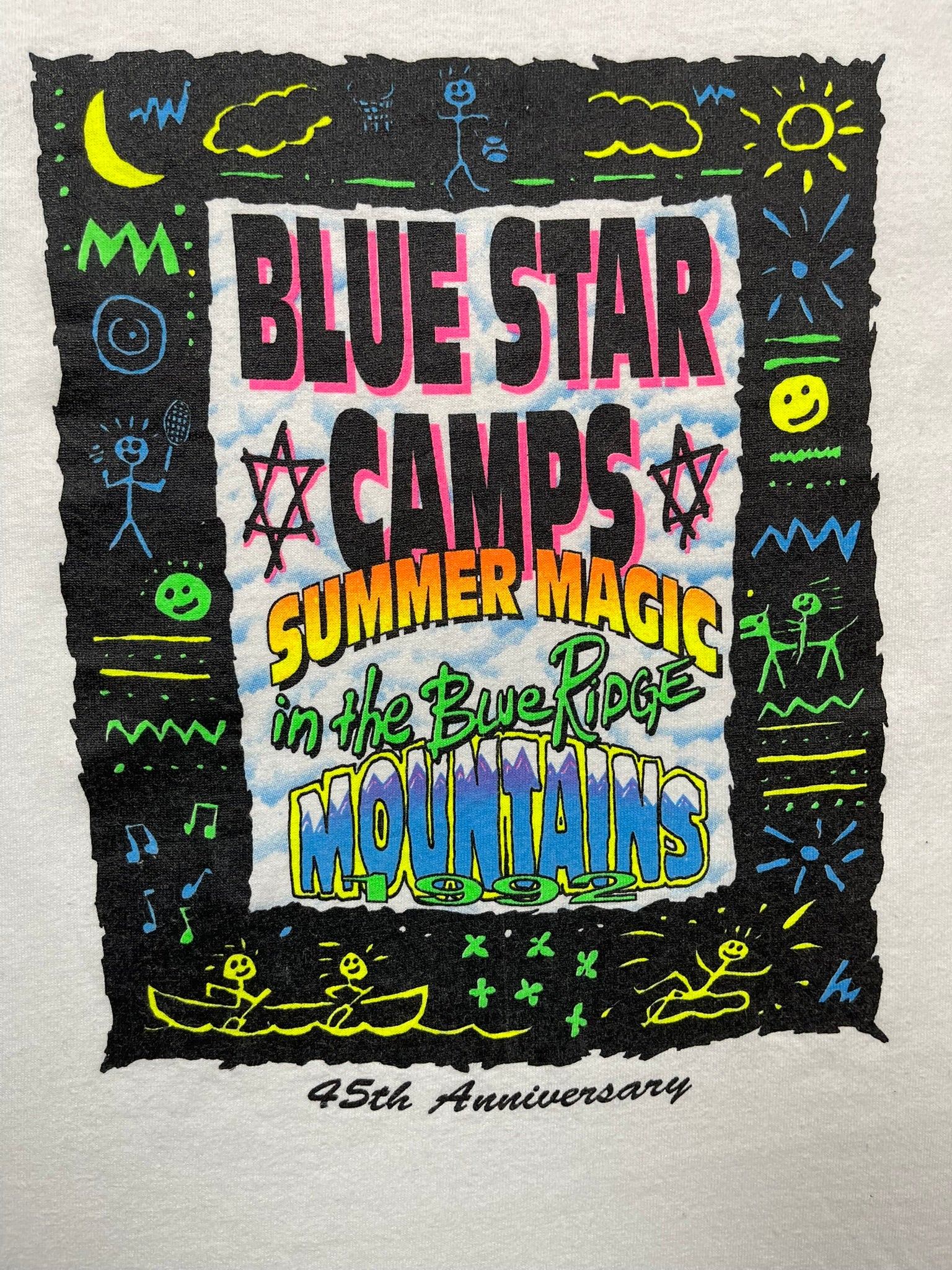 Vintage 1990s Blue Star Camps tee with a colorful "Summer Magic in the Blue Ridge Mountains" front hit celebrating the camp’s 45th anniversary. Printed on a Made in USA Fruit of the Loom tag, this shirt features a playful neon-style graphic that screams 90s summer camp energy. Soft and breathable 100% cotton, single stitch all around. Ideal for collectors, nostalgic camp heads, or anyone into bold retro prints and true vintage blanks.
