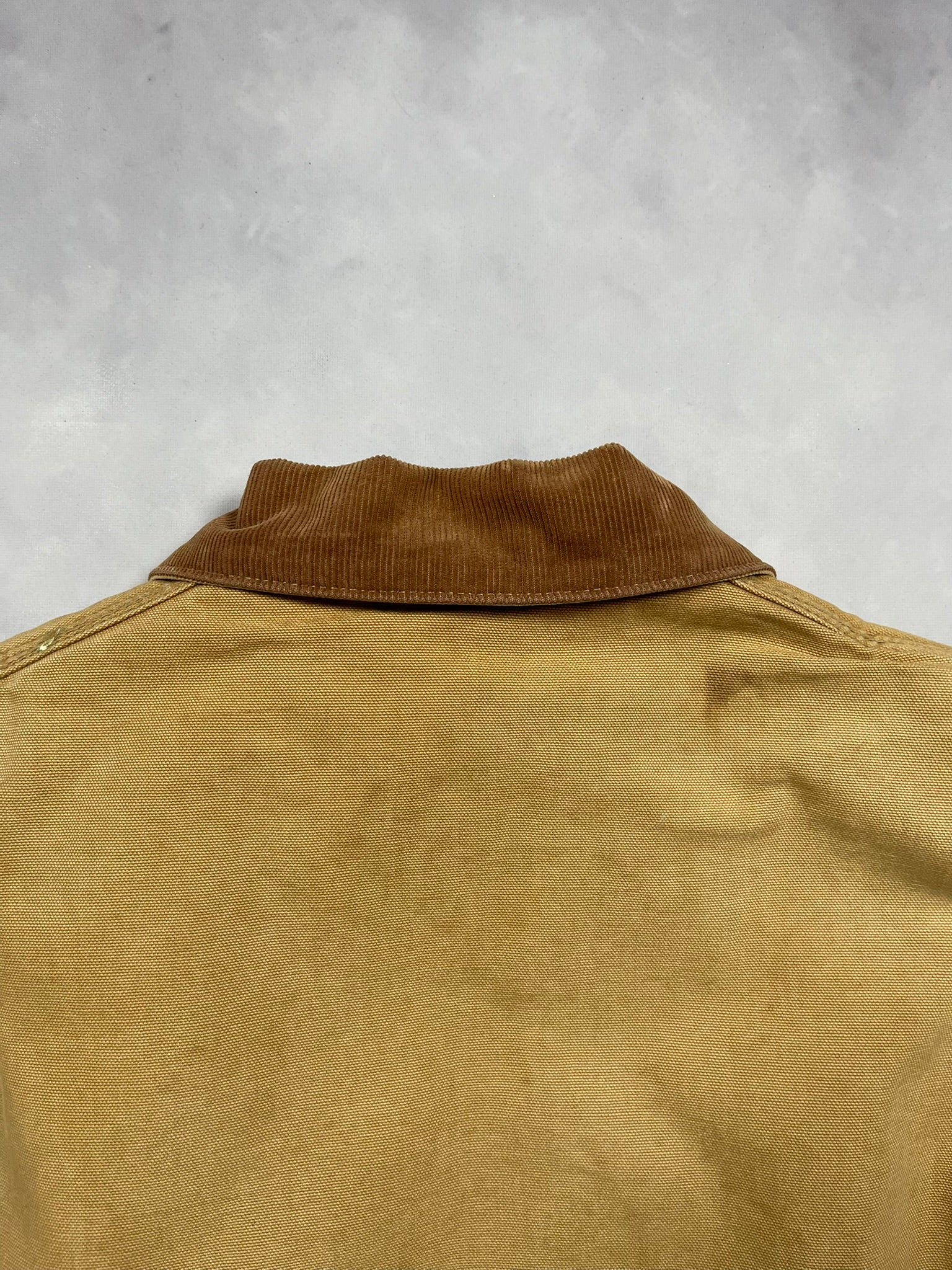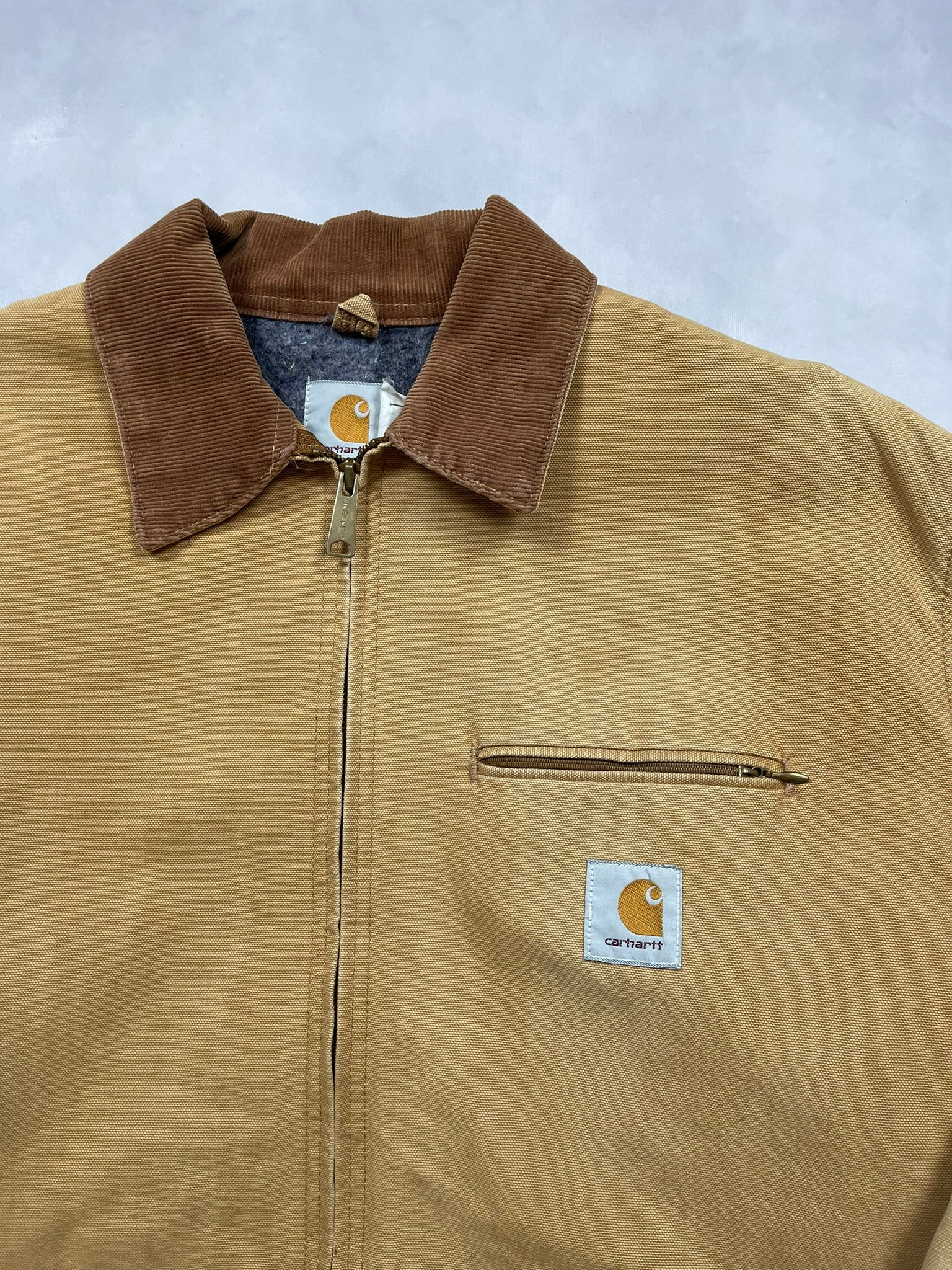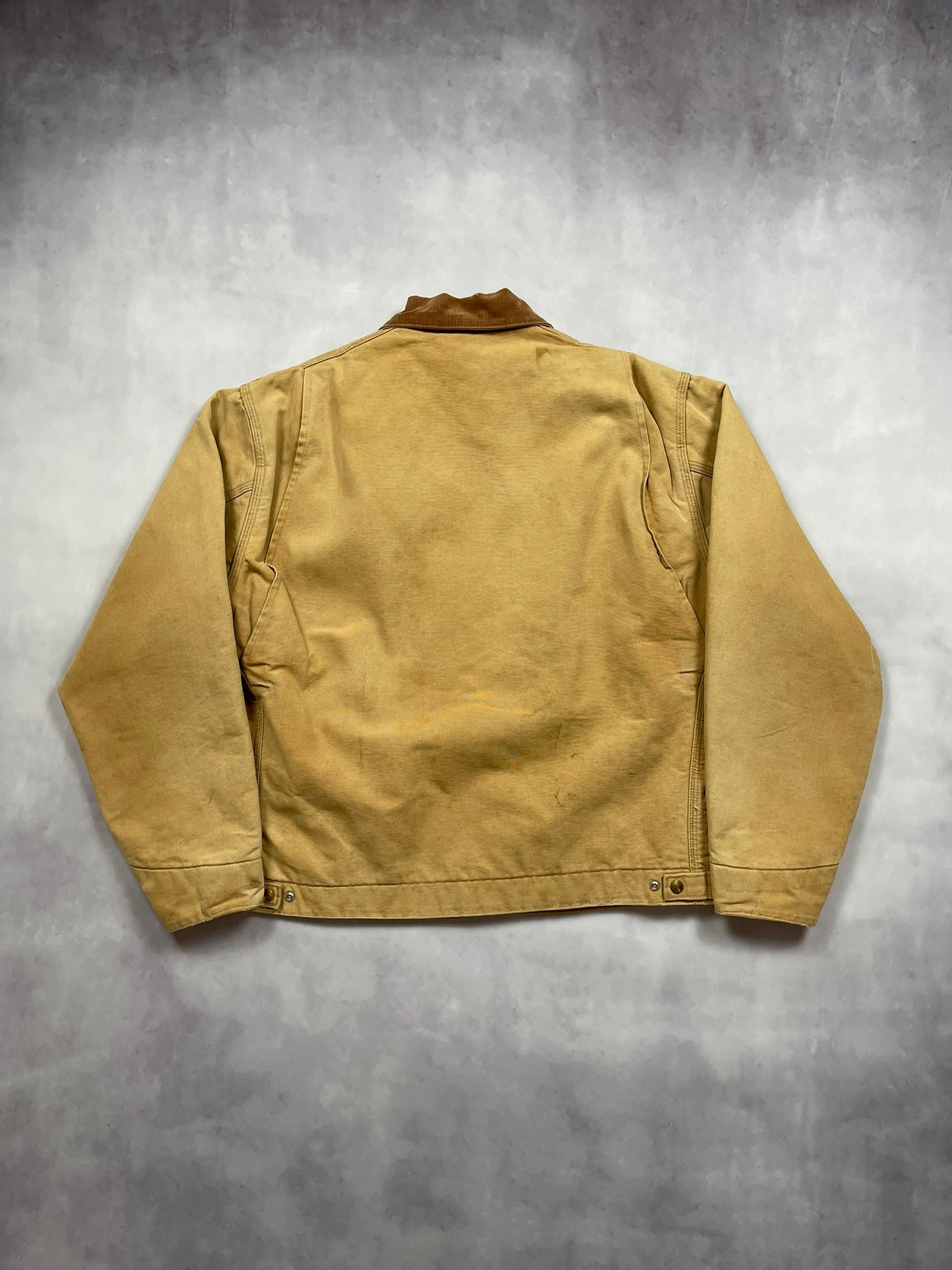 OG Detroit cut in a timeless tan duck canvas with contrast brown corduroy collar. Heavy blanket lining, faded sleeves, and subtle scuffs give it that authentic vintage patina. Faded tag, but from the '90s and 99% sure made in USA with the old-school Carhartt patch—rugged, real-deal Americana.