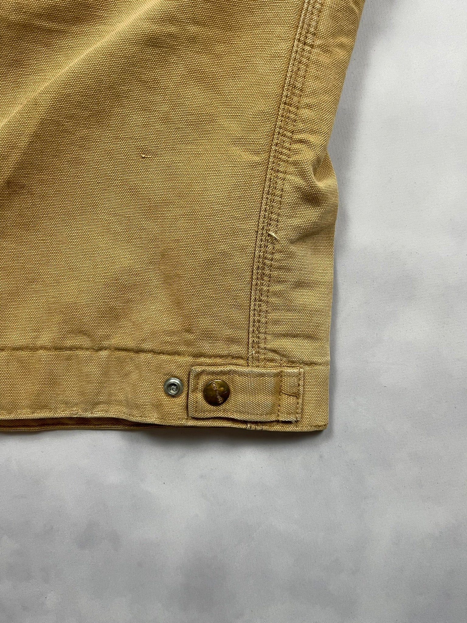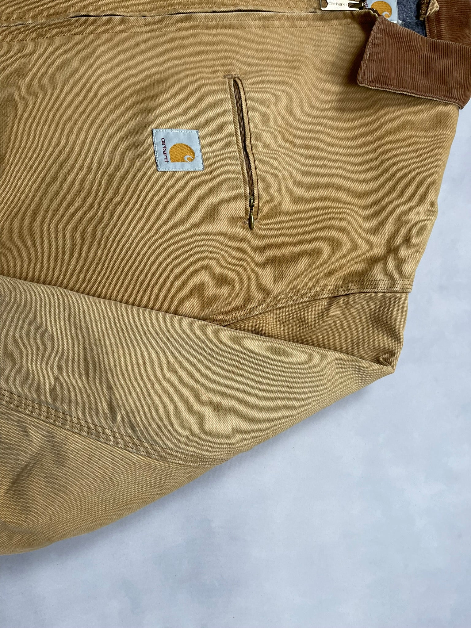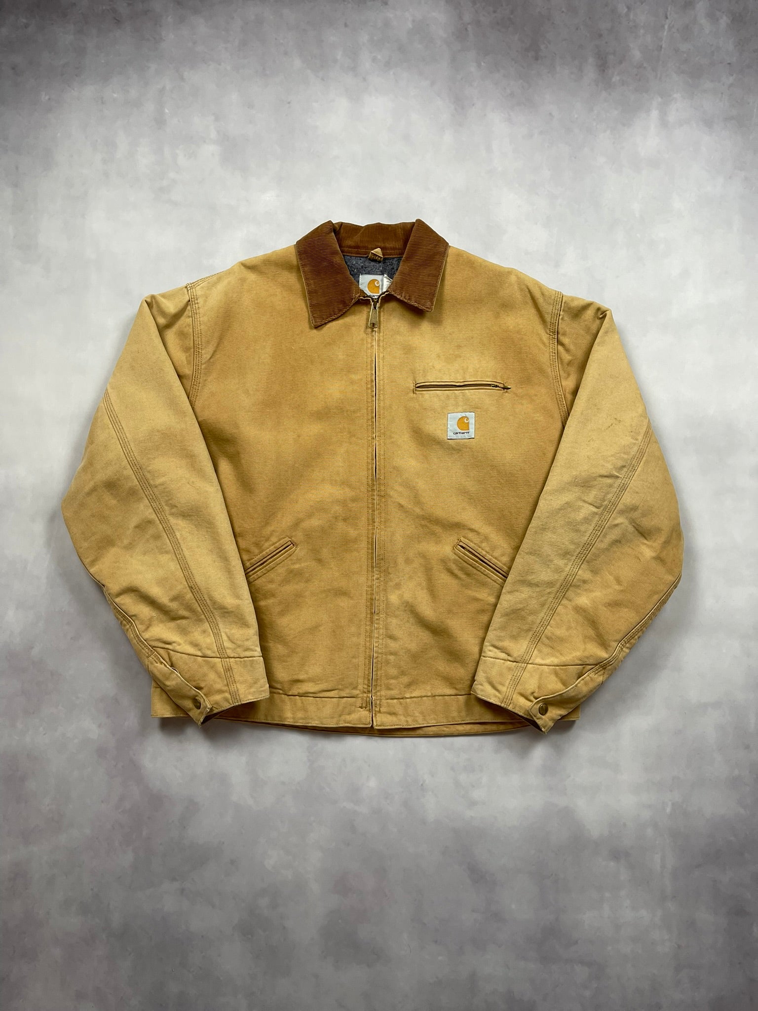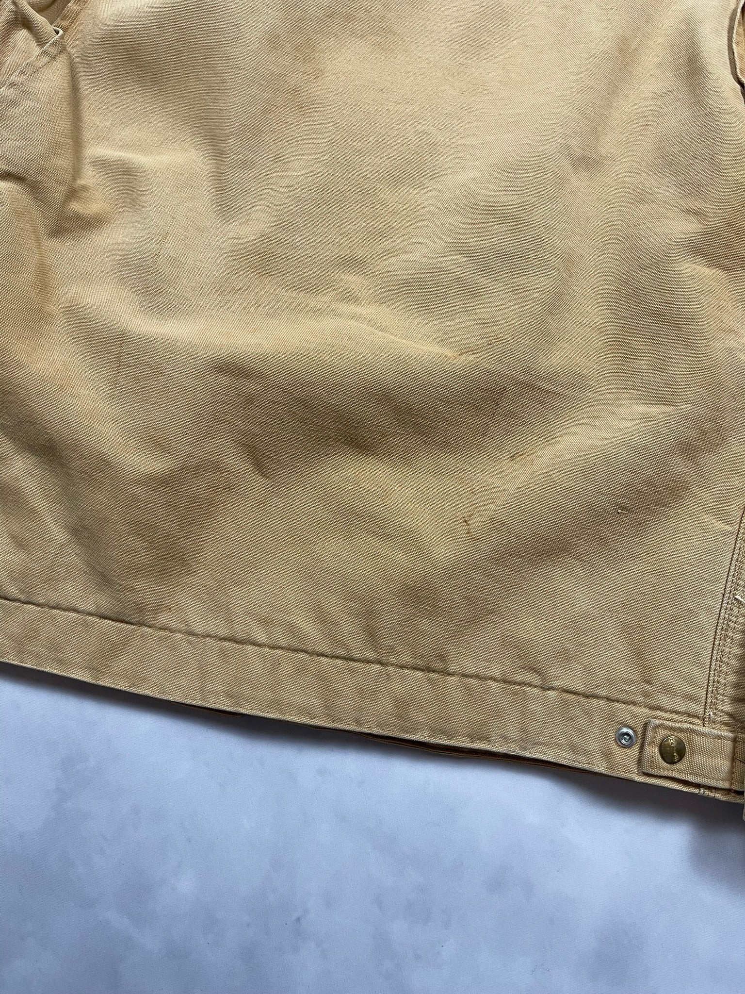 OG Detroit cut in a timeless tan duck canvas with contrast brown corduroy collar. Heavy blanket lining, faded sleeves, and subtle scuffs give it that authentic vintage patina. Faded tag, but from the '90s and 99% sure made in USA with the old-school Carhartt patch—rugged, real-deal Americana.