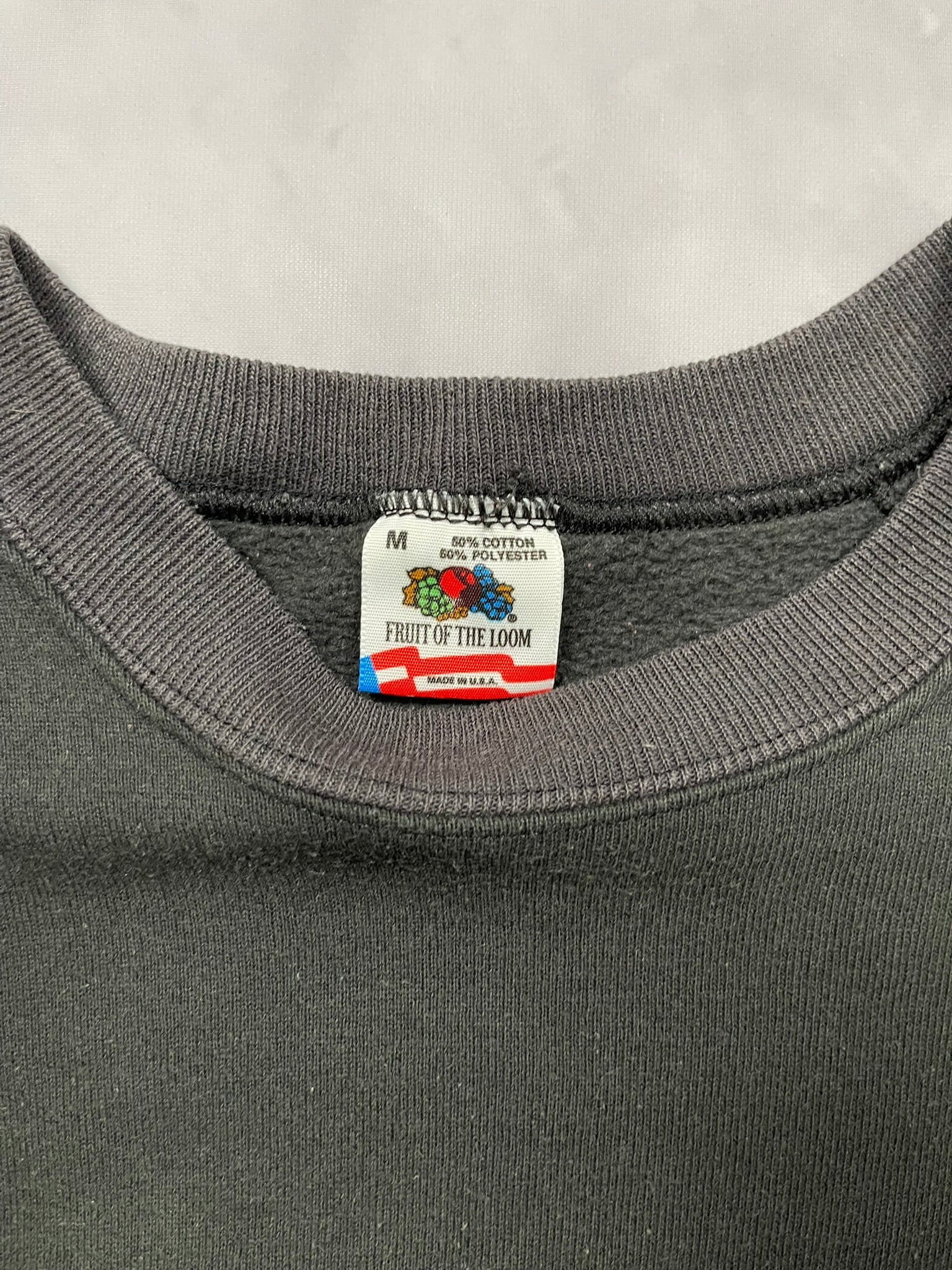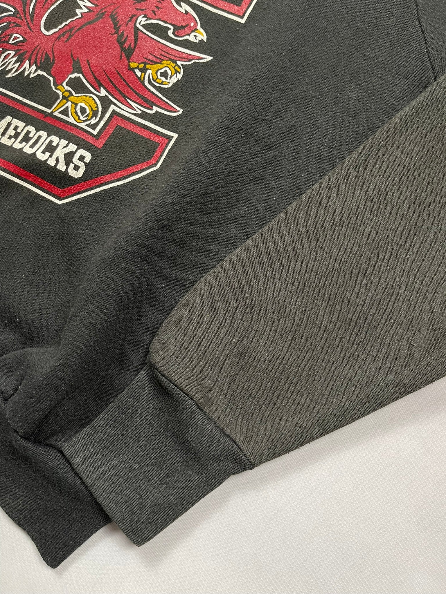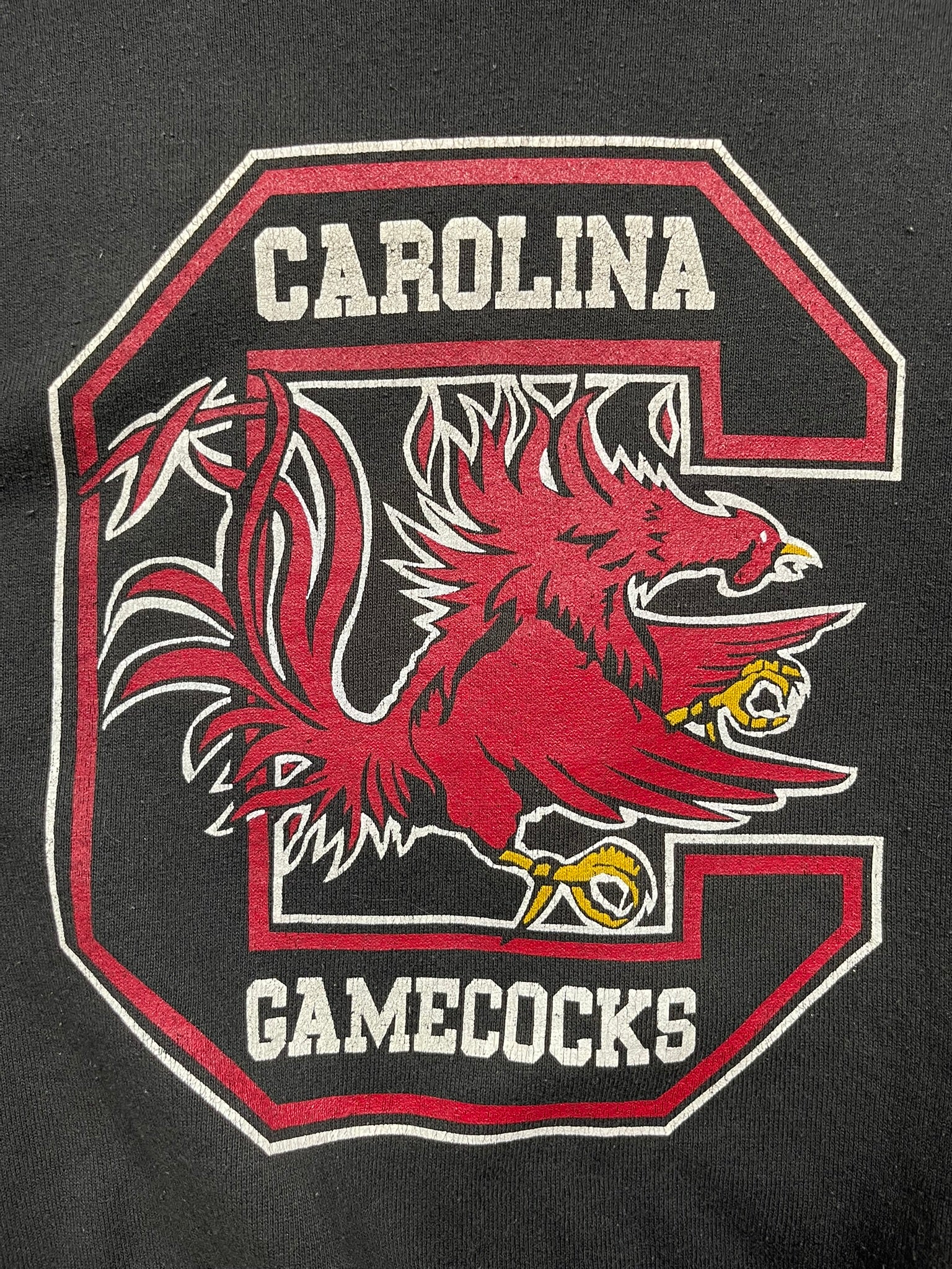 Early 90s South Carolina Gamecocks crewneck on a faded black Fruit of the Loom sweater, made in USA. Bold front graphic with the classic Gamecock mascot and varsity block “C” — a staple piece of vintage NCAA college sportswear. Raglan sleeves and sun-faded tone shifts throughout give it a naturally worn, two-tone look. Great pickup for collectors of 90s university sweatshirts or South Carolina fans chasing that old-school heat.