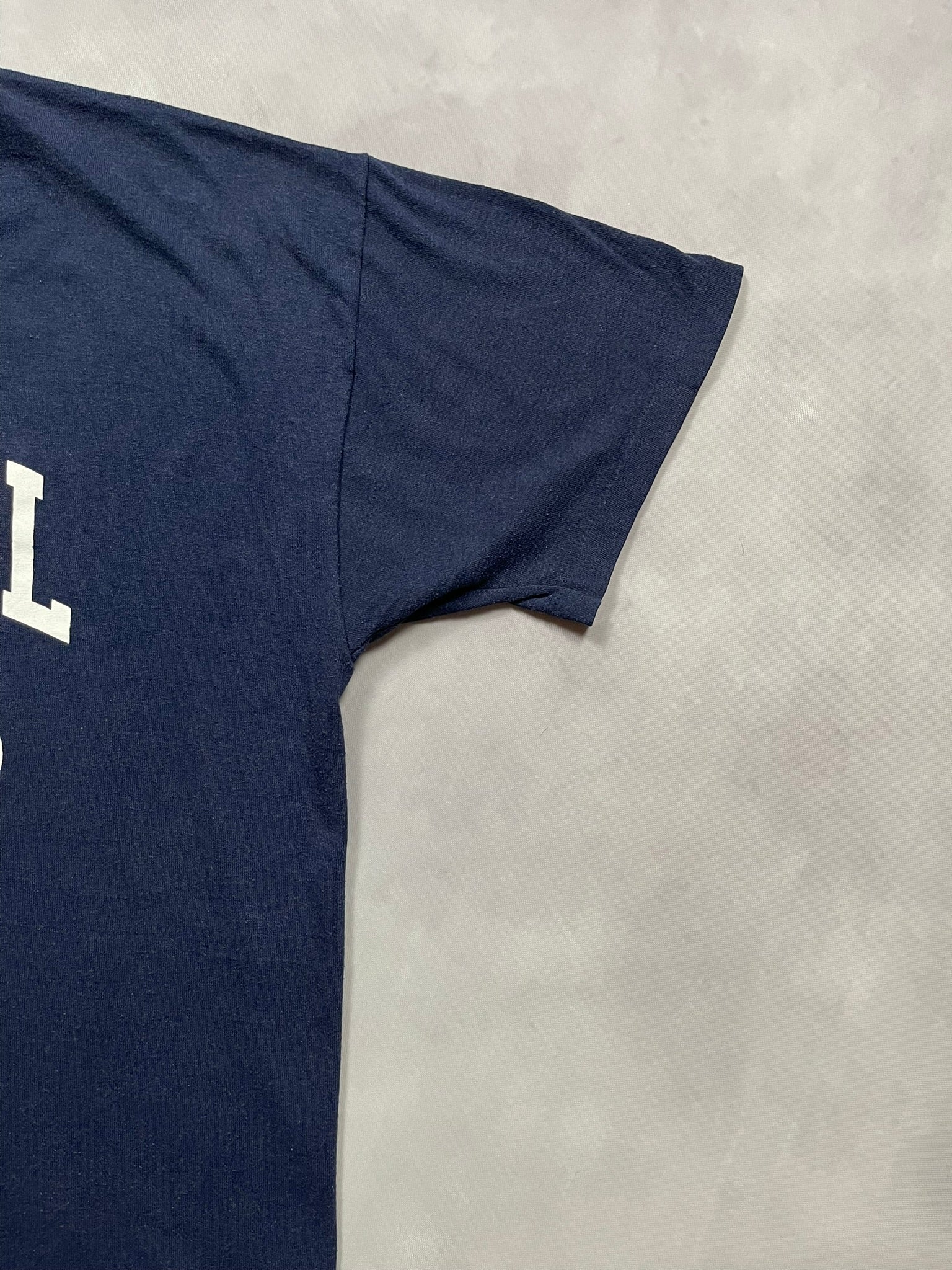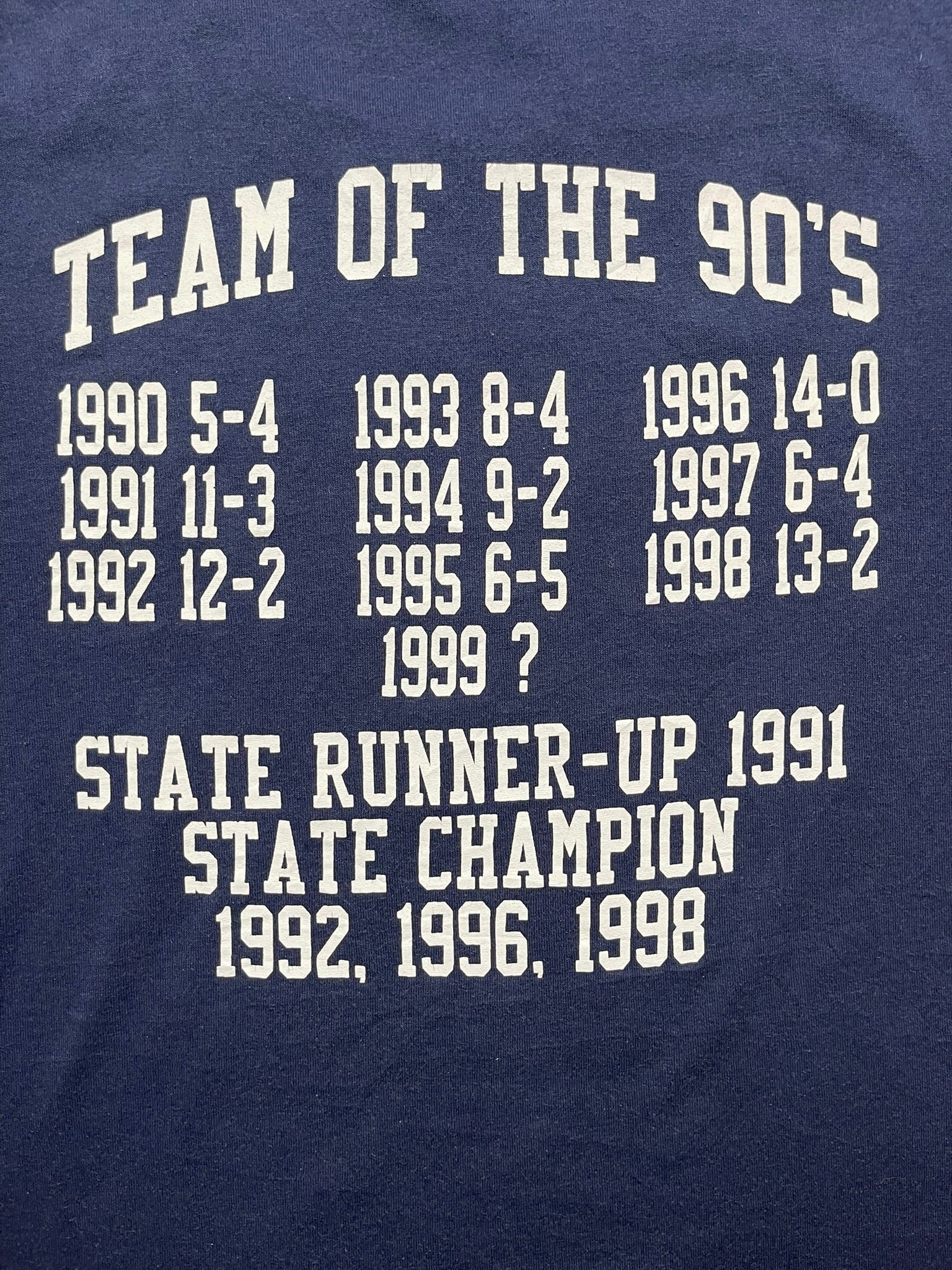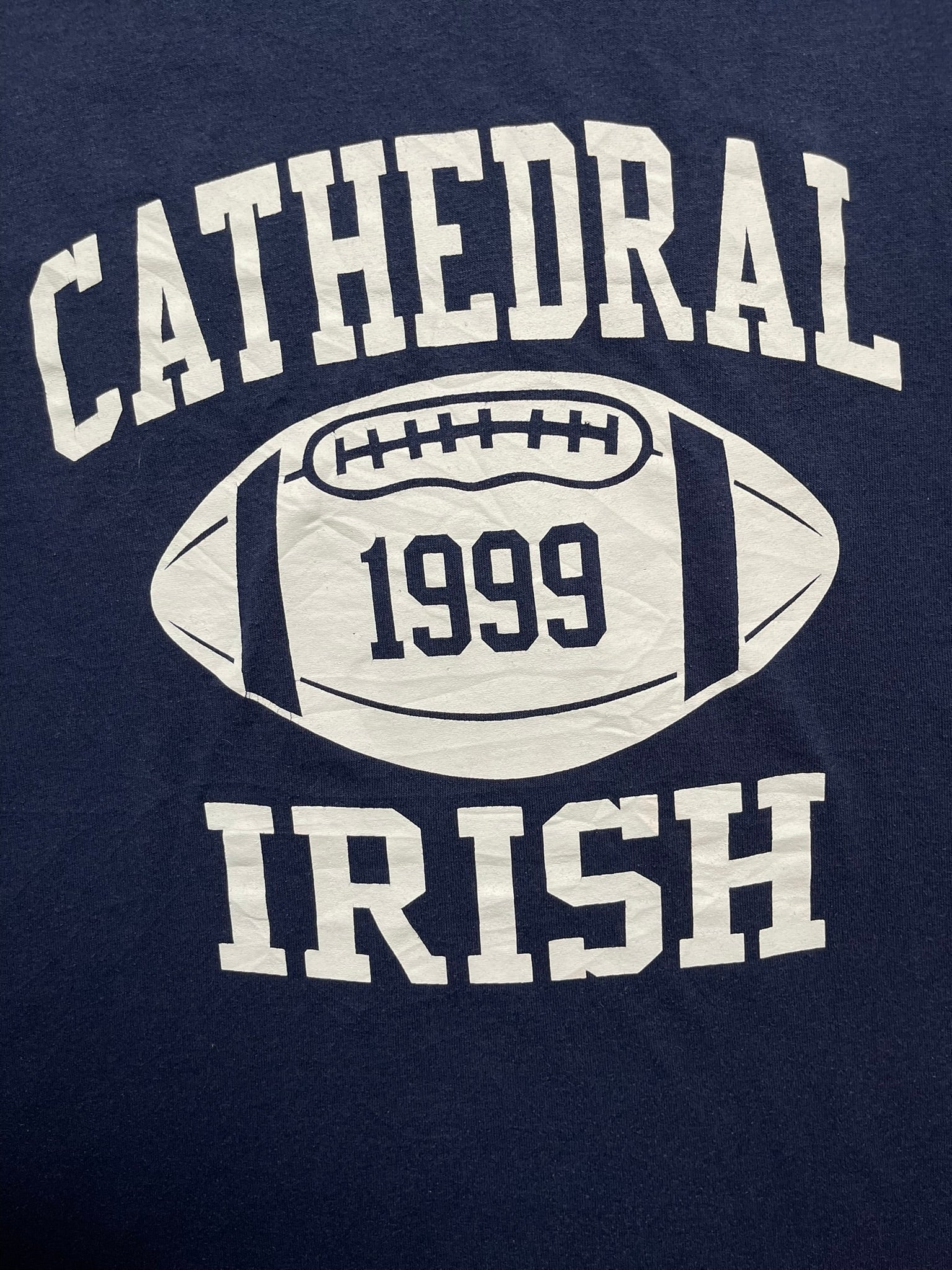 1999 Cathedral Irish football tee on a deep navy Russell Athletic, made in USA. Front hit features bold collegiate-style print inside a football, with the back listing every season record of the 90s plus state titles in 1992, 1996, and 1998. Heavy cotton with soft wear and boxy proportions from that late 90s athletic cut. Solid piece for sportswear heads or anyone chasing that true team-issued energy.