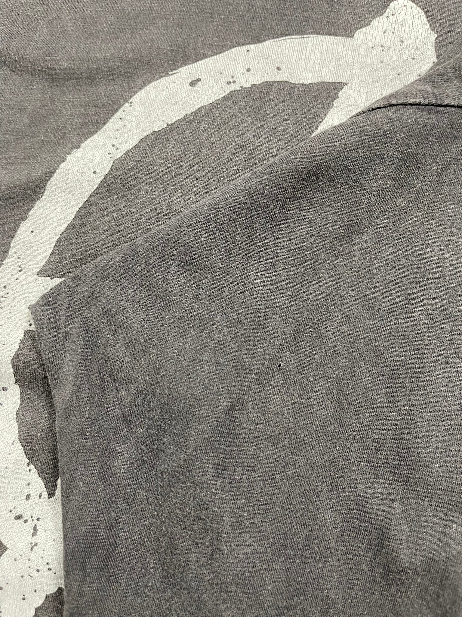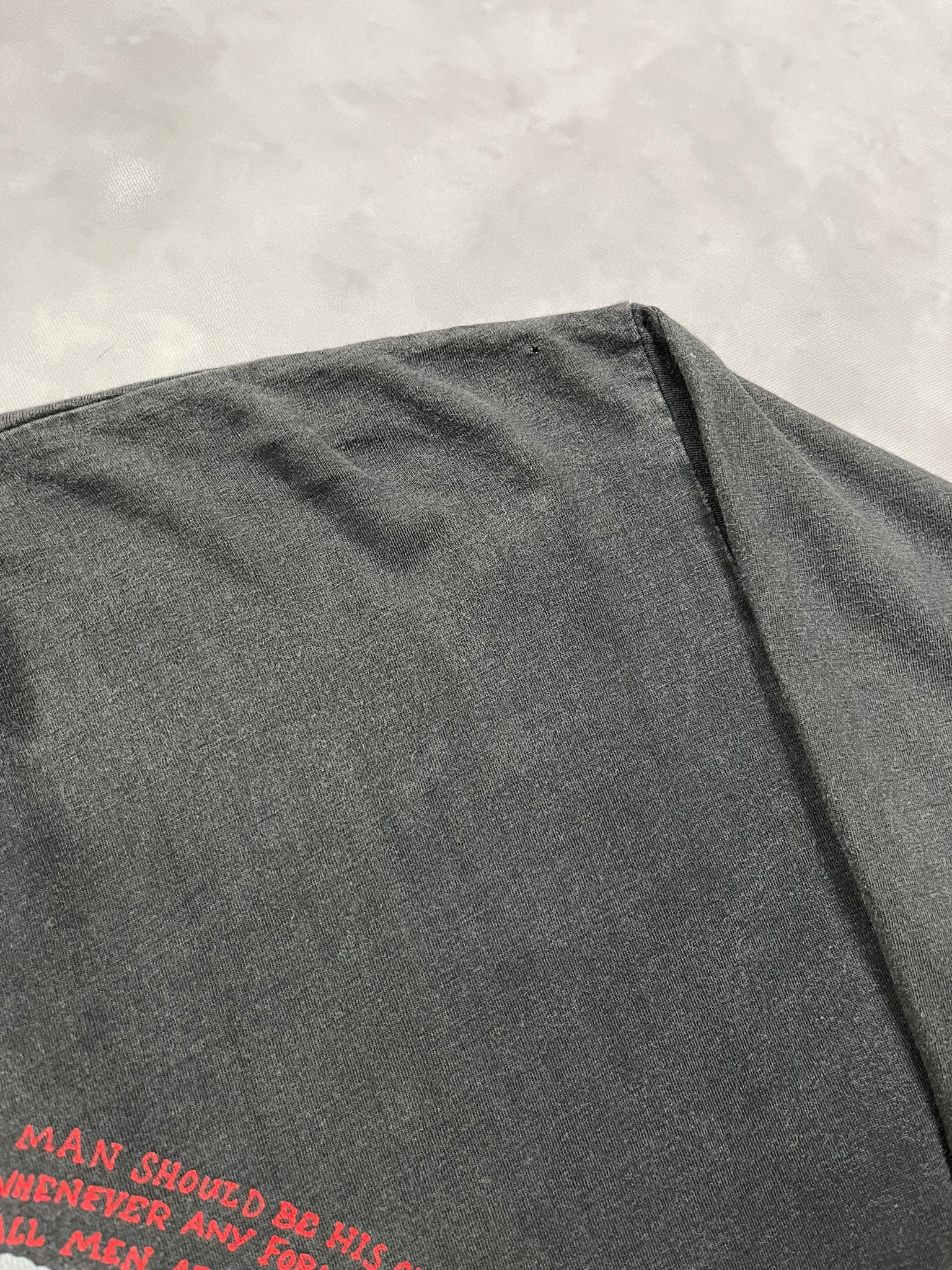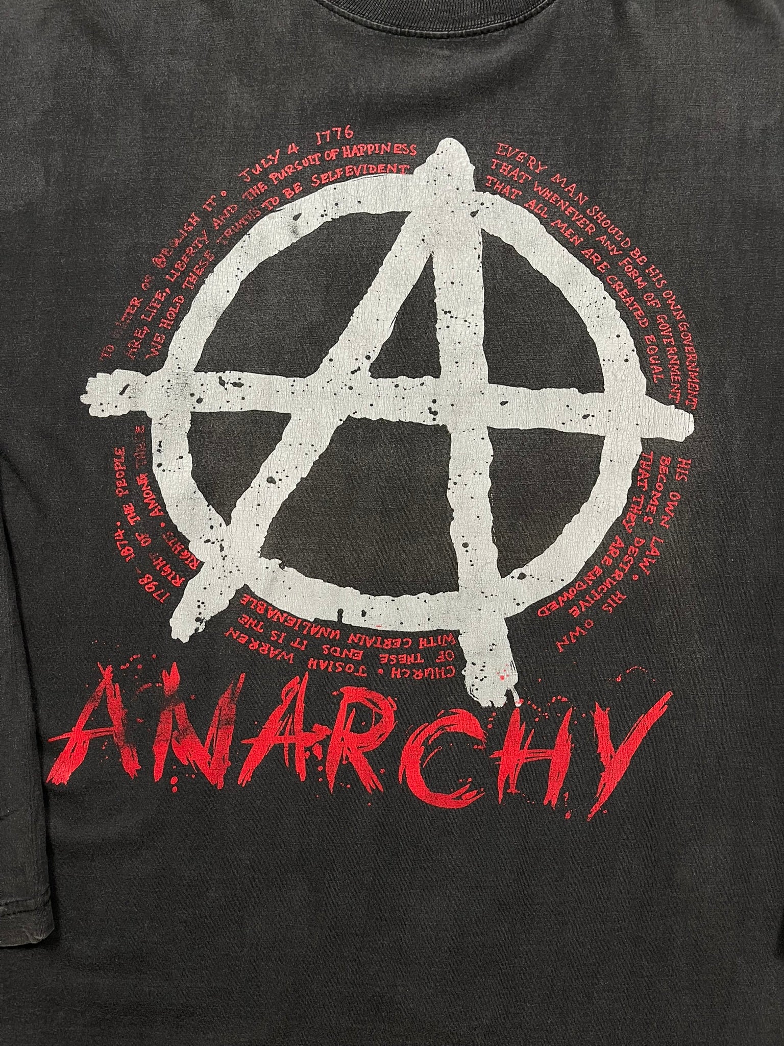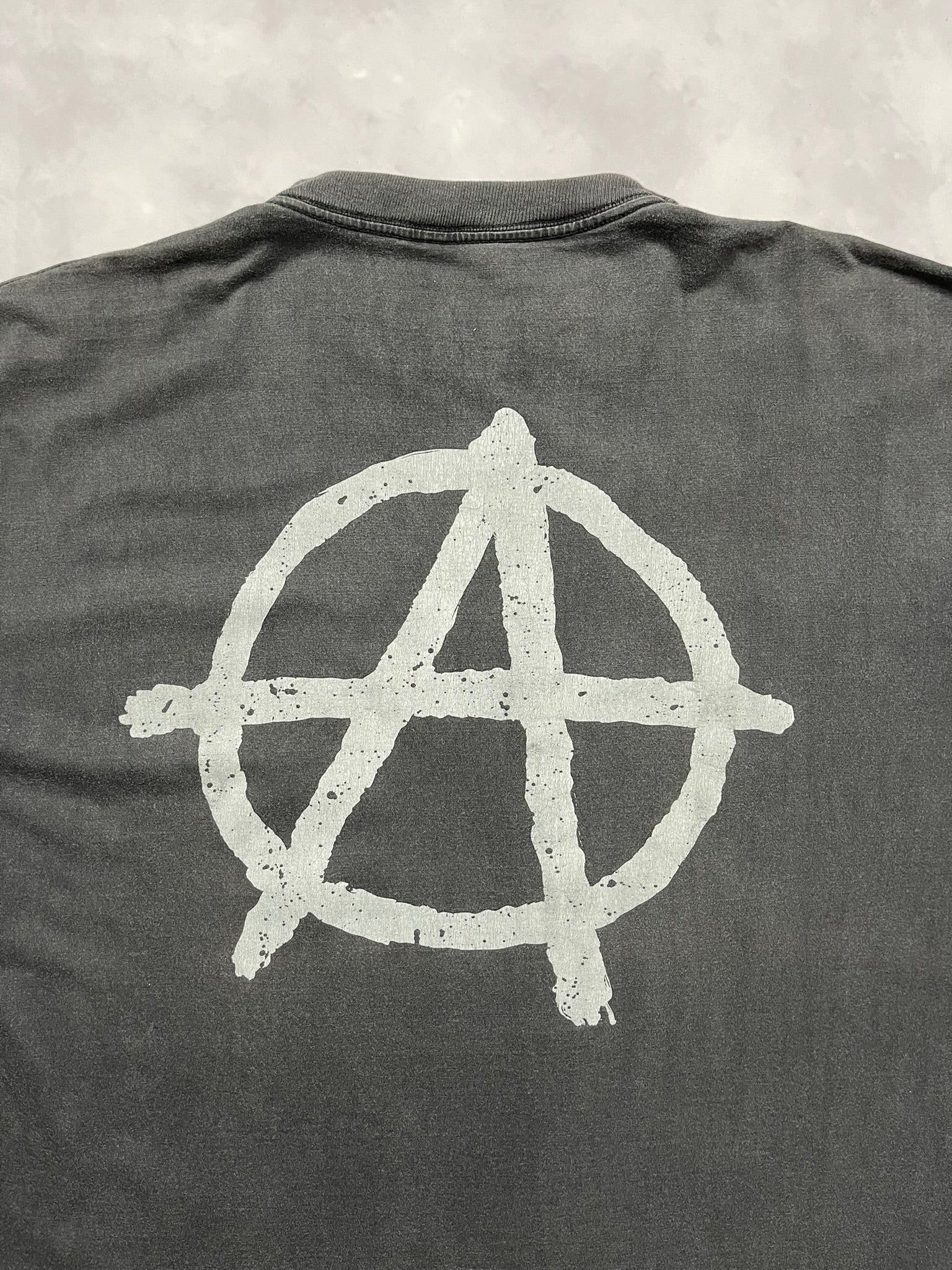 Late 90s punk anarchy long sleeve on a faded black Airtees tag with killer distressing and soft wear throughout. Big cracked paint front and back prints with hand-drawn anarchy symbol and bold ANARCHY text, wrapped in rebellious 1776-era quotes. Great pickup for fans of 90s punk shirts, protest graphics, or grunge-era streetwear with real edge. Worn-in just right; including a few tiny pinholes, threadbare spots, vintage fade, and attitude to match.