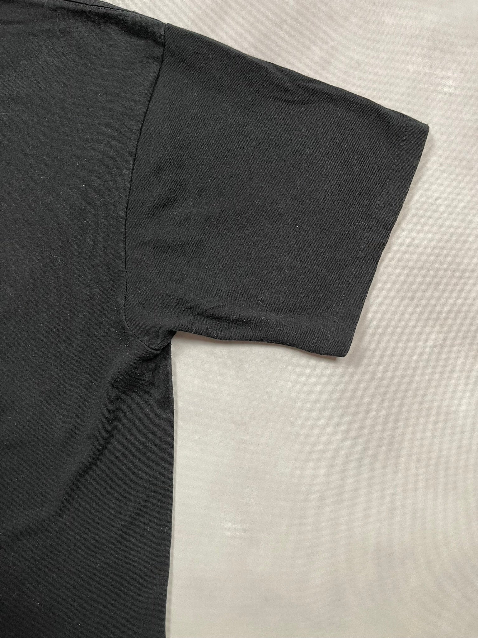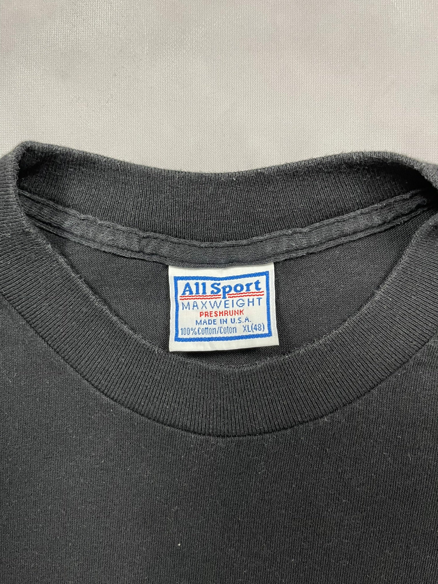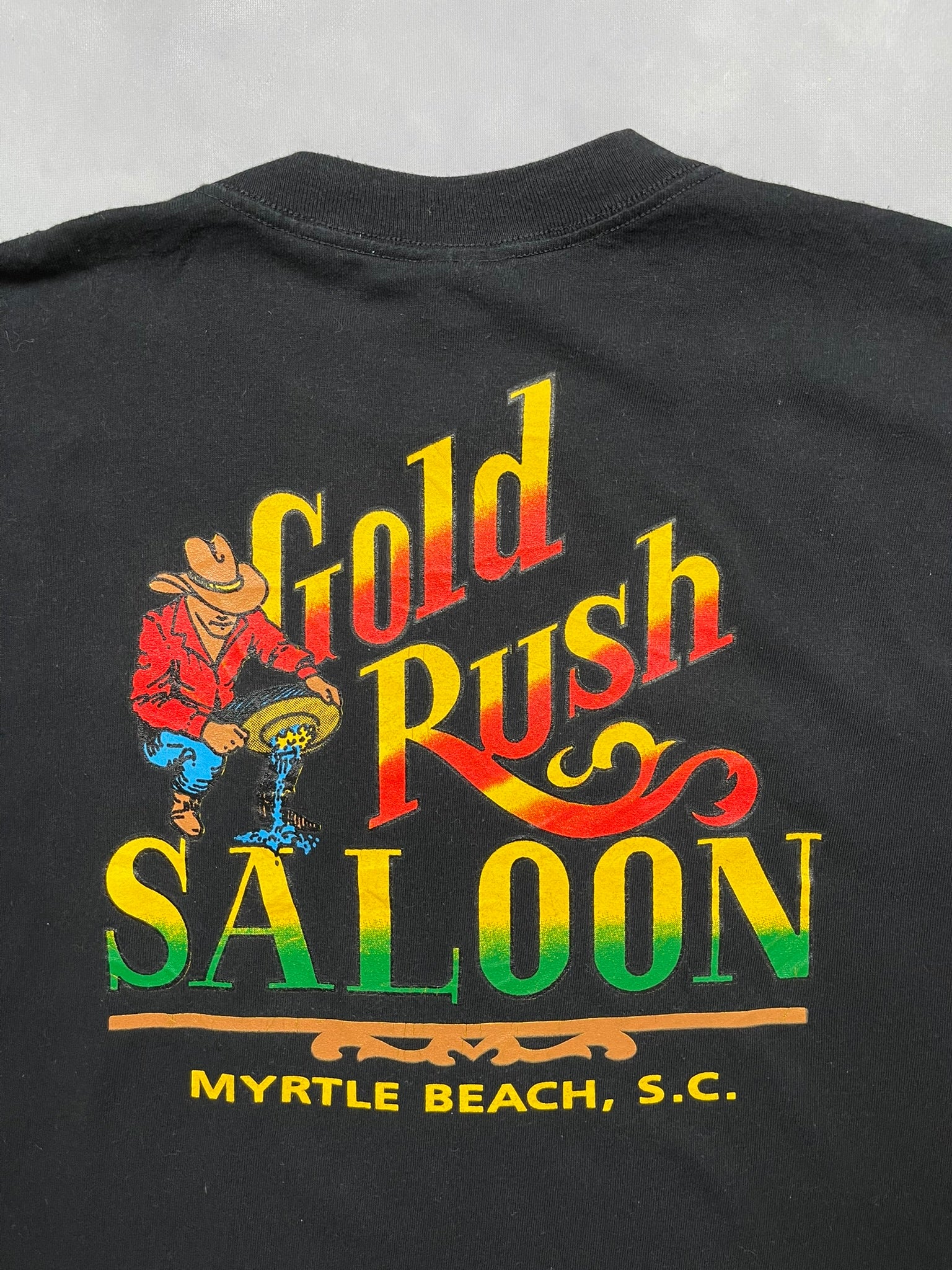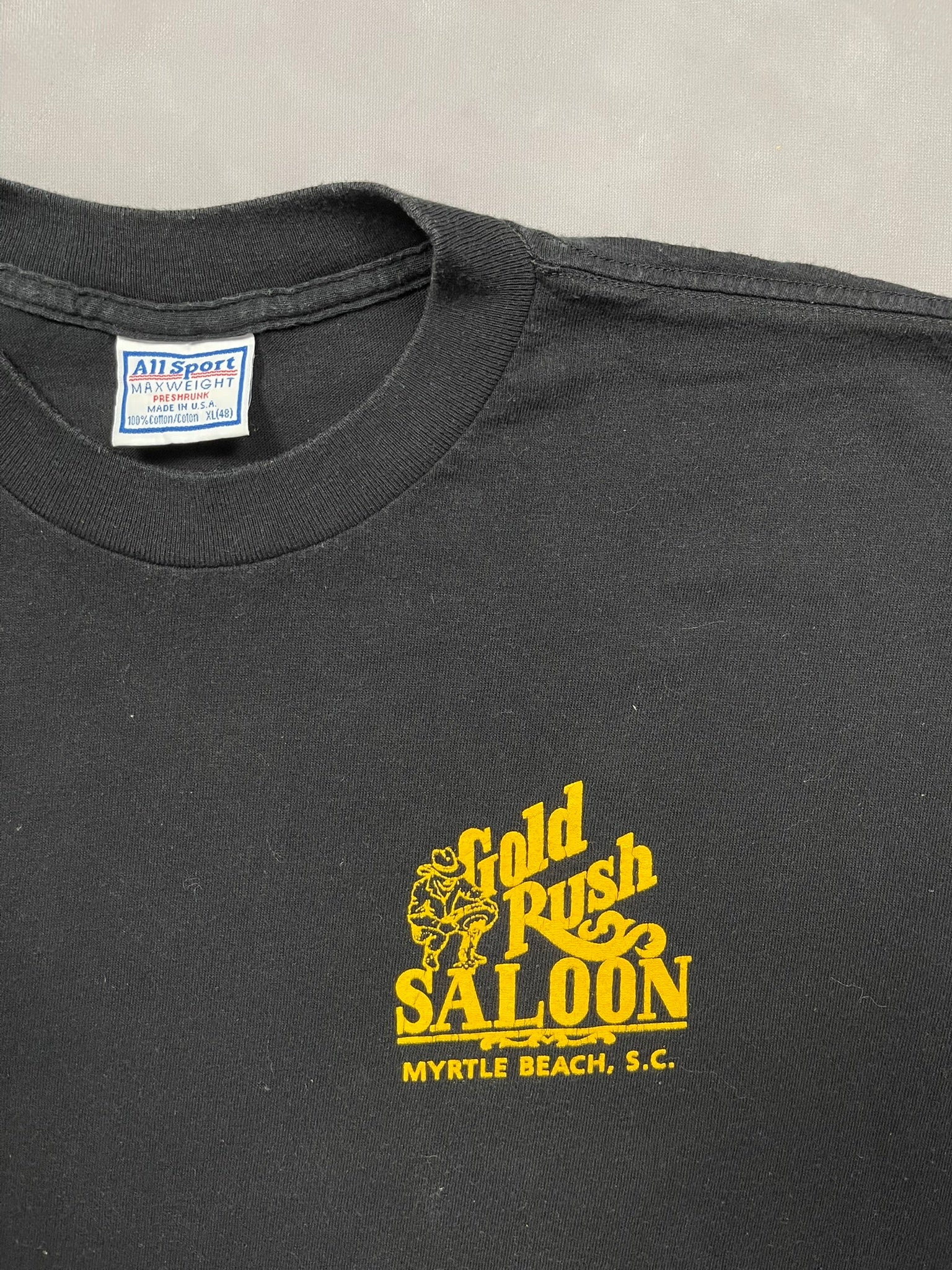 Vintage Gold Rush Saloon tee repping Myrtle Beach, South Carolina. Double-sided print with bold western typography and a full-color prospector graphic on the back. Printed on a heavy AllSport Maxweight tag, made in USA, 100% cotton. Tagged XL with a classic fit and nicely aged black fade. A solid bar tee from the late 90s with real Americana character.