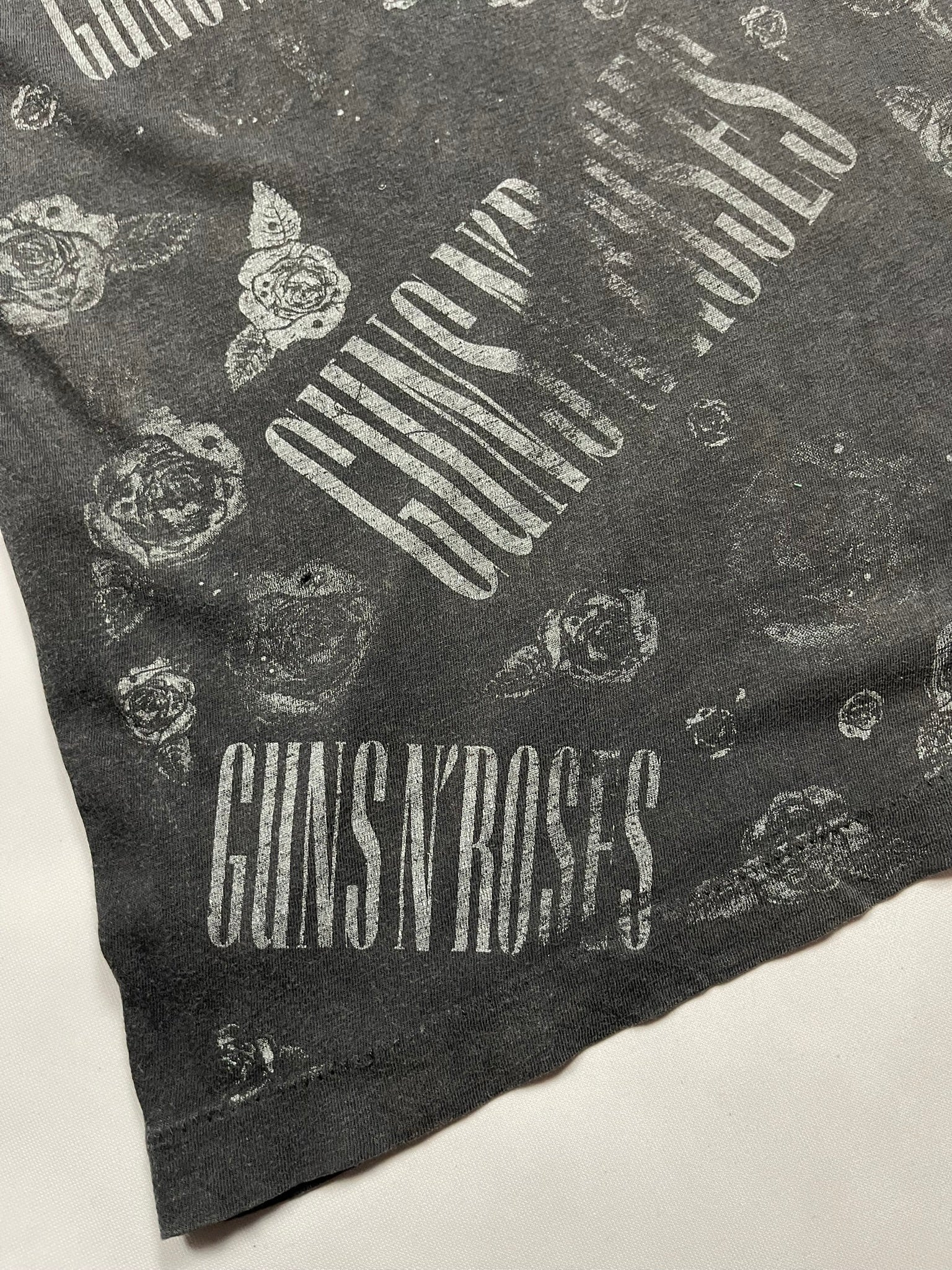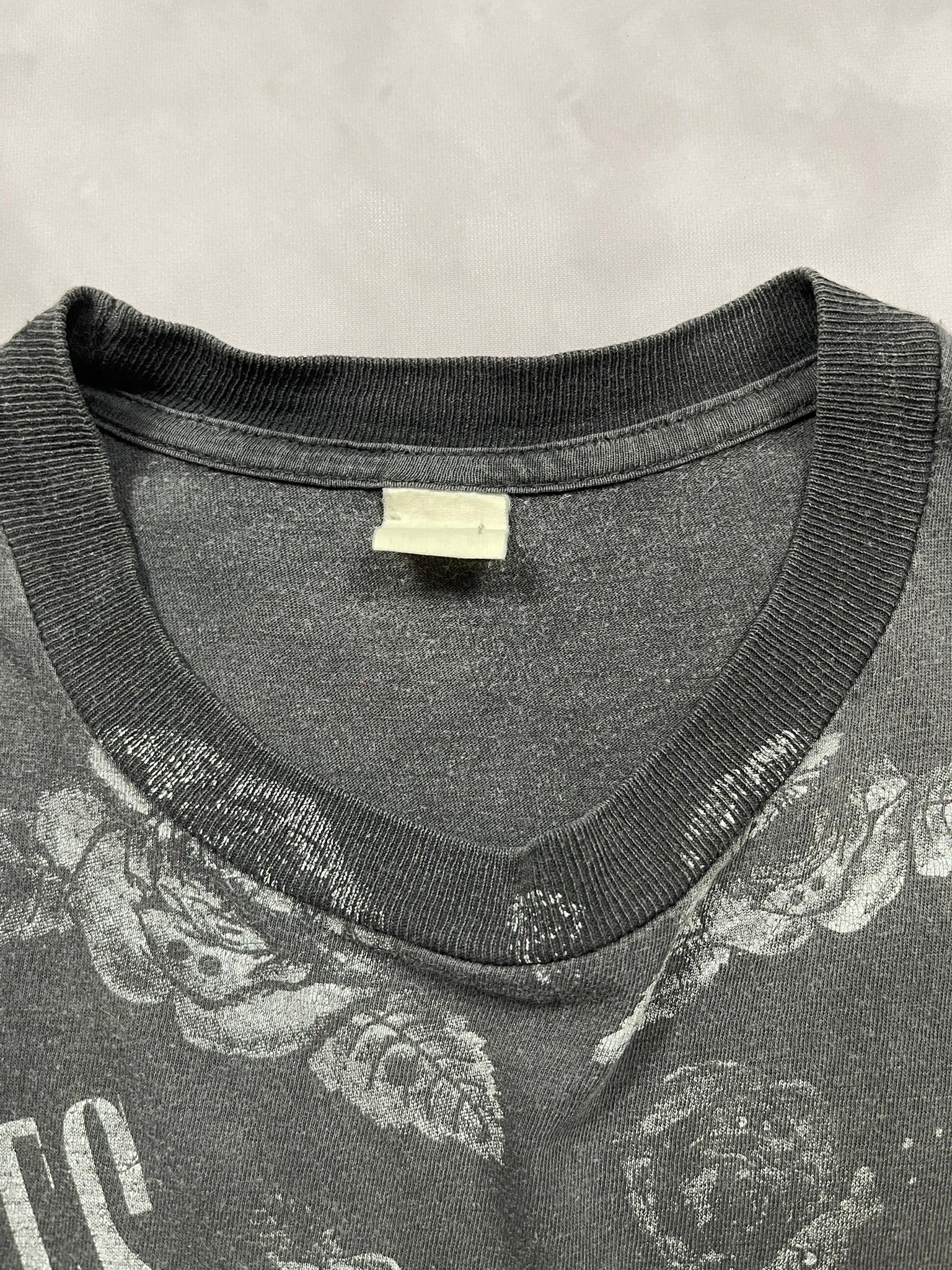 Mid to late 90s Guns N’ Roses all-over print tee with a killer grunge-era fade. Covered front and back in a layered rose-and-logo pattern, finished with a single red bloom popping from the center — raw, stripped-down band merch energy. Blank tag and no licensing visible, likely a boot or unofficial fan piece, but still packed with collector appeal. Perfect for GNR heads, 90s AOP graphic tee collectors, or anyone chasing that dark alt-rock look.