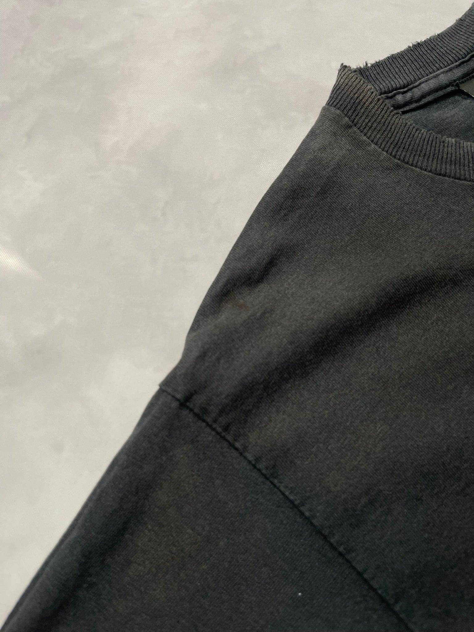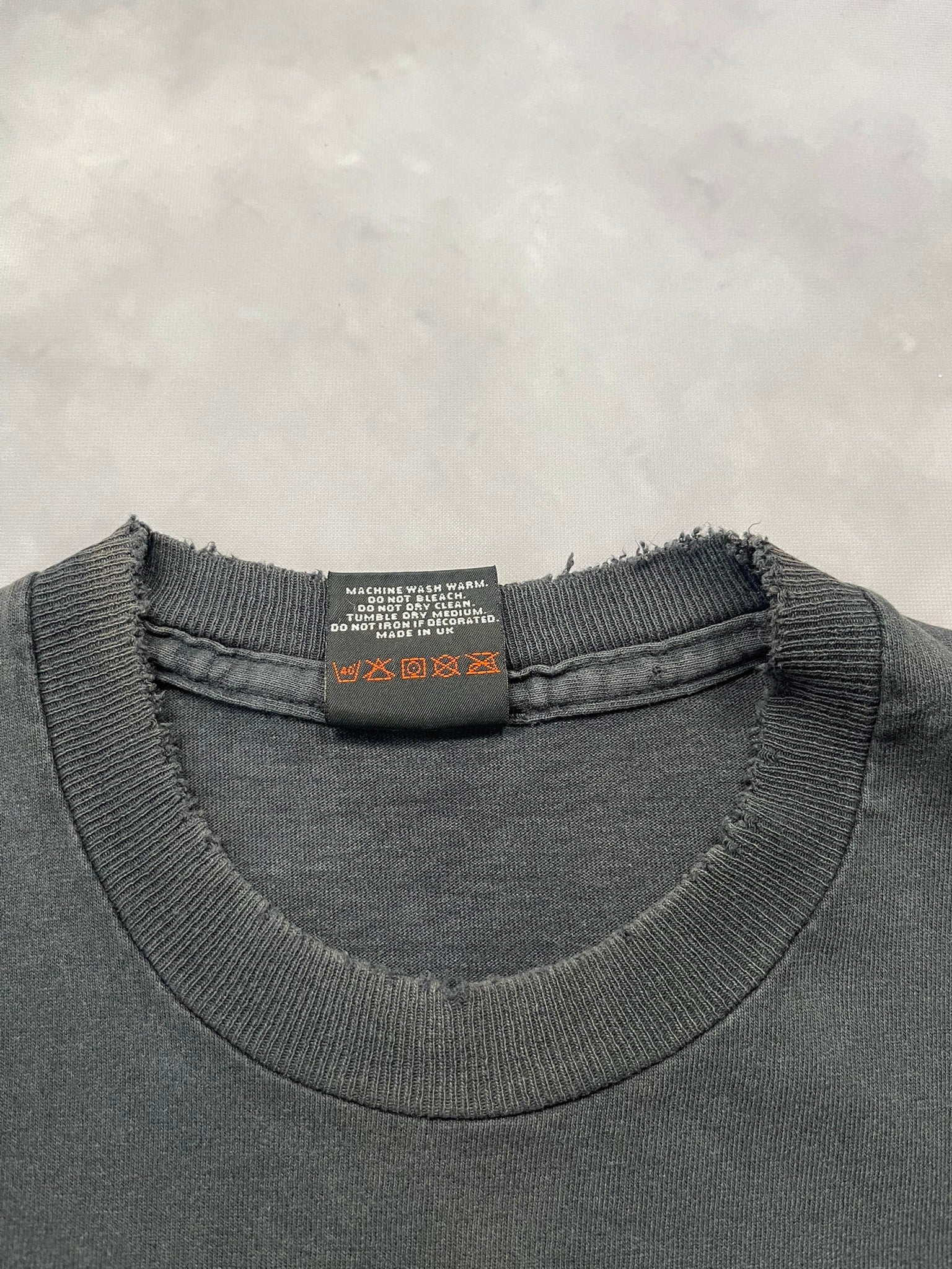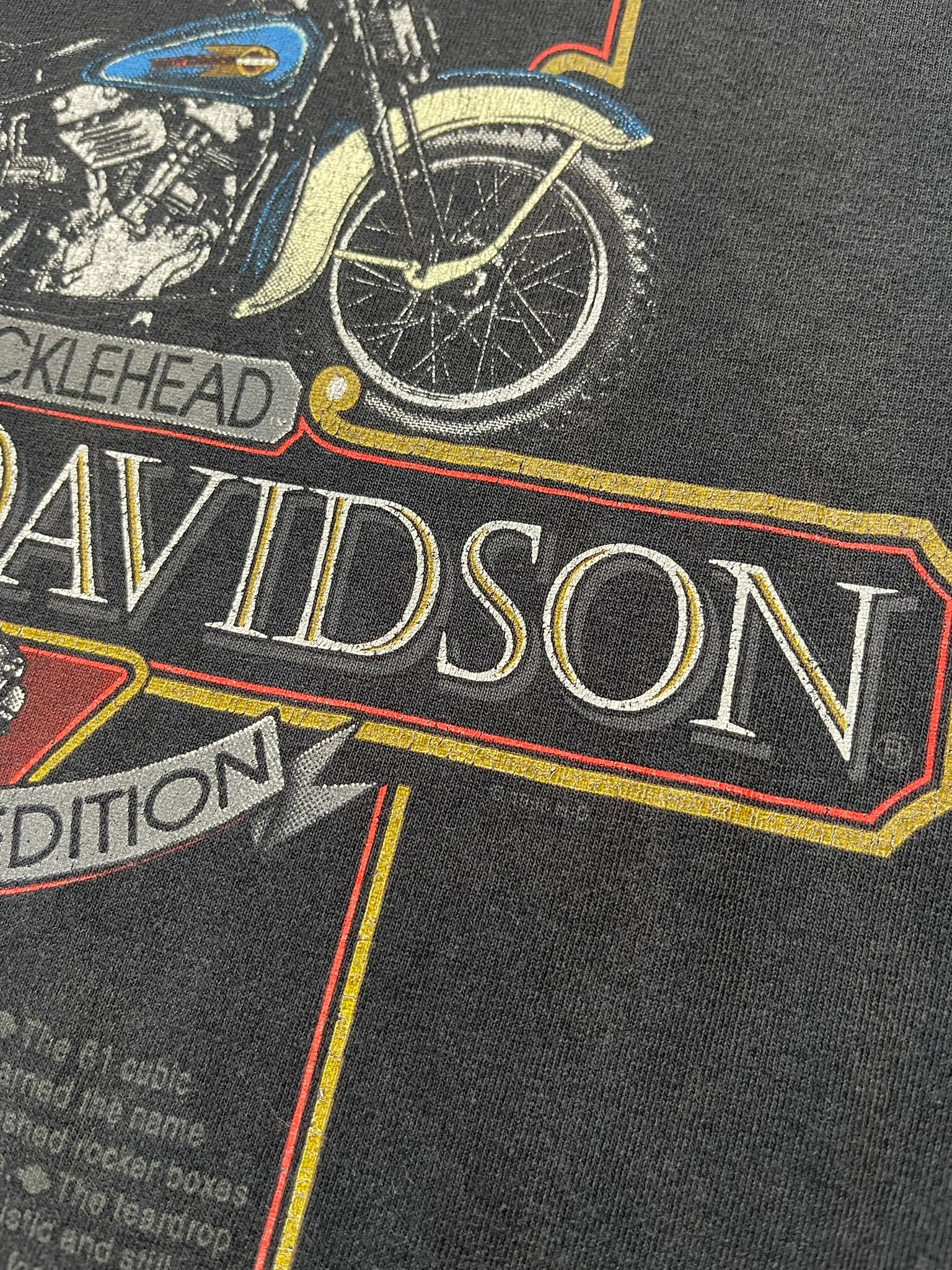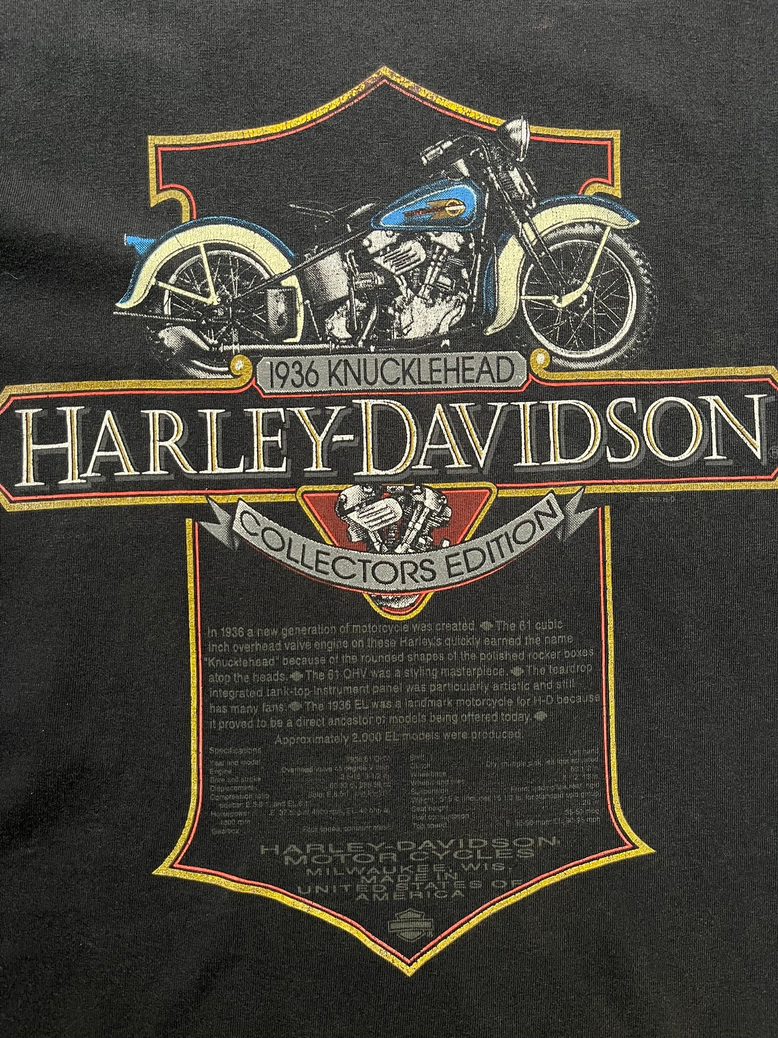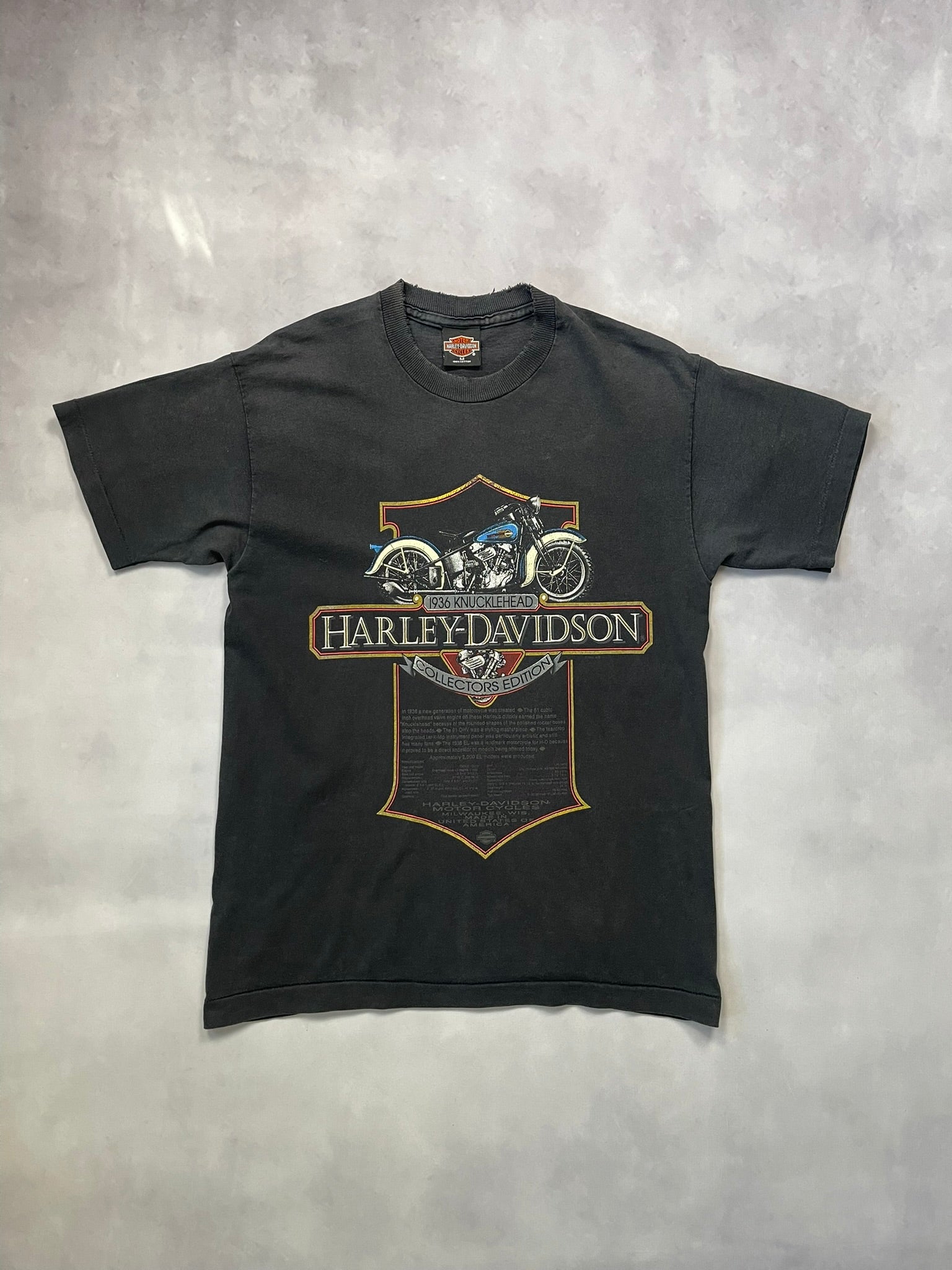 Collector’s edition tee paying tribute to the legendary 1936 Knucklehead, complete with bar & shield framing and detailed specs printed below. Single-sided print on a worn-in black blank with a soft fade and frayed collar for that true road-worn patina. A solid grab for Harley historians and moto graphic heads alike. On a single stitched UK made Harley tag.