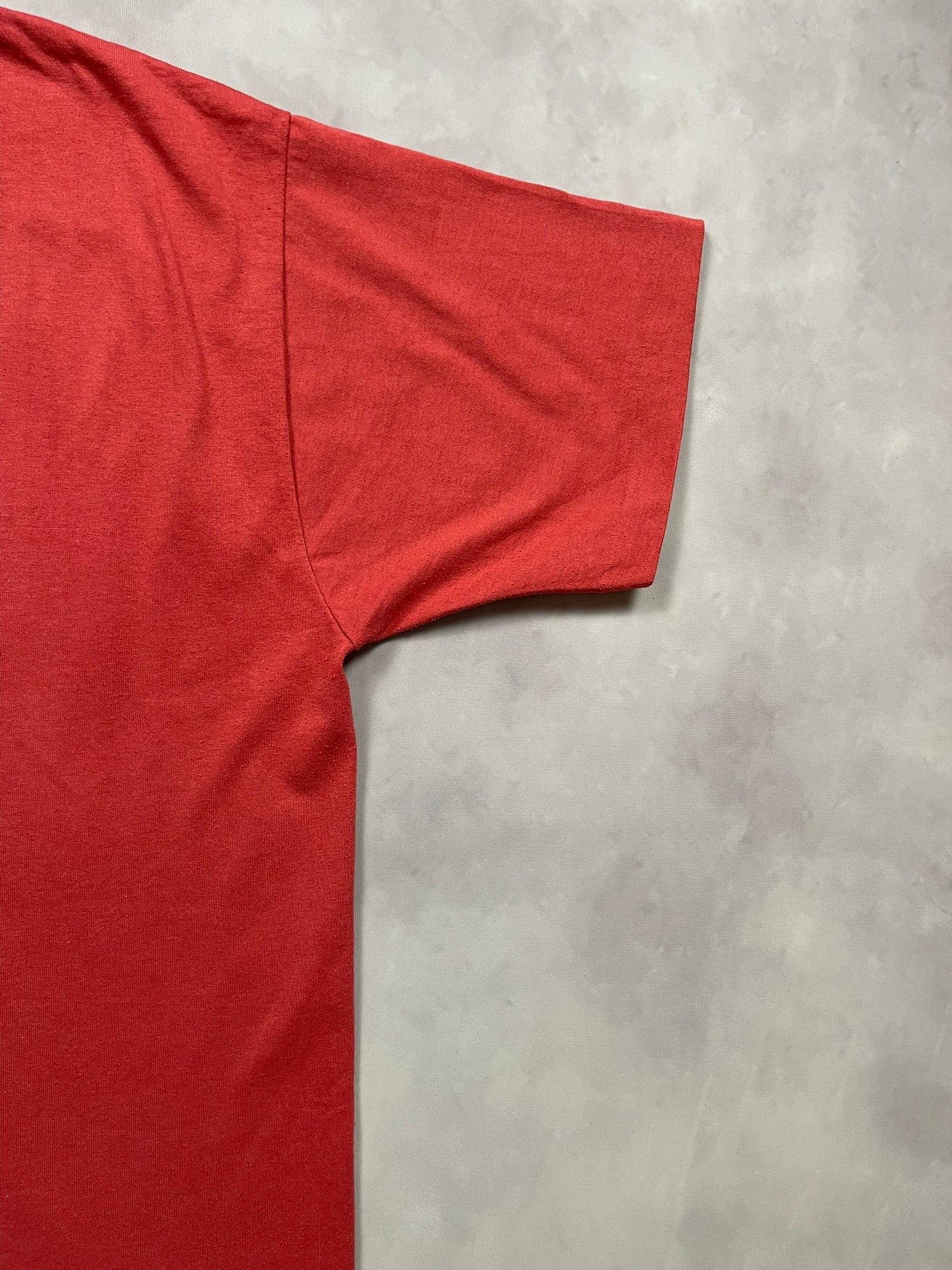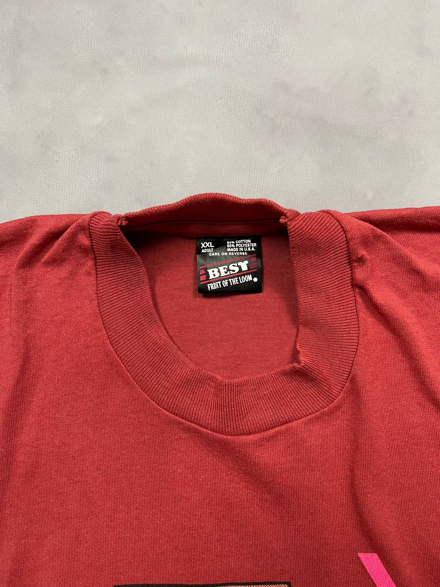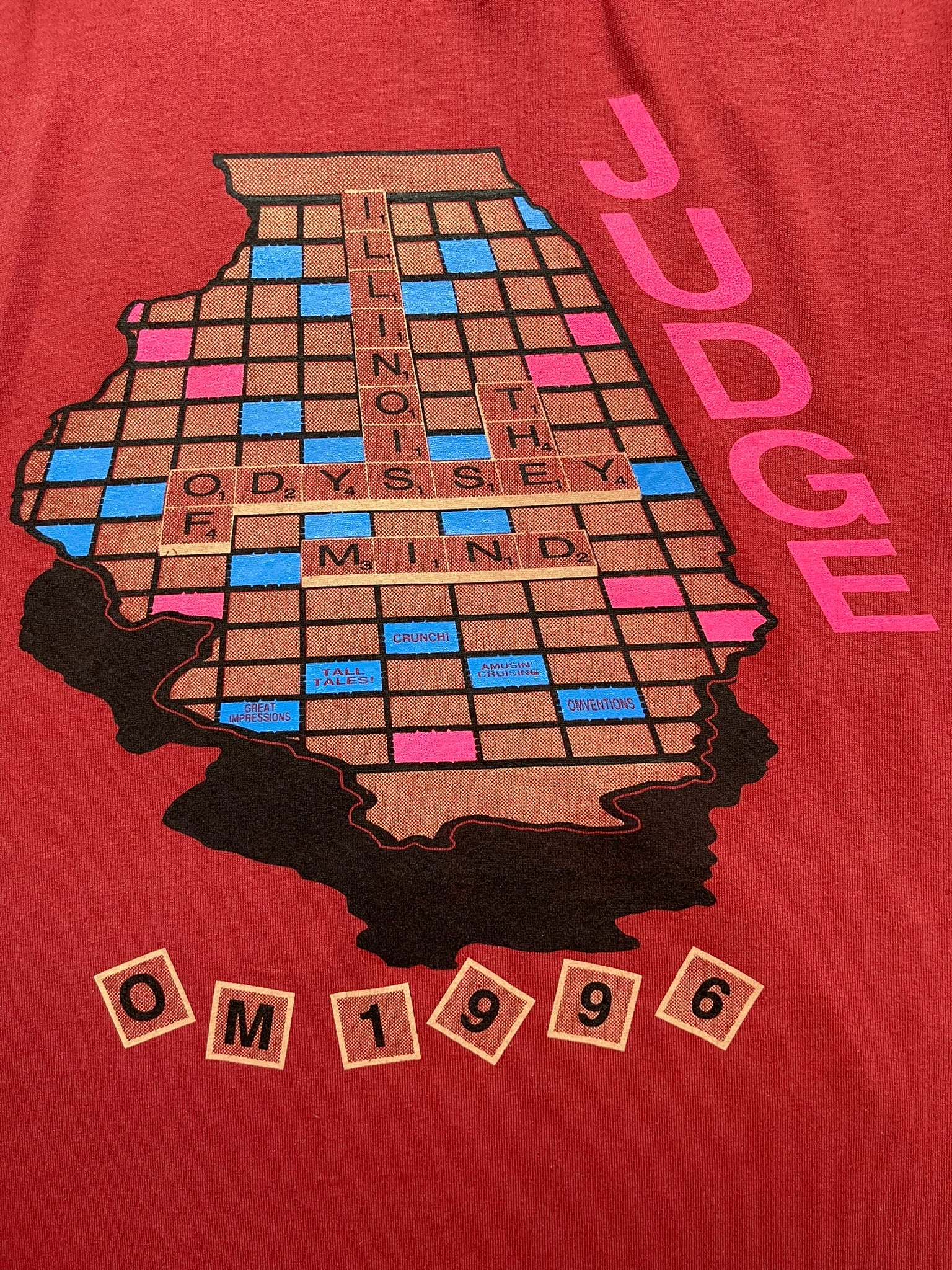 1996 Illinois Odyssey of the Mind “Judge” tee on a red Fruit of the Loom Best tag, made in USA. Features a creative Scrabble-inspired print shaped like the state of Illinois, celebrating the Odyssey of the Mind academic competition that encouraged problem-solving and innovation in schools throughout the 80s and 90s. Soft 50/50 cotton-poly blend with bold pink and tan graphics and a relaxed fit. A true piece of 90s educational and design nostalgia.