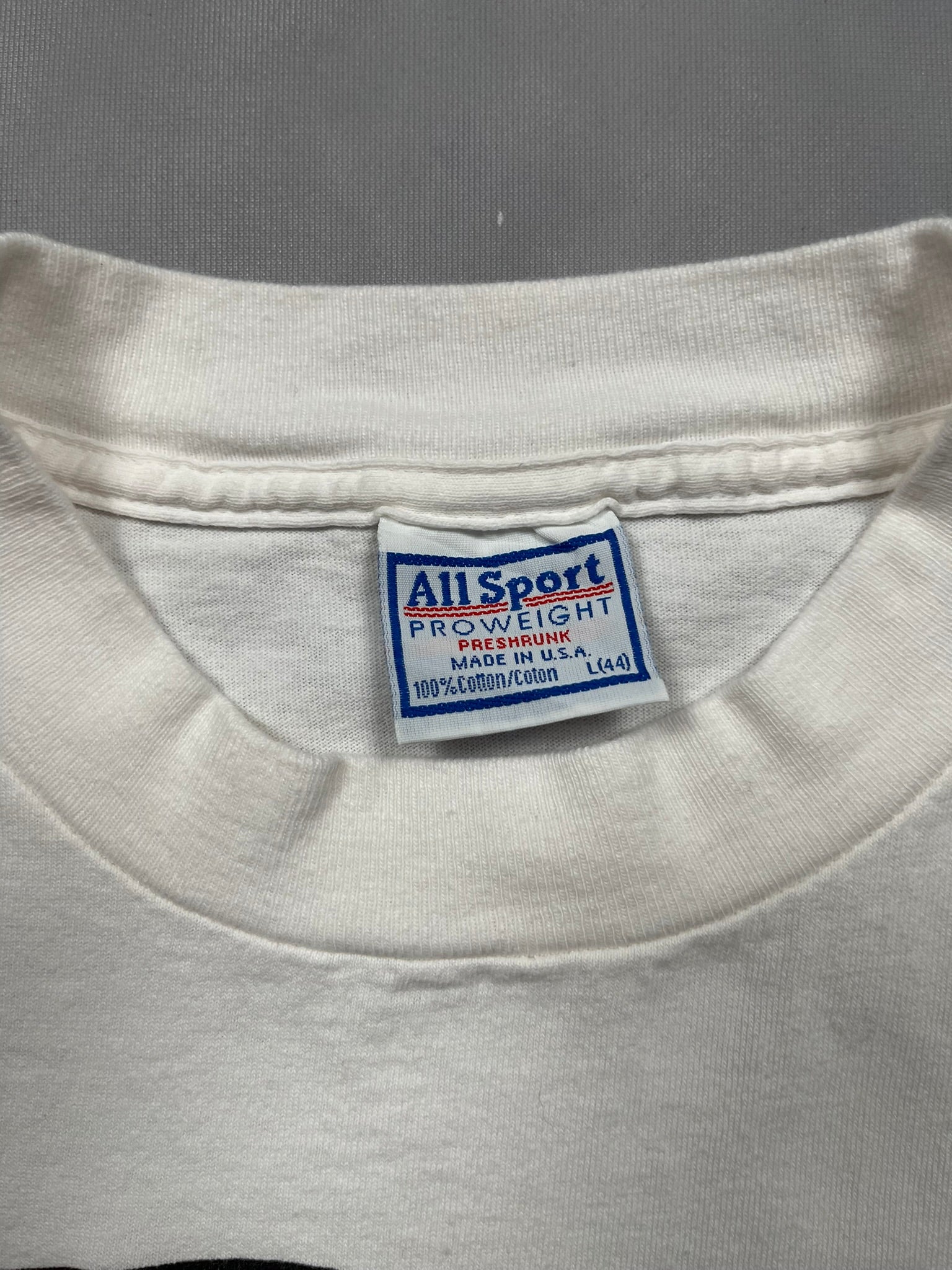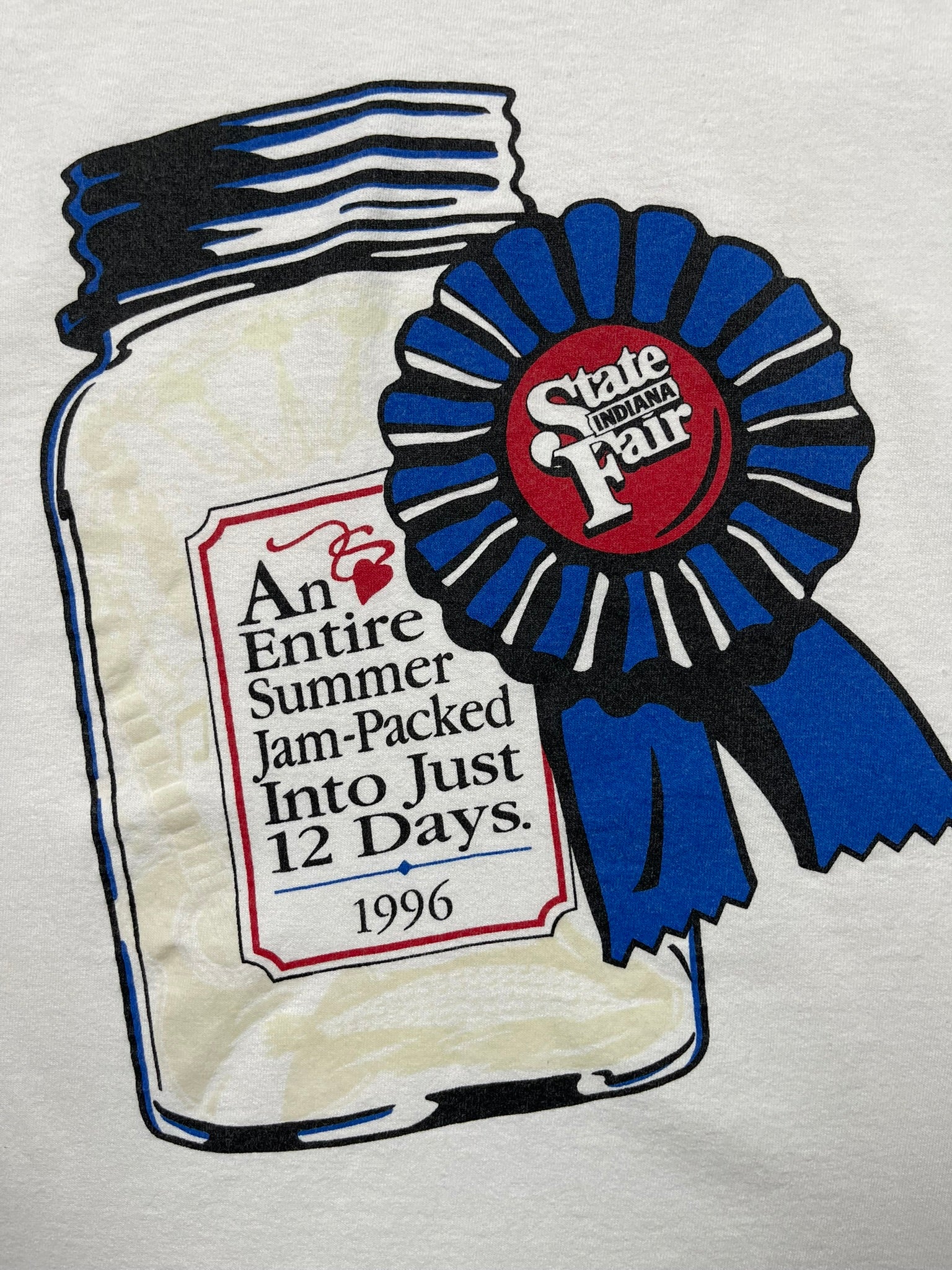 1996 Indiana State Fair tee on a white AllSport ProWeight tag and made in USA. Big bold mason jar graphic with a blue ribbon print and classic mid-90s fair promo energy. Soft heavyweight cotton with a clean front hit and that crisp souvenir tee structure. Great pickup for collectors of state fair memorabilia, 90s promo shirts, or anyone into Americana-themed graphics.