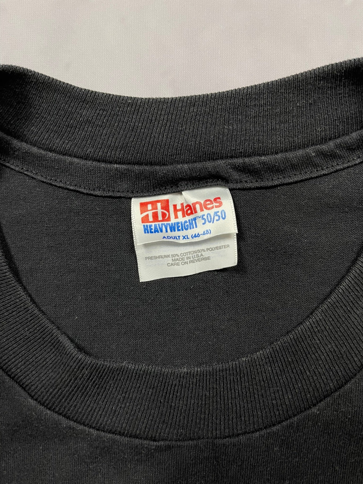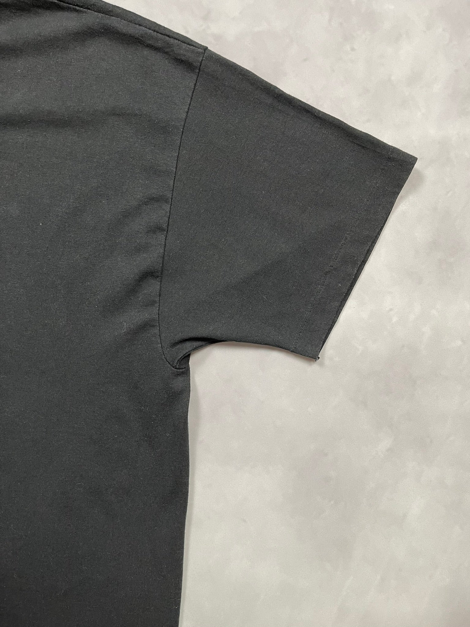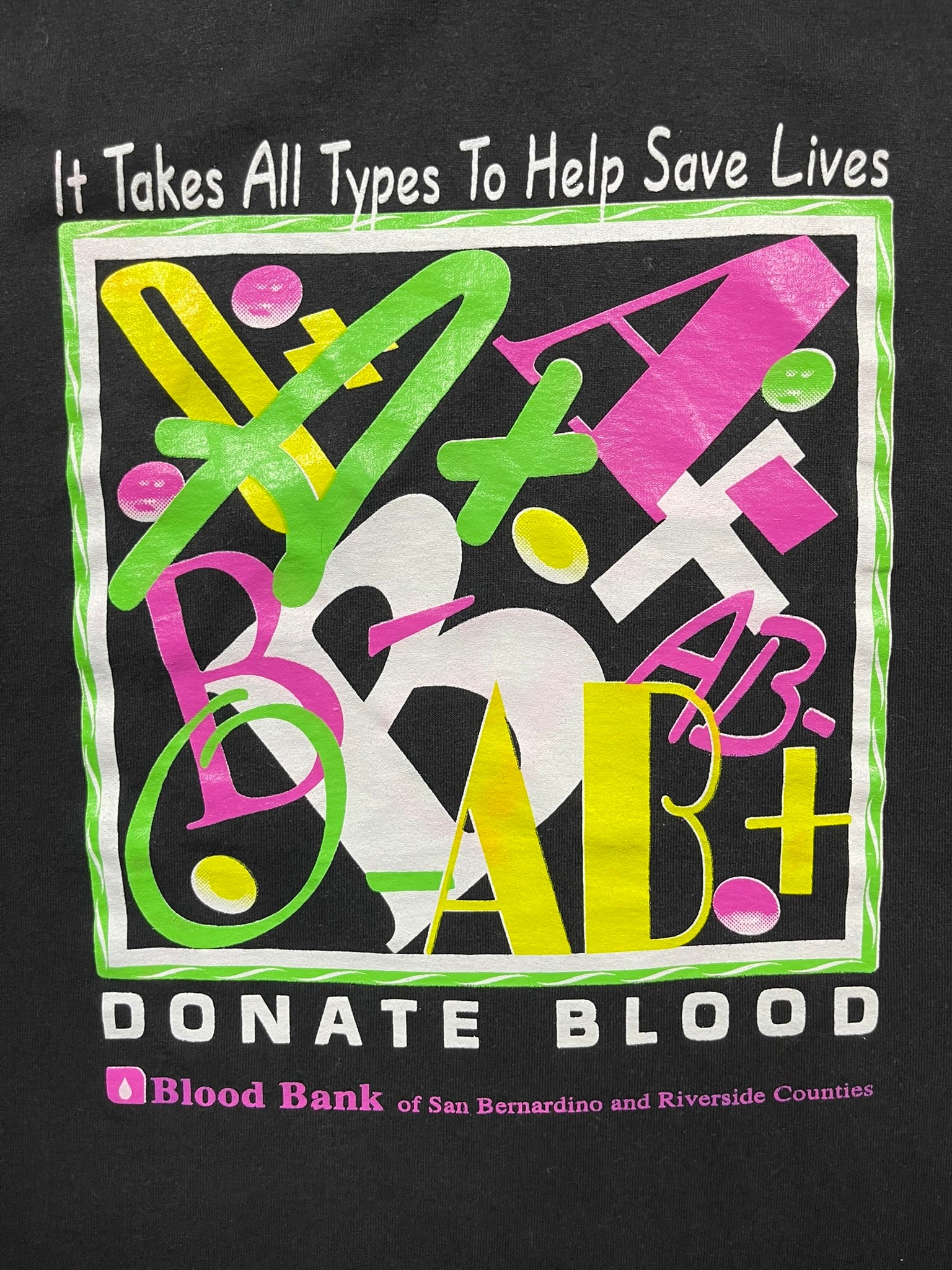 Early 90s Hanes Heavyweight tee made in the USA, featuring a bold “Donate Blood” graphic for the Blood Bank of San Bernardino and Riverside Counties. Eye-popping neon screenprint with abstract lettering, blood types, and a classic PSA-style layout — peak health awareness meets vintage pop design. Single-sided with crisp colors and clean wear. Great grab for fans of 90s graphic tees, medical or cause-related shirts, and collectors chasing bold type and color-block hits.