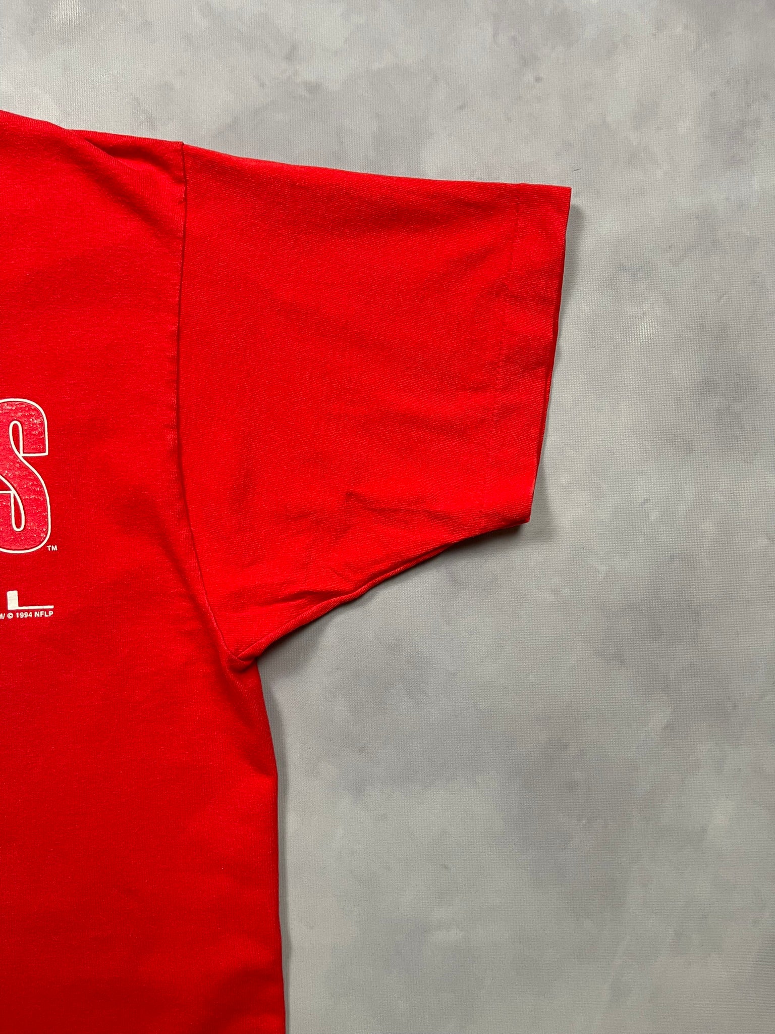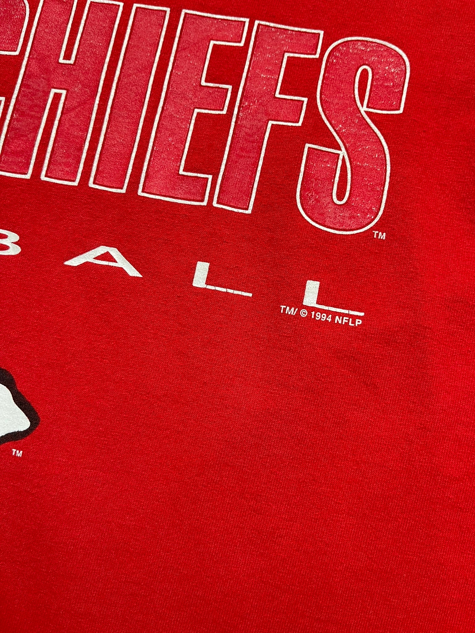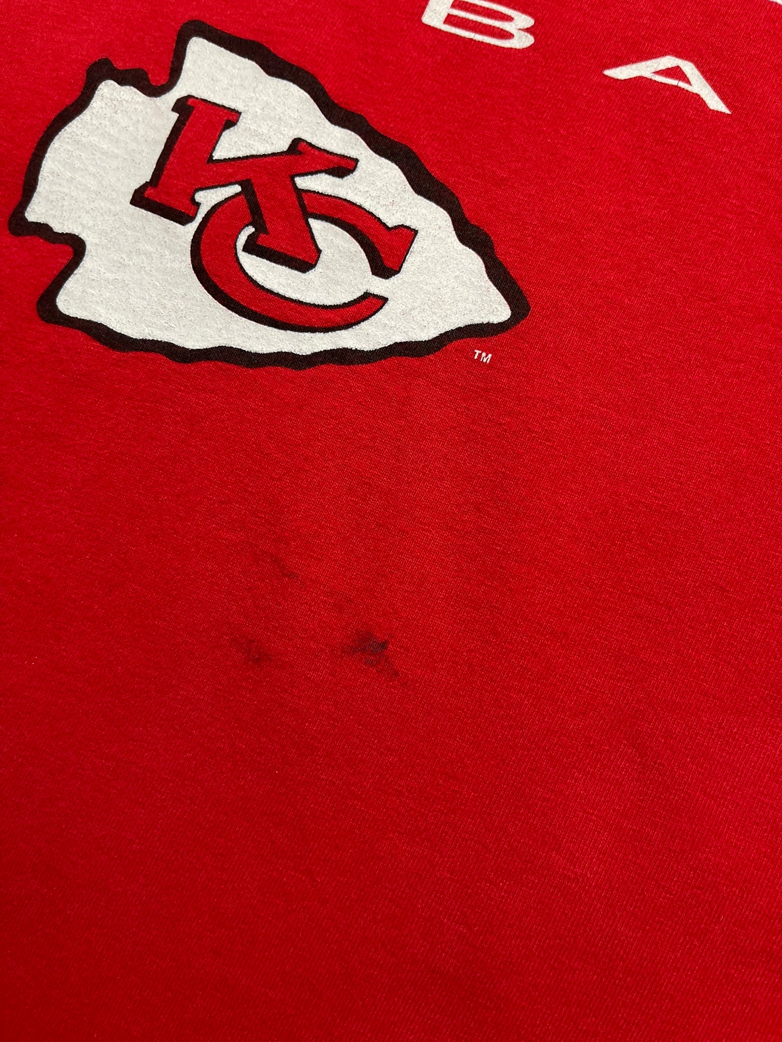 True 90s Kansas City Chiefs tee from 1994, tagged Salem Sportswear and made in USA. Bold front graphic with stacked city and team lettering above the KC logo, printed on heavyweight red cotton with a soft worn-in feel. Clean double stitch hems and minor front mark that blends into the vintage character. A solid pickup for NFL collectors, Chiefs fans, or anyone chasing that old-school gameday look.