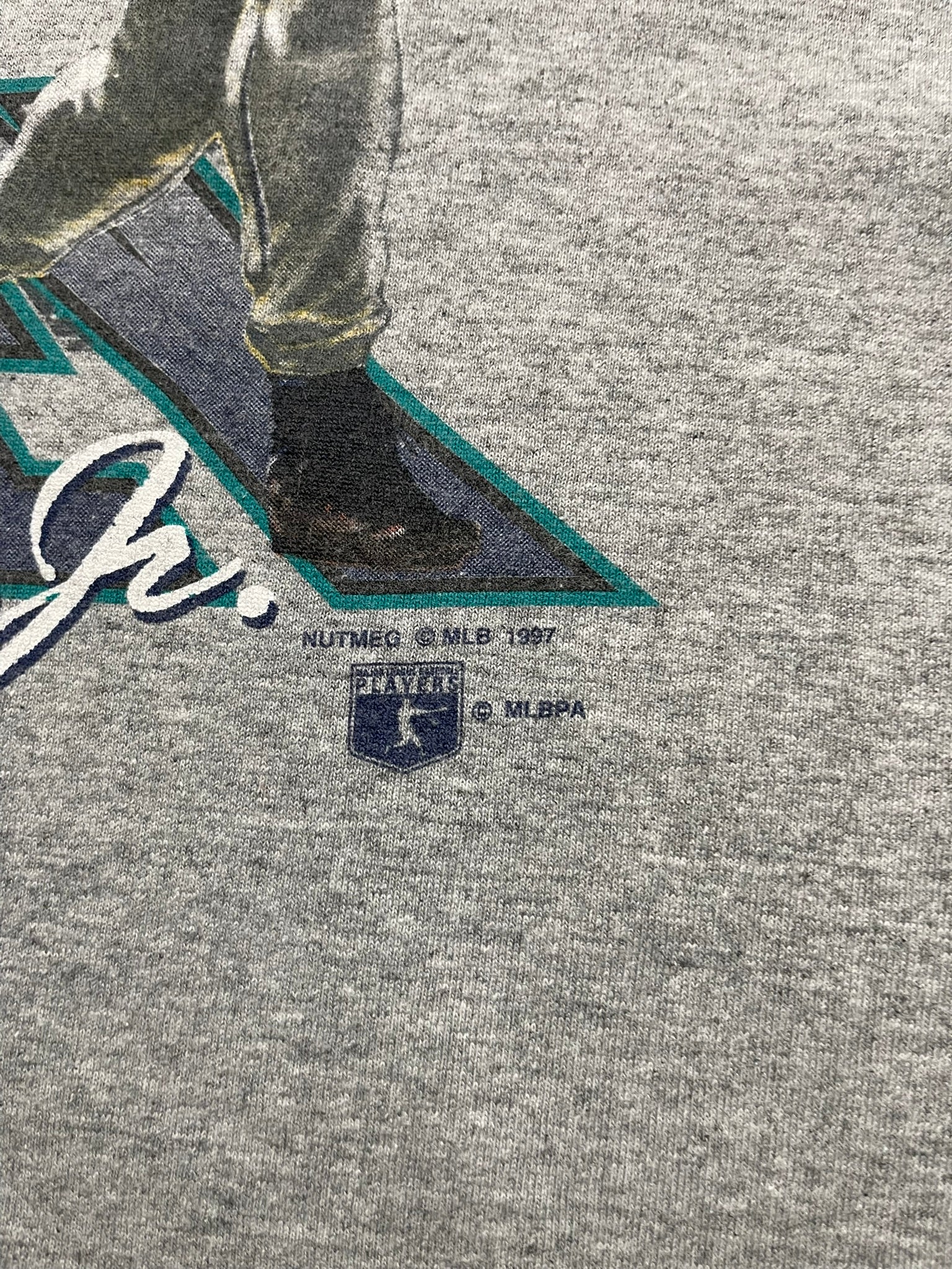 True 90s Ken Griffey Jr. Seattle Mariners tee on a grey Lee Sport tag, assembled in Mexico from USA materials. Officially licensed 1997 Nutmeg print featuring a large portrait and action shot of Griffey with bold teal and navy graphics and his classic #24 signature. Soft cotton blend with that perfect vintage drape. Essential piece for MLB collectors and 90s sportswear heads.