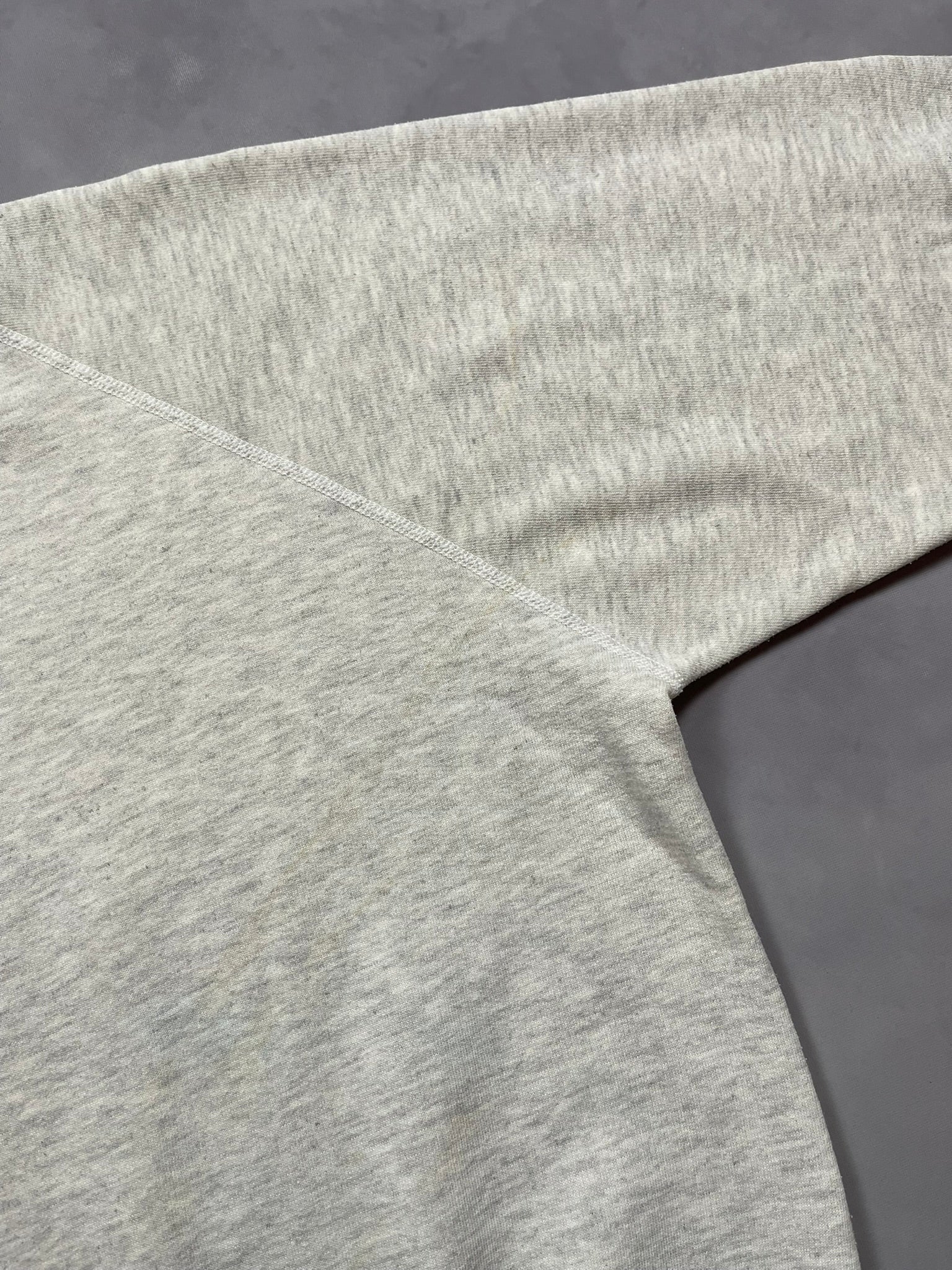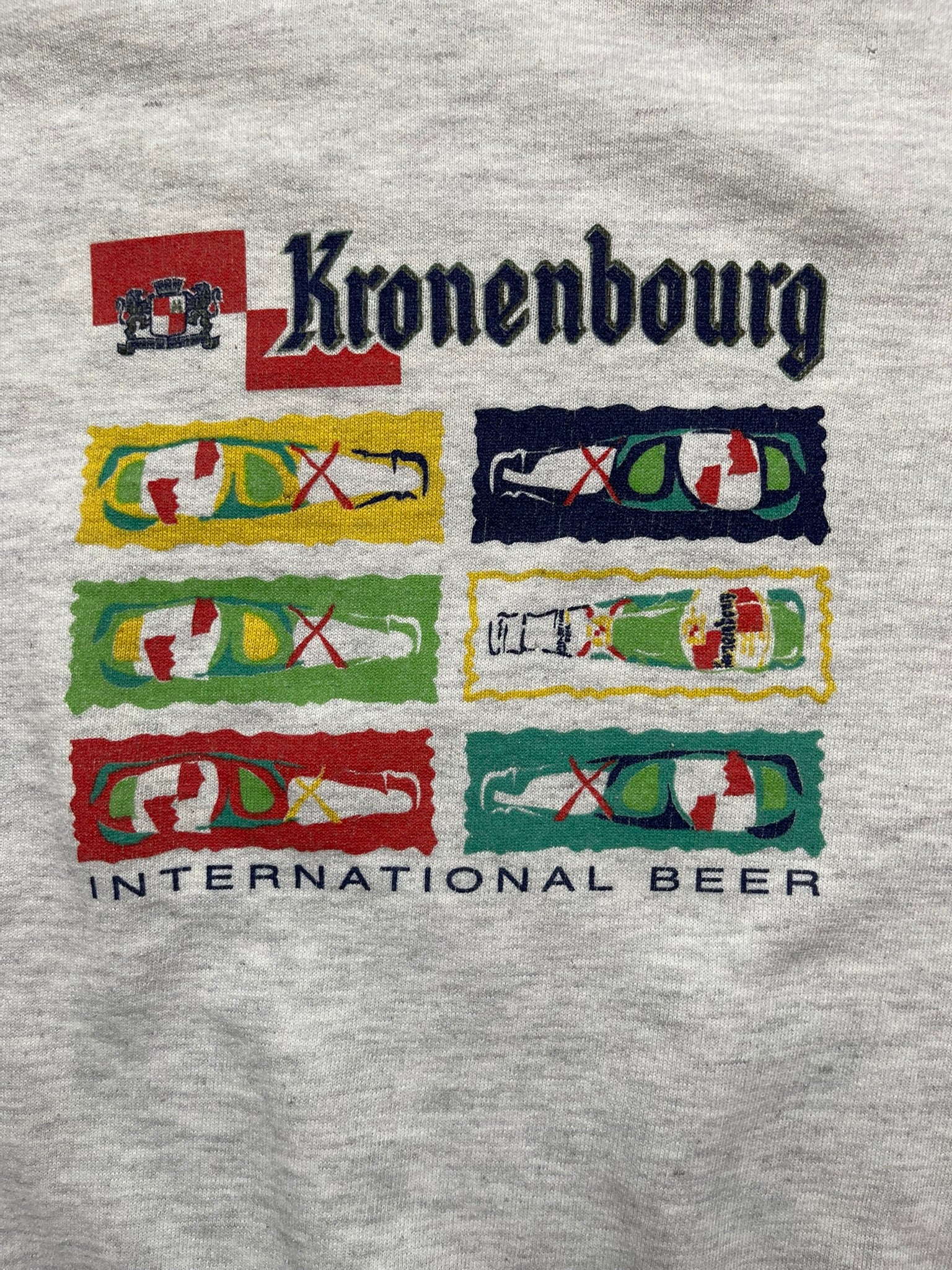 Early 90s Kronenbourg “International Beer” sweatshirt on a light grey Jerzees tag, made in USA. Features a bold multi-color graphic with international flag bottle designs, celebrating Kronenbourg’s reach as one of Europe’s oldest breweries. Soft fleece interior and that classic boxy Jerzees fit that collectors love. A rare promo-style crewneck that captures the golden age of beer advertising merch.