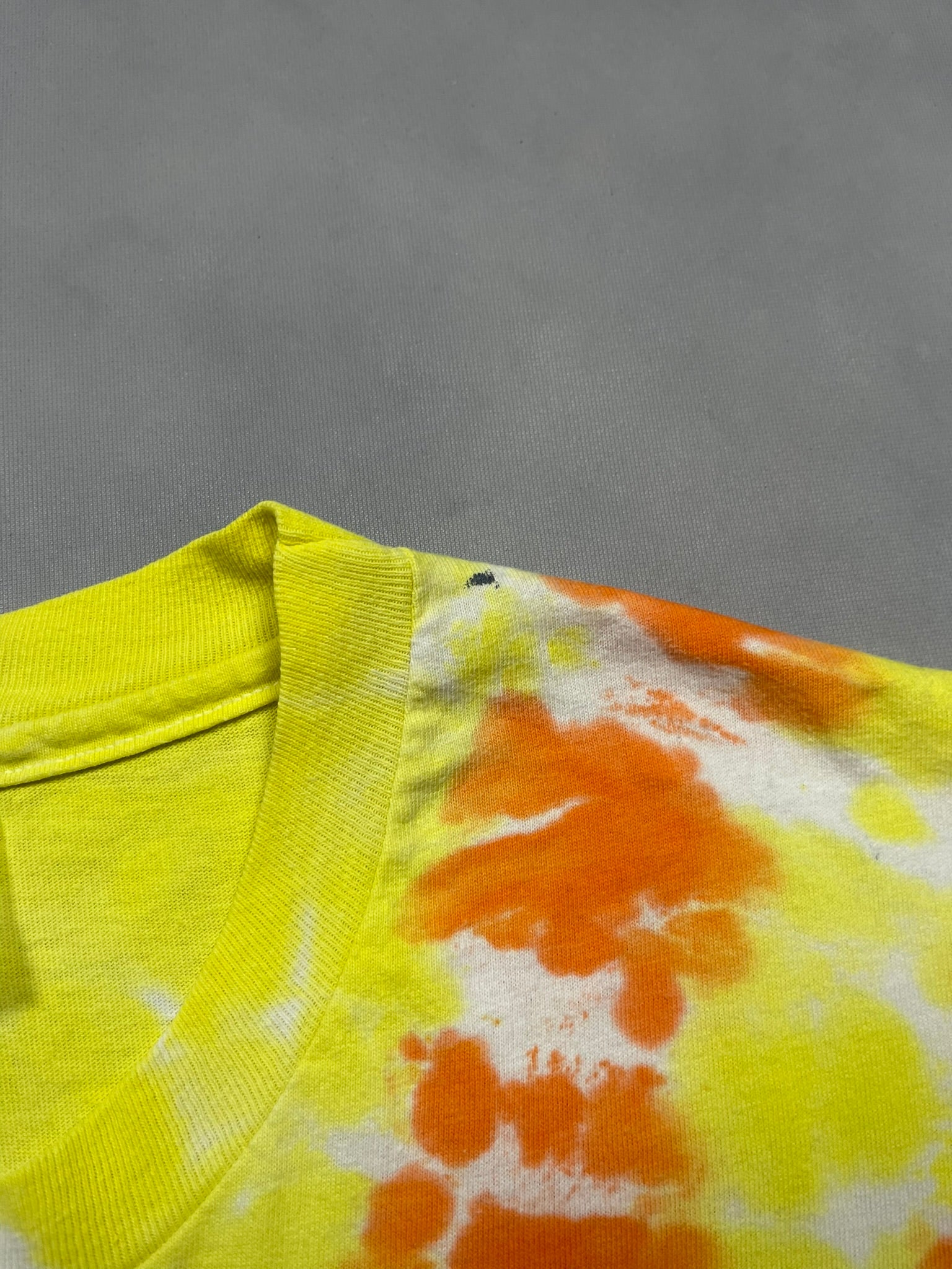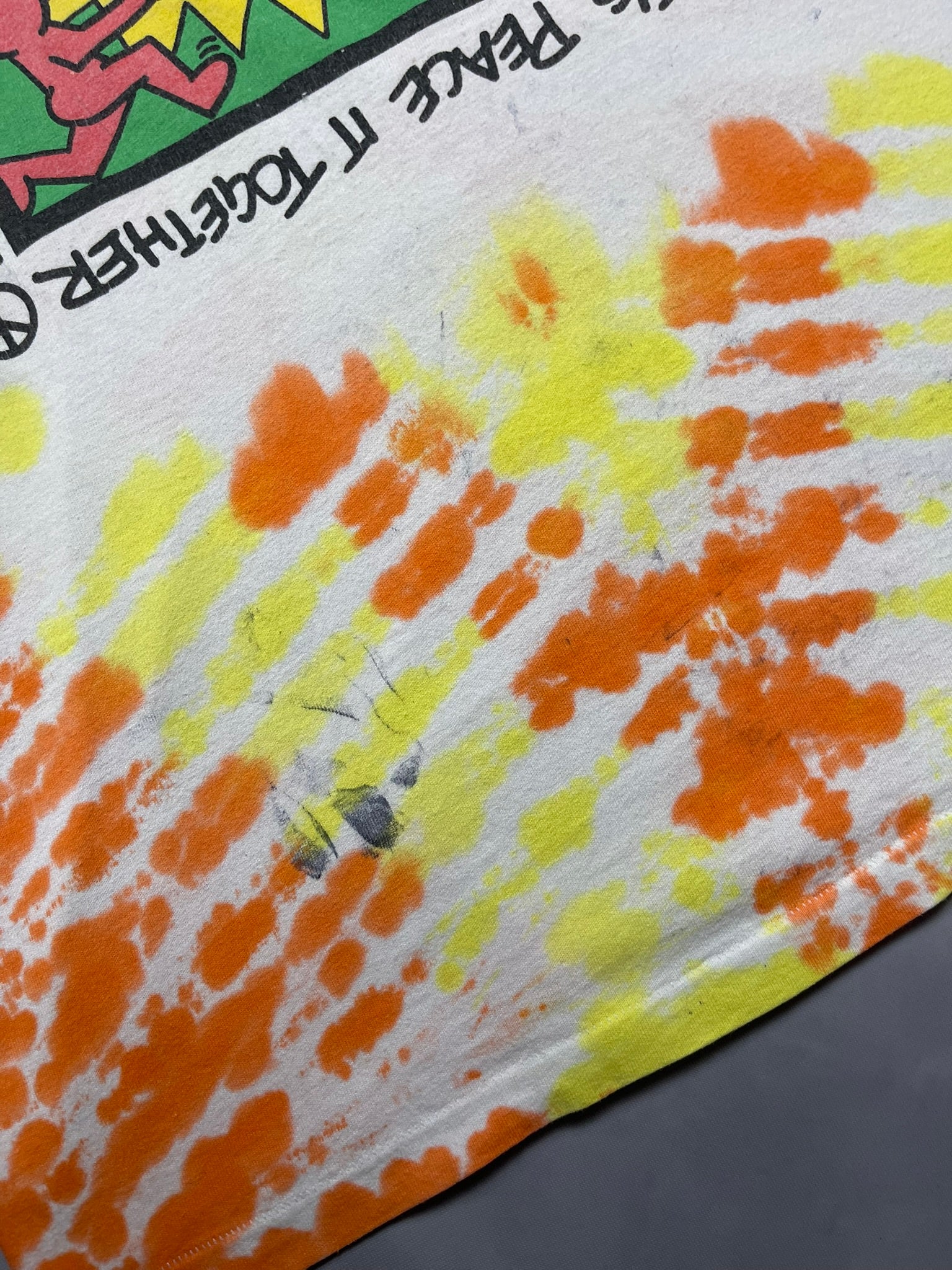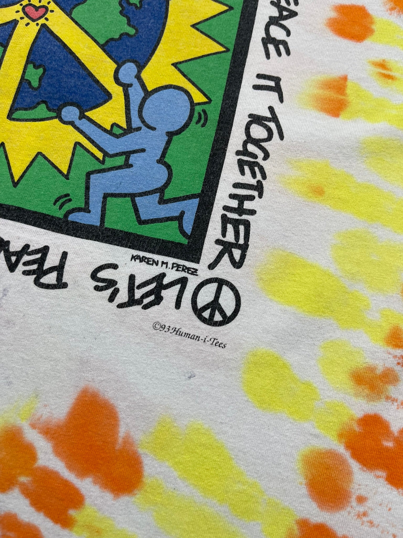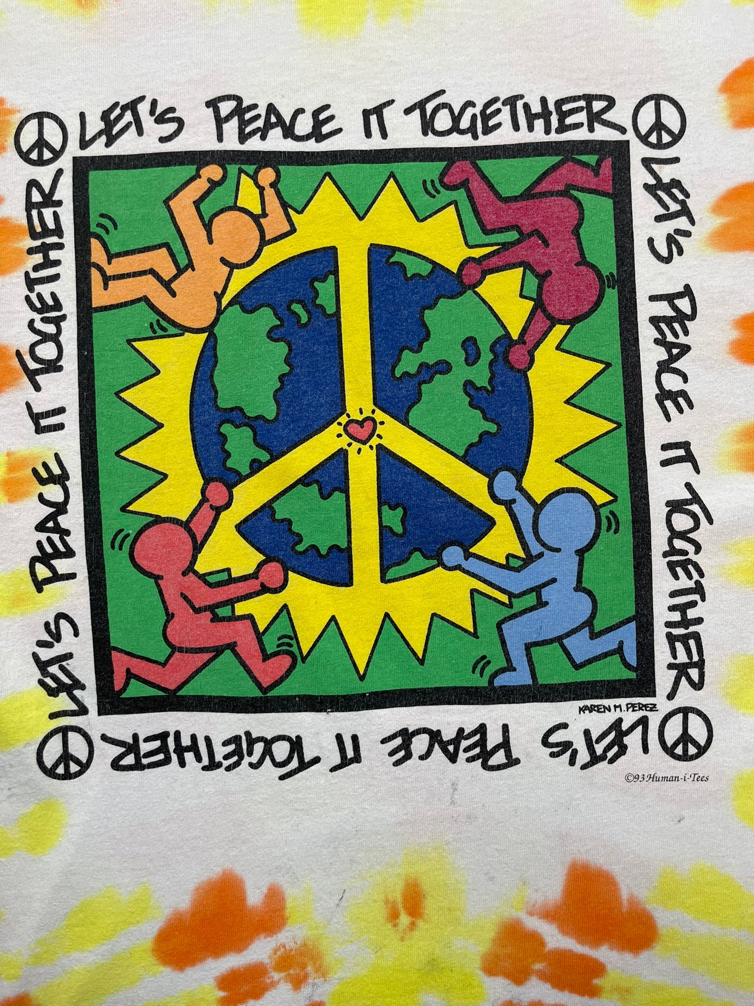 Original 1993 “Let’s Peace It Together” tie-dye tee by Karen M. Perez for Human-i-Tees. This vintage piece radiates 90s energy with its bold orange and yellow spiral dye and peace-forward graphic inspired by the iconic pop art styles of Keith Haring. Printed on a Hanes Heavyweight tag, made with 100% USA cotton and assembled in Mexico. Features scattered marks and light discoloration as shown, consistent with age and wear. A great wearable statement piece or collectible for fans of 90s activism art, streetwear, or vintage peace graphics.