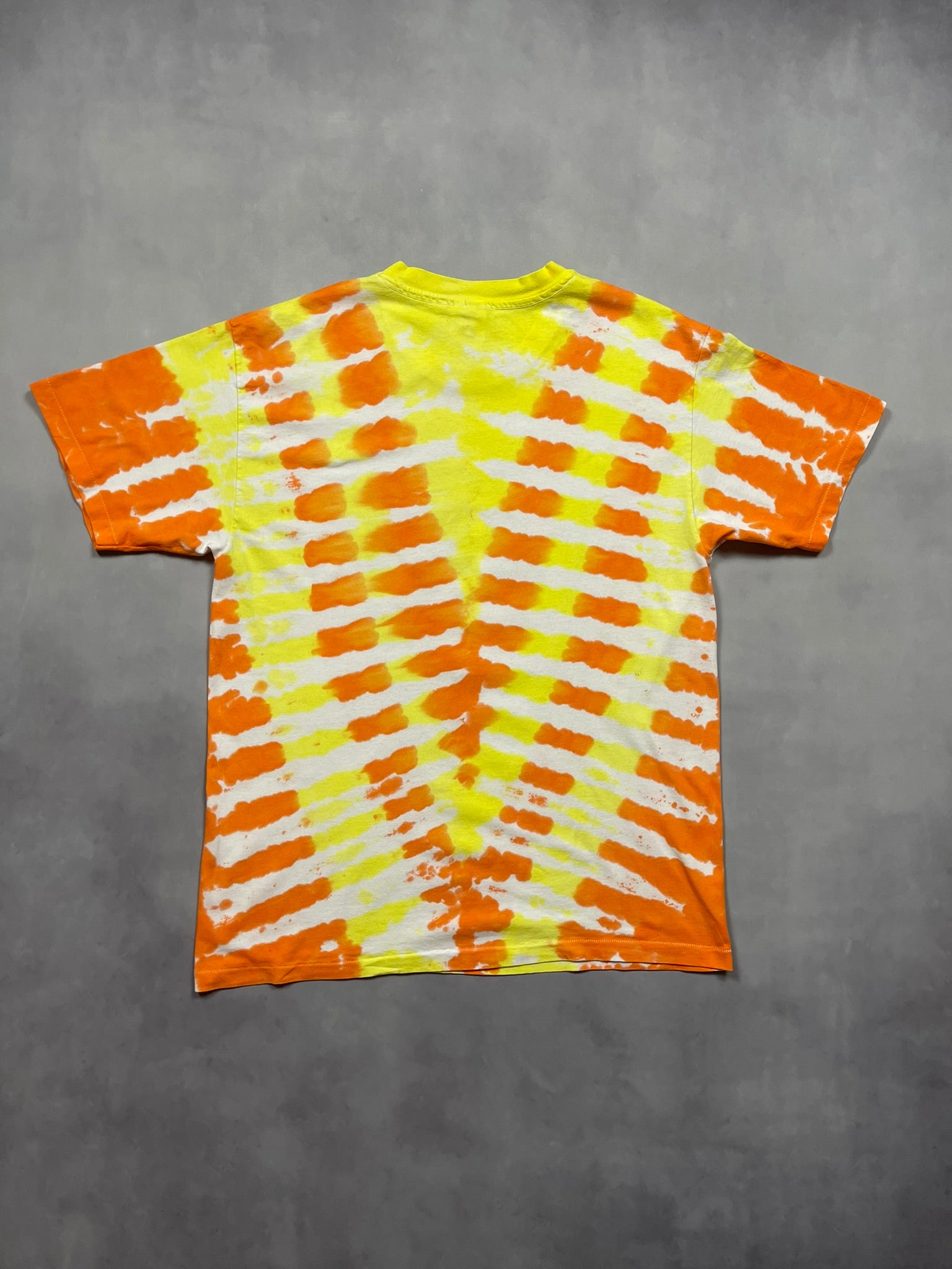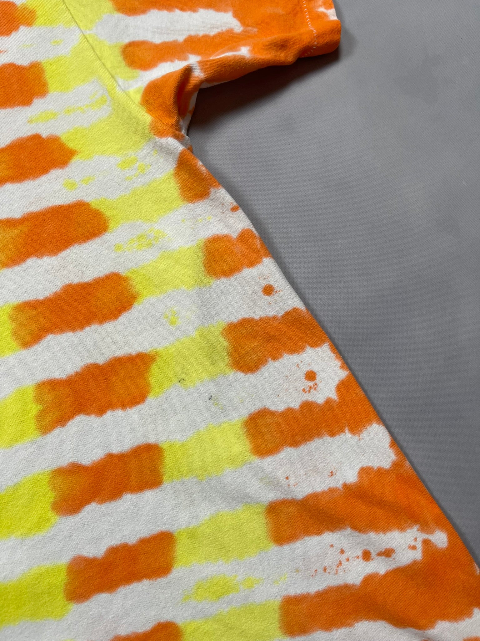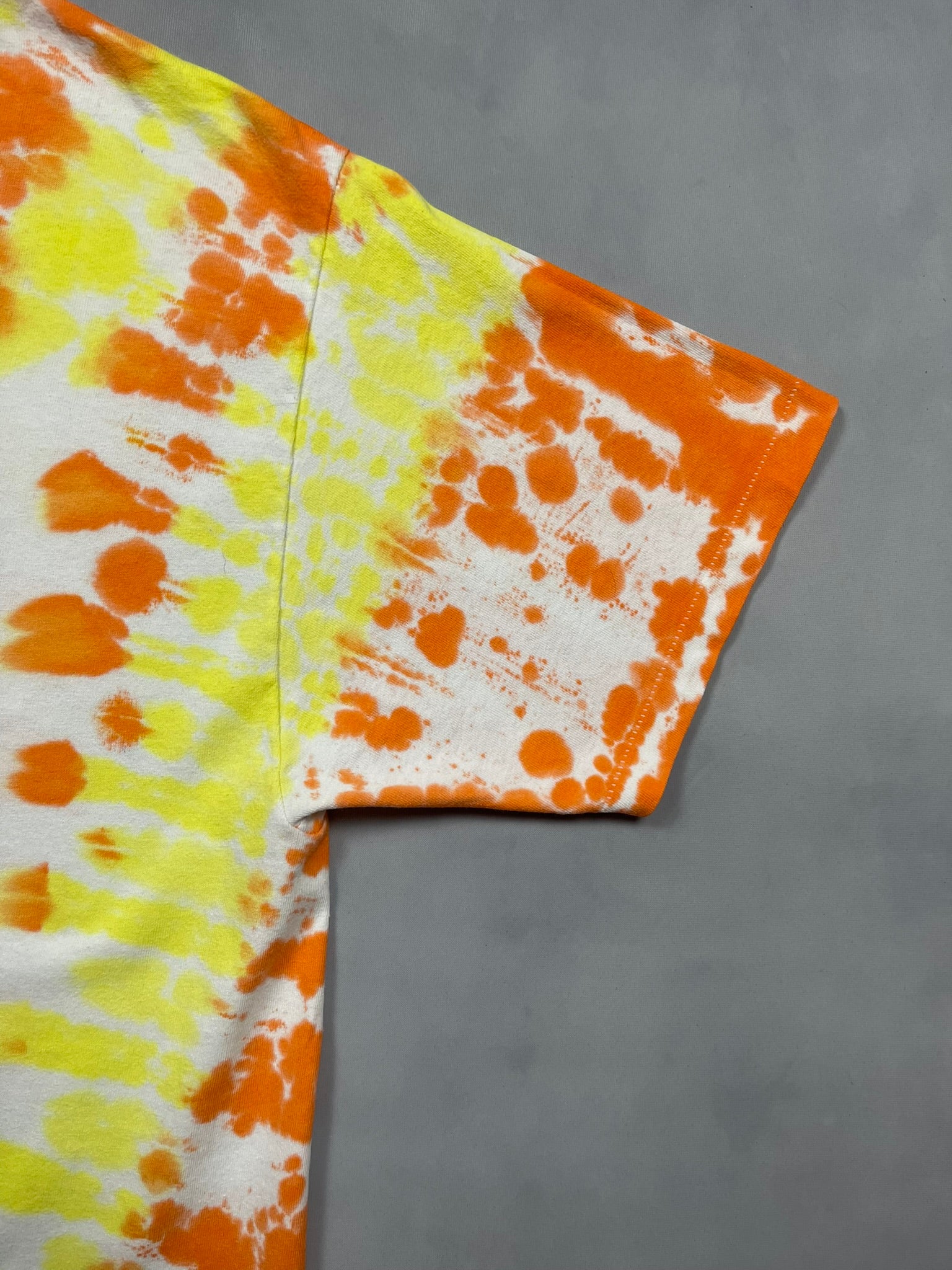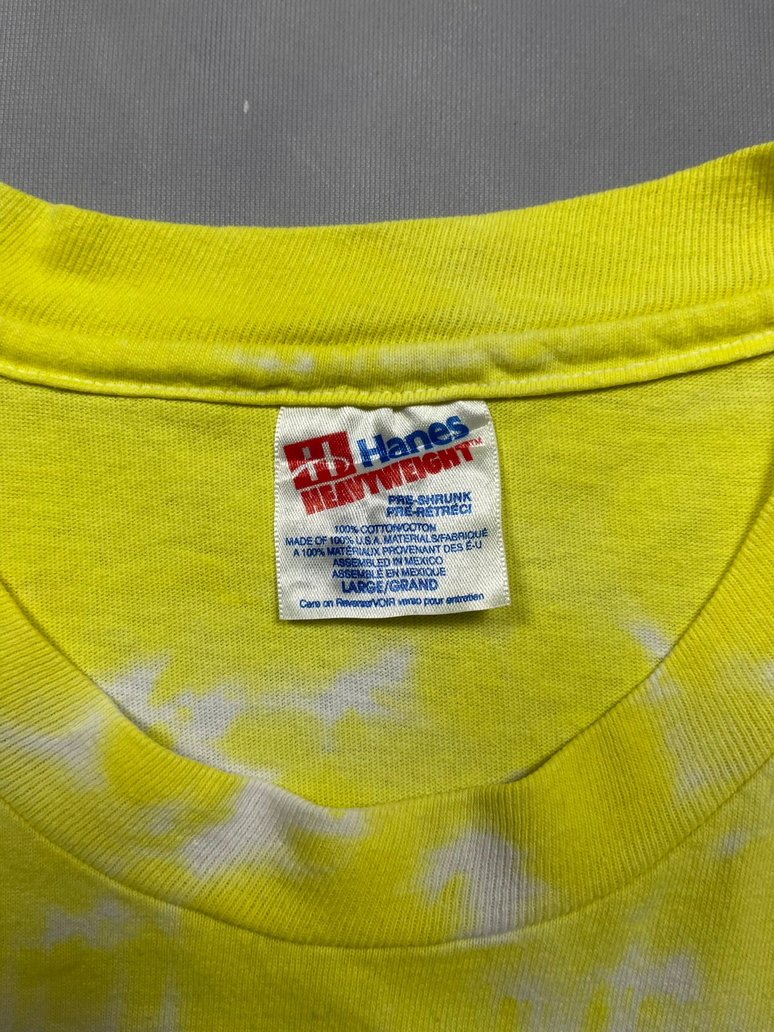 Original 1993 “Let’s Peace It Together” tie-dye tee by Karen M. Perez for Human-i-Tees. This vintage piece radiates 90s energy with its bold orange and yellow spiral dye and peace-forward graphic inspired by the iconic pop art styles of Keith Haring. Printed on a Hanes Heavyweight tag, made with 100% USA cotton and assembled in Mexico. Features scattered marks and light discoloration as shown, consistent with age and wear. A great wearable statement piece or collectible for fans of 90s activism art, streetwear, or vintage peace graphics.
