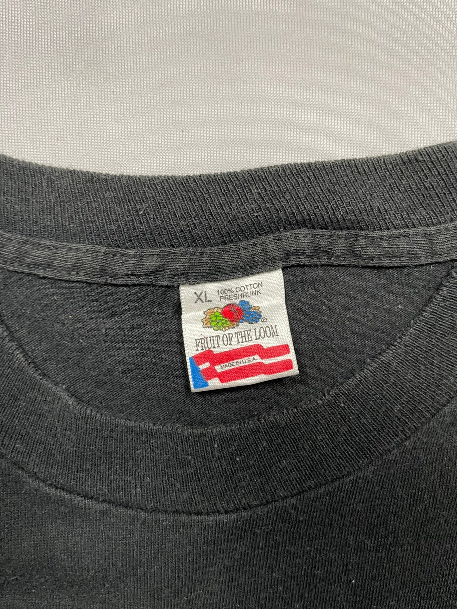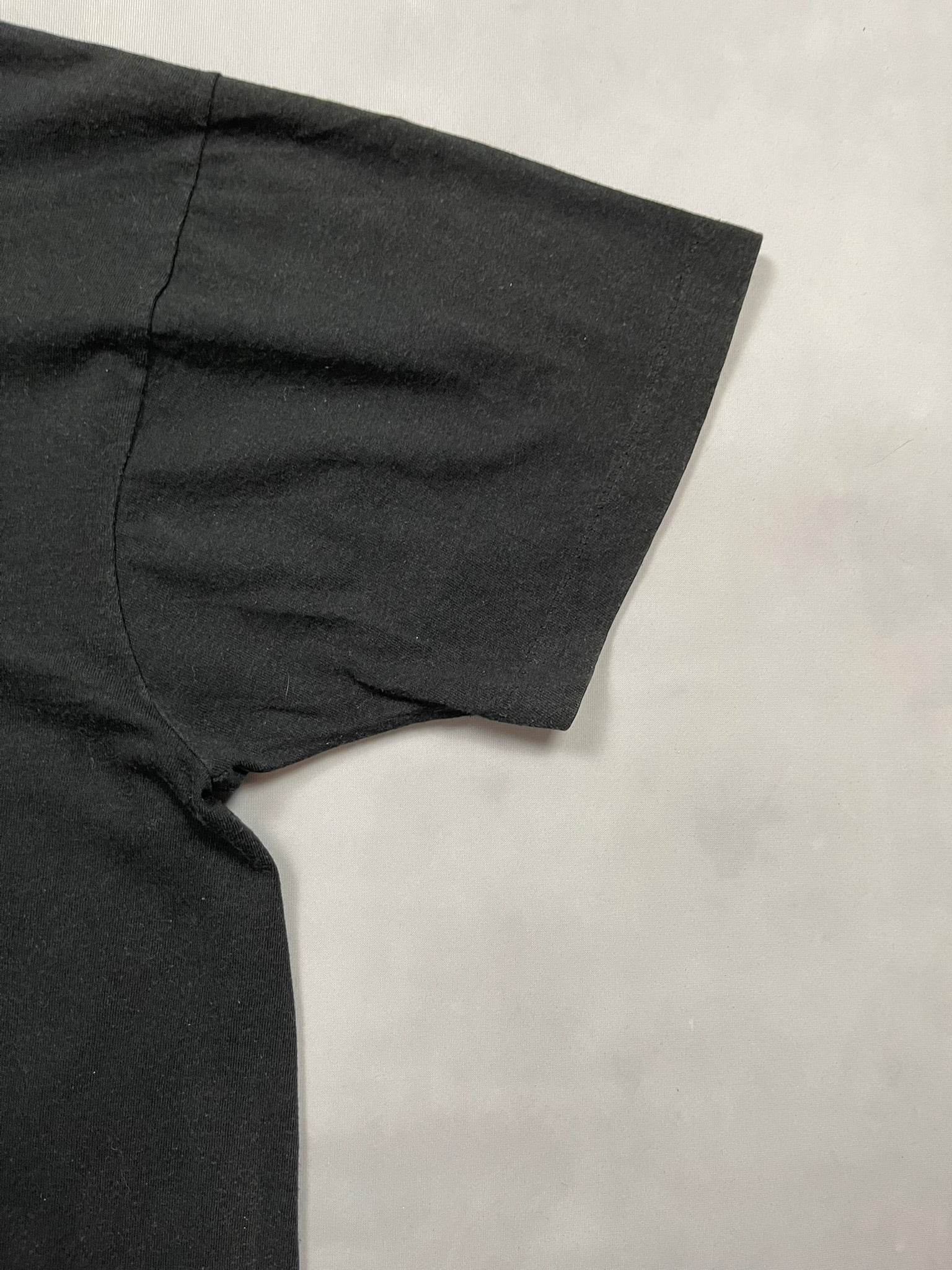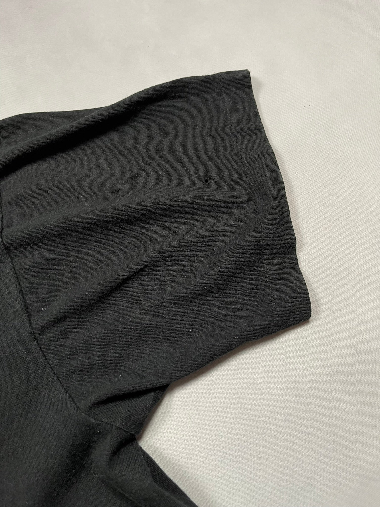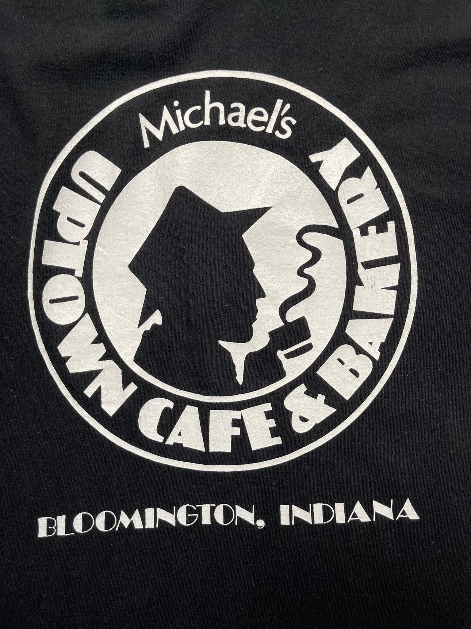 Early 90s promo tee from Michael's Uptown Café & Bakery in Bloomington, Indiana, printed on a black Fruit of the Loom tag and made in USA. Bold white silhouette logo gives it that classic diner merch feel with low-key noir vibes. Soft cotton with a broken-in drape and a small pinhole on the sleeve that adds just the right touch of character. Great pickup for collectors of local business tees or anyone into retro café graphics.