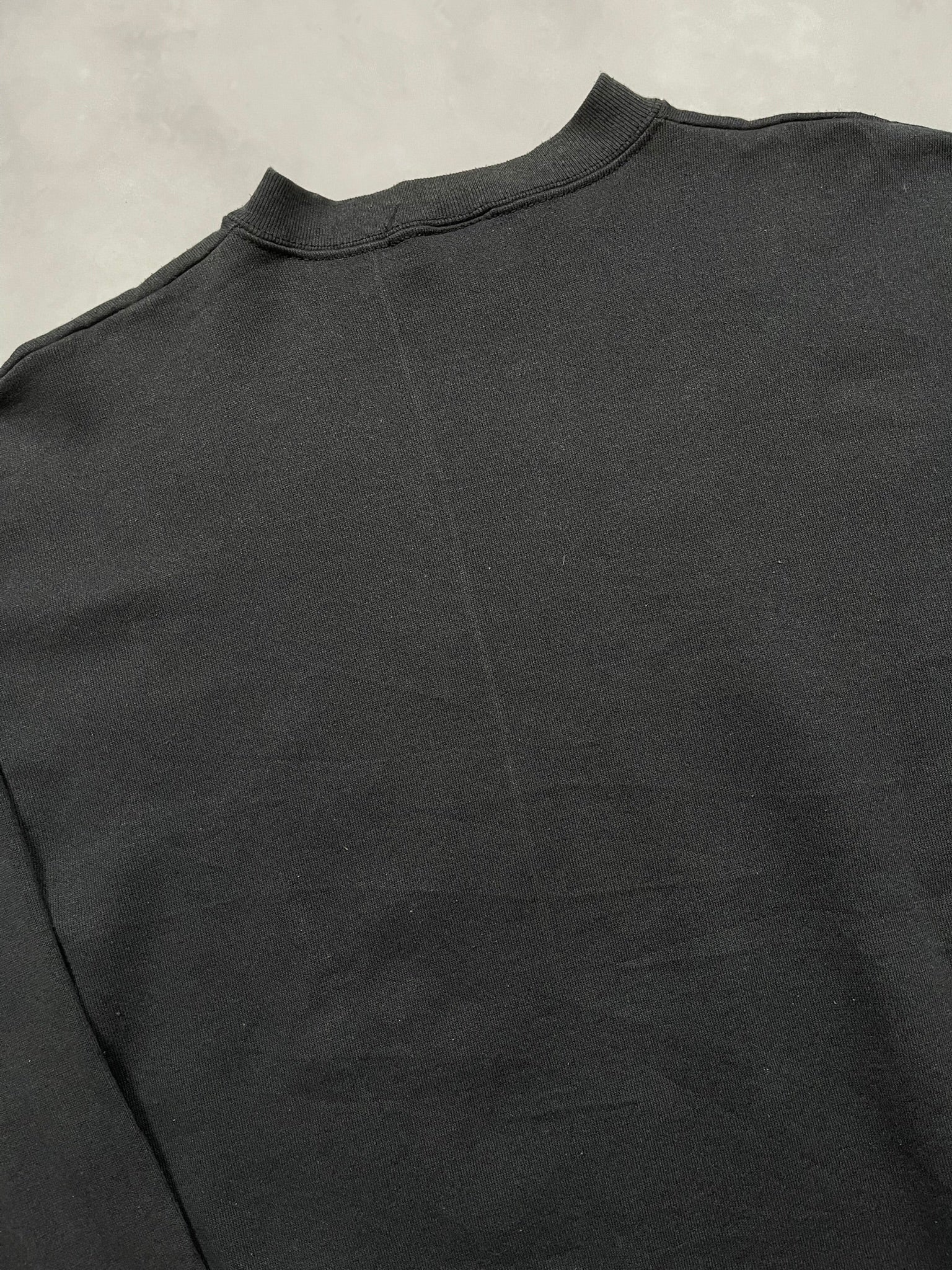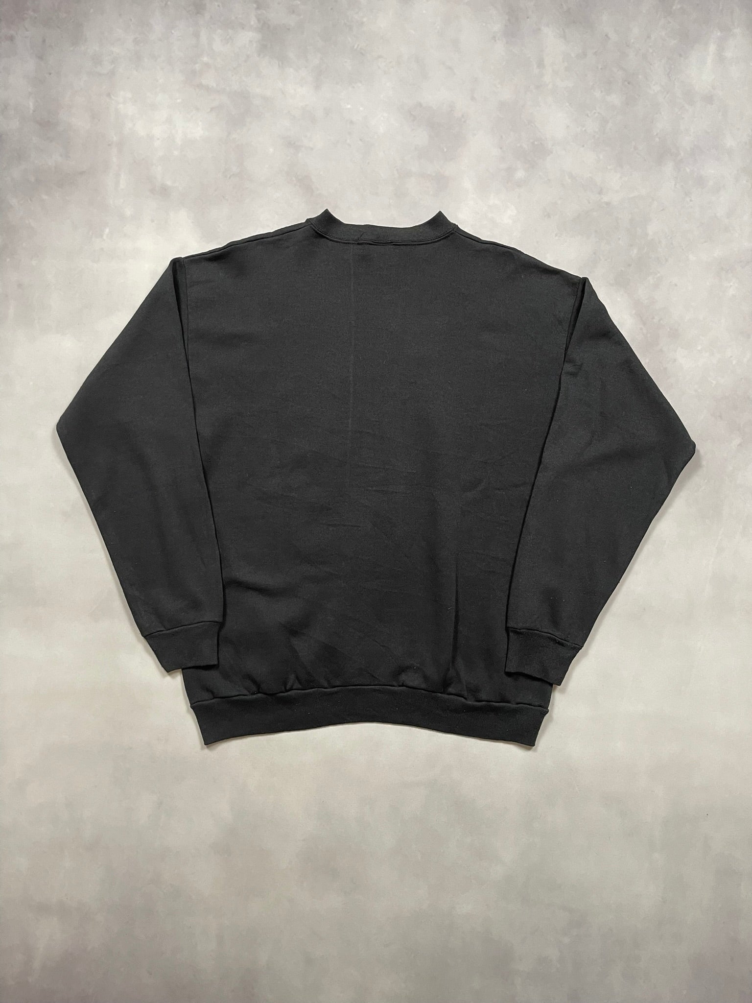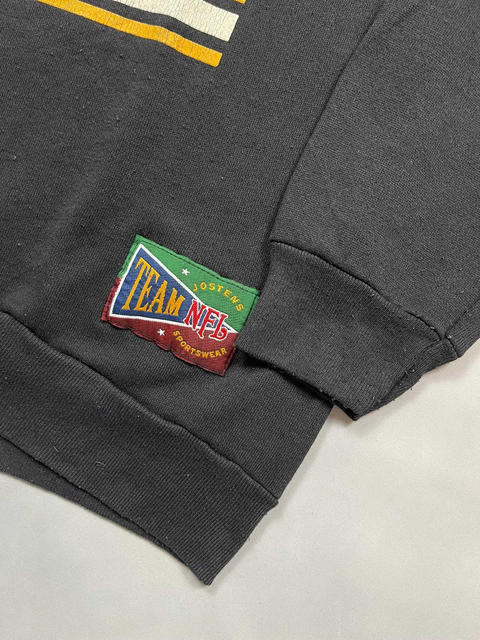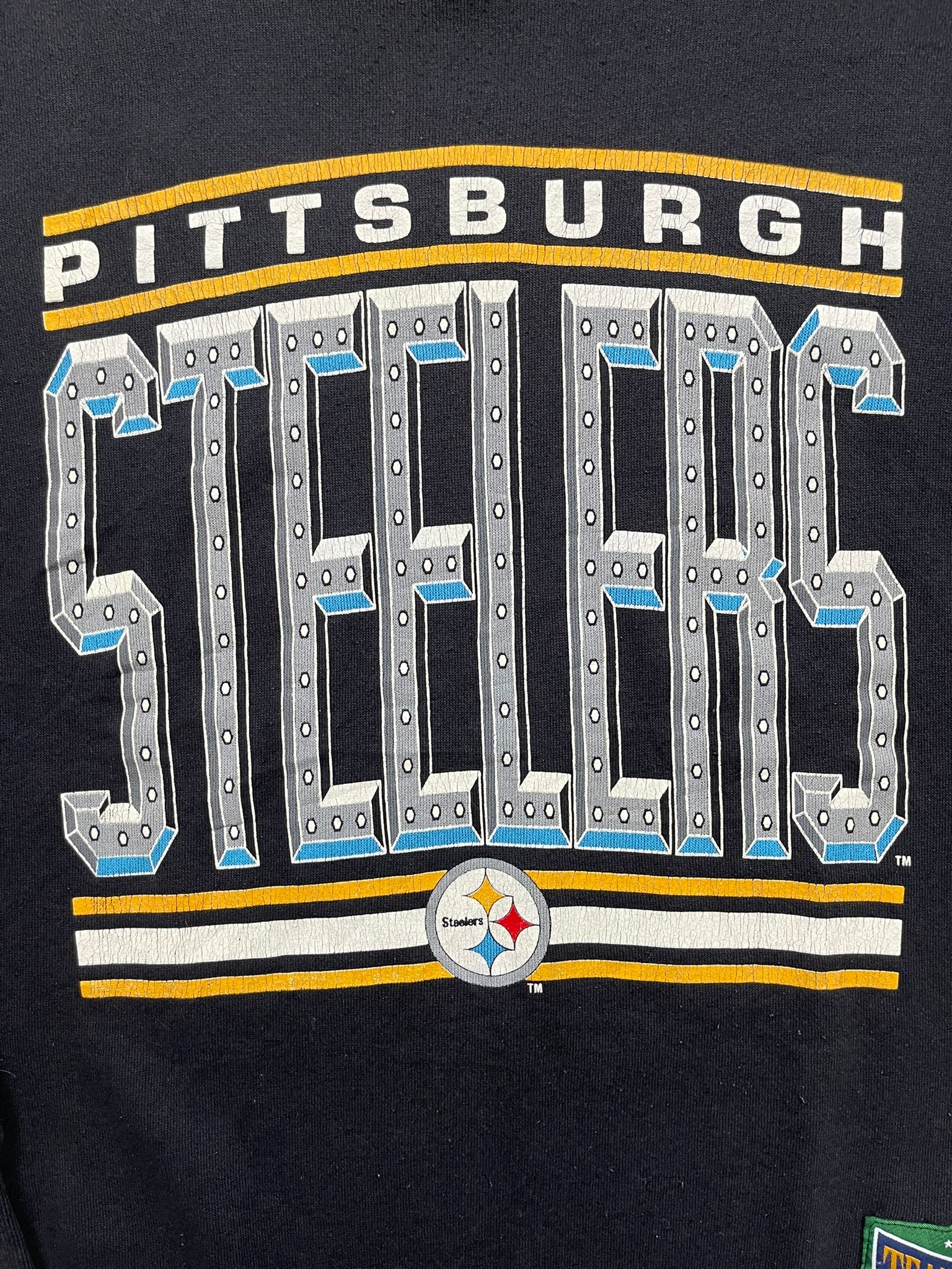 Early 90s Pittsburgh Steelers crewneck sweatshirt with a bold steel plate-style spellout and crisp team logo hit. Officially licensed NFL piece with a Team NFL patch near the hem — classic heavyweight black cotton with a soft interior. Cracked puff print gives it that worn-in vintage look that collectors chase. Solid grab for fans of 90s NFL gear, vintage Pittsburgh Steelers merch, or old-school sports sweatshirts. On a made in USA Jostens tag.