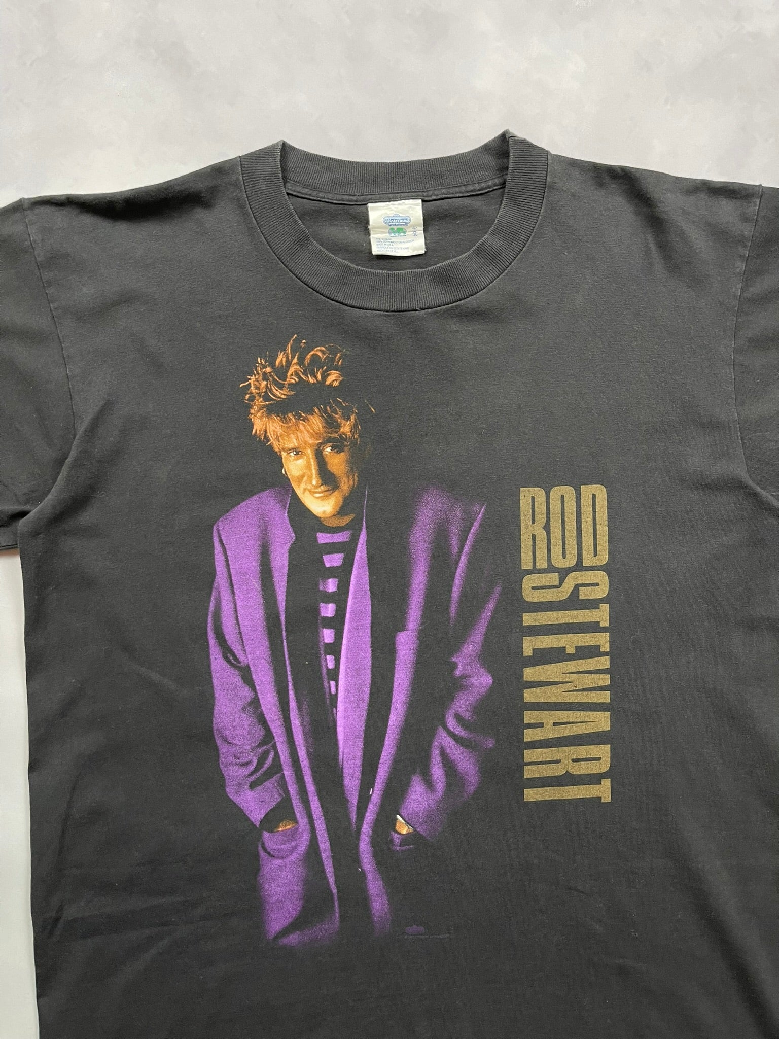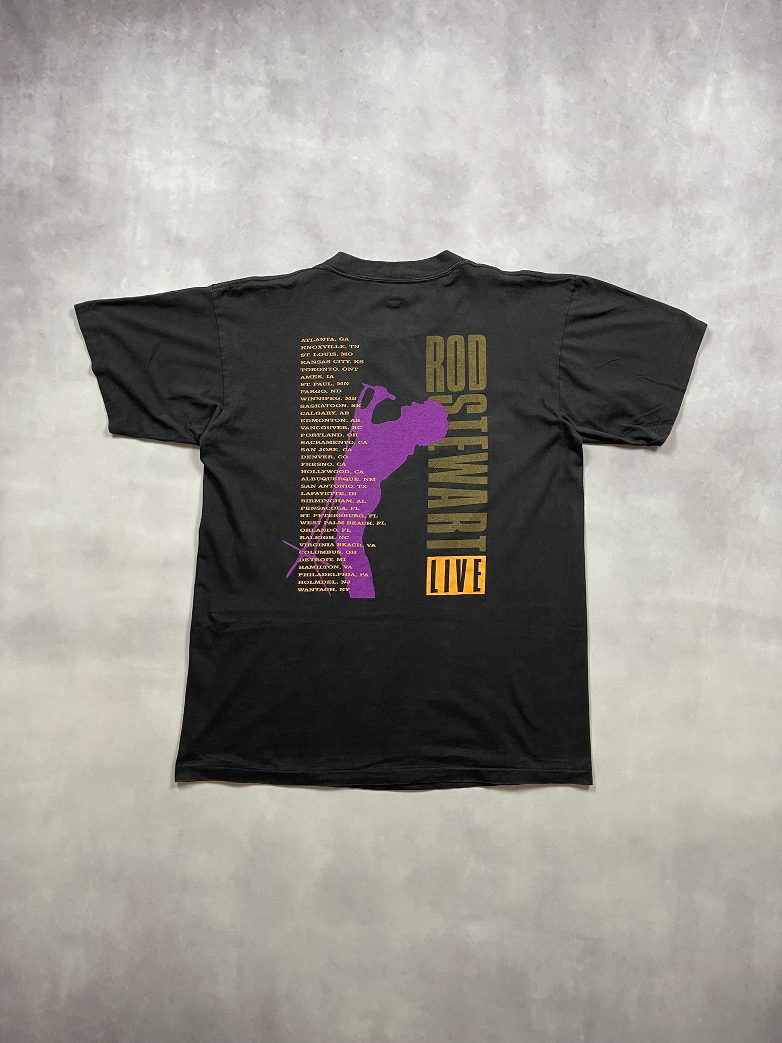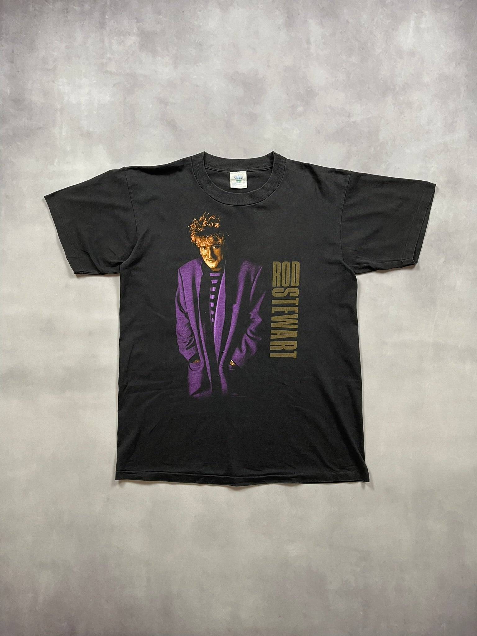 Original Rod Stewart tour tee from 1991 featuring a standout double-sided design with a full-color portrait of Rod in a purple blazer on the front and an iconic silhouette with full tour dates on the back. The vertical gold and purple “Rod Stewart Live” text gives it that bold early ‘90s stage merch energy. Printed on a Vintedge tag, 100% cotton, made in the USA, with single stitch construction throughout. A must for collectors of vintage rock tees, 90s tour merch, or anyone looking for an authentic piece of music history with style and edge.