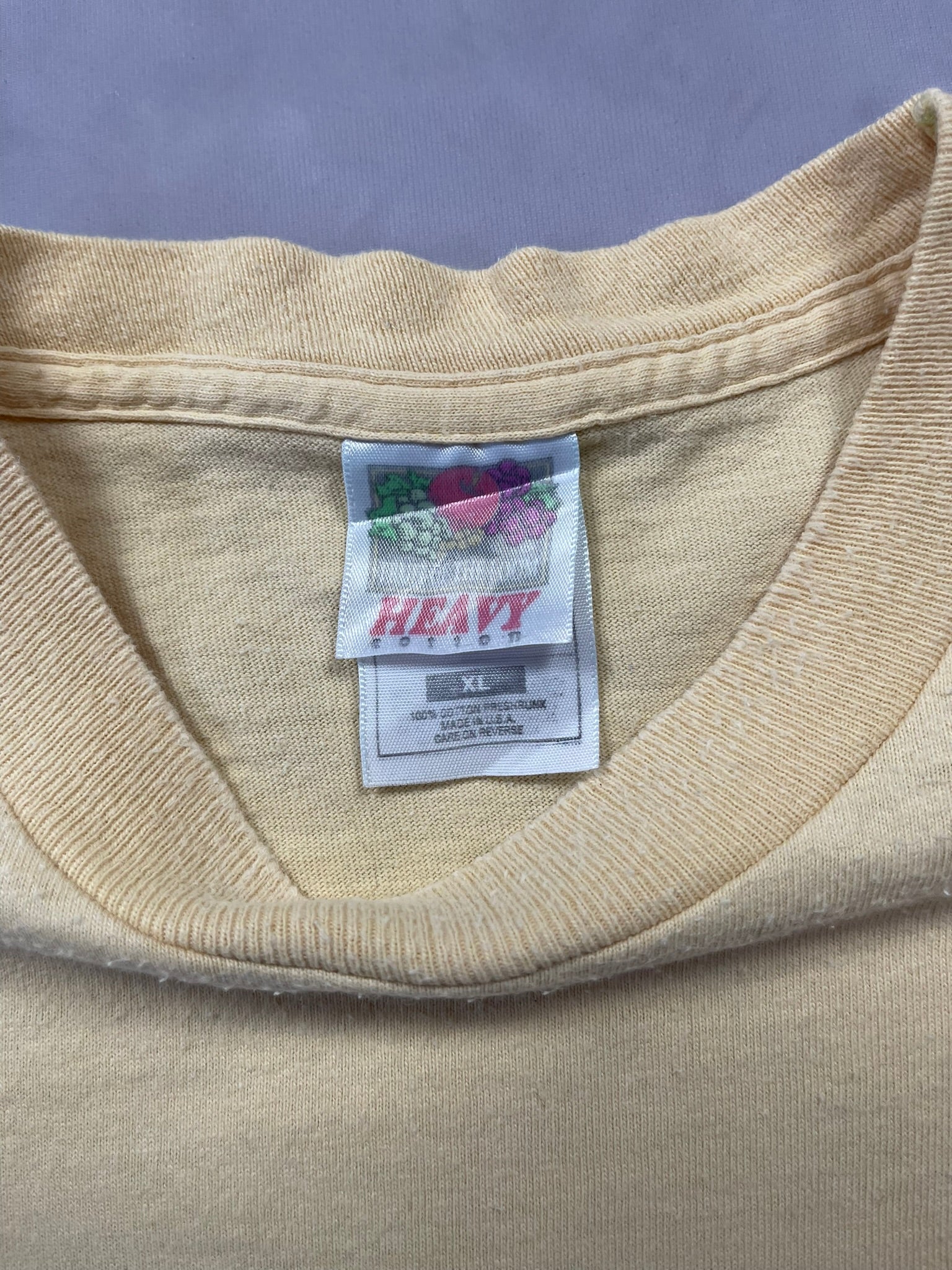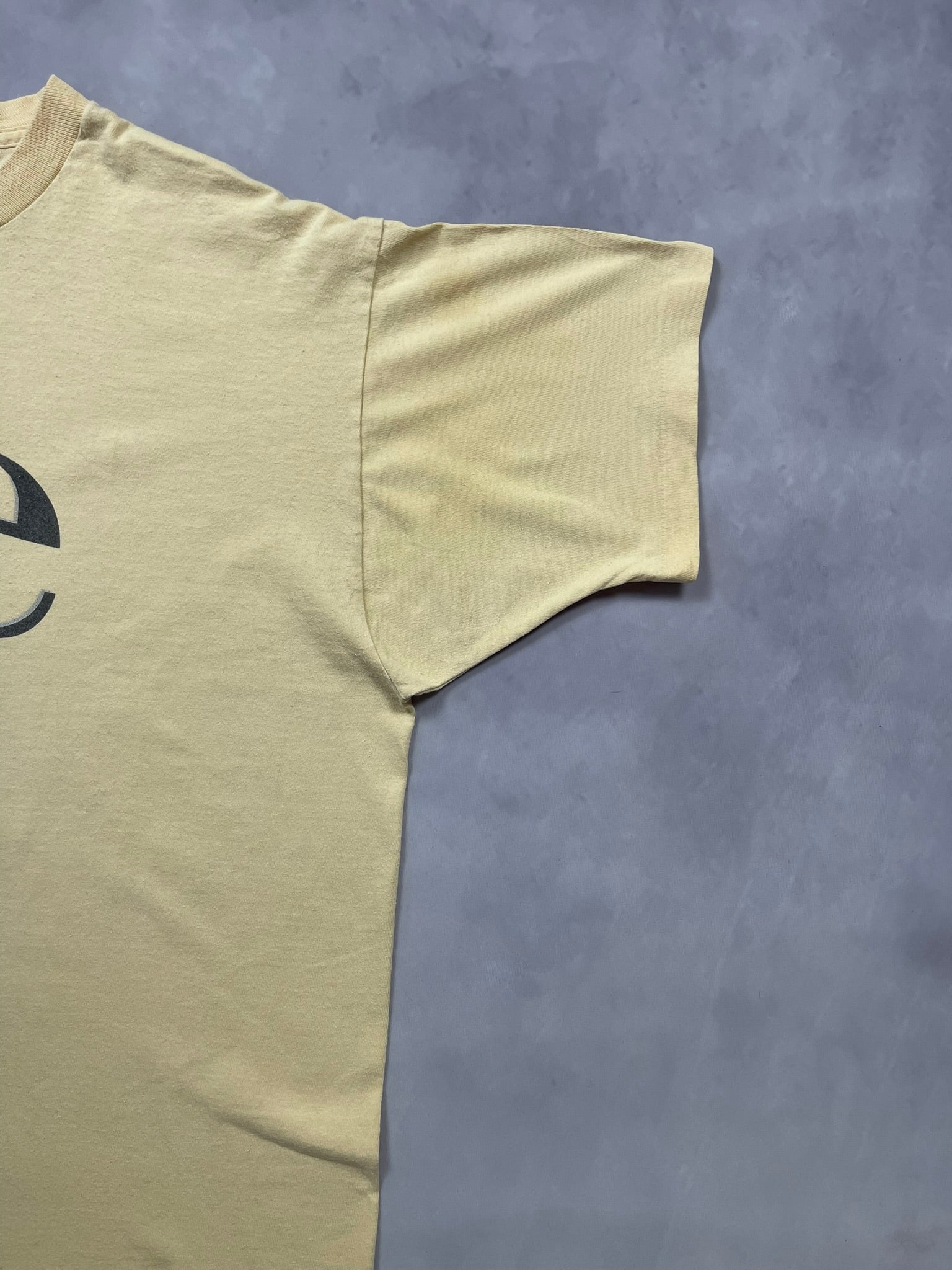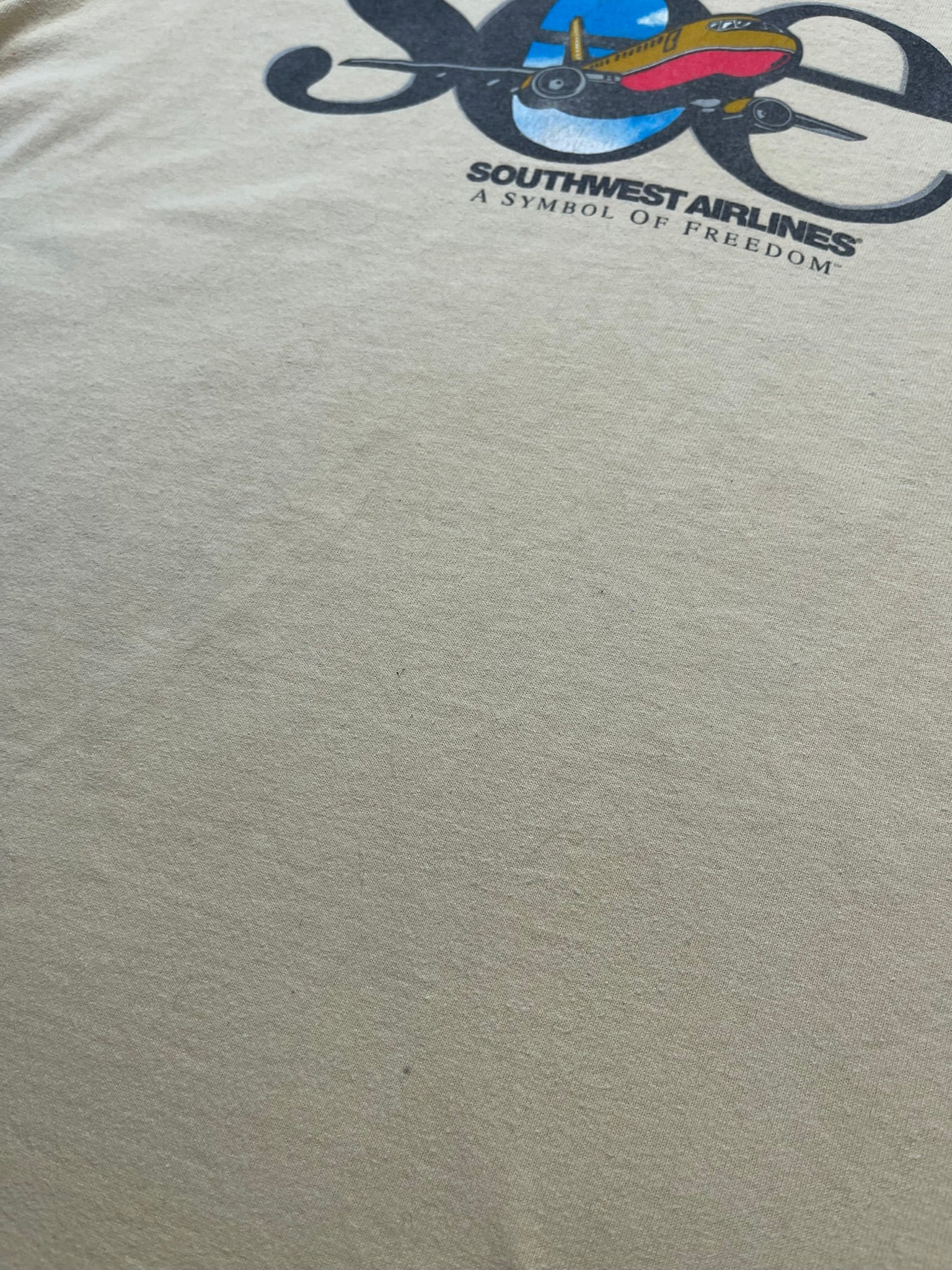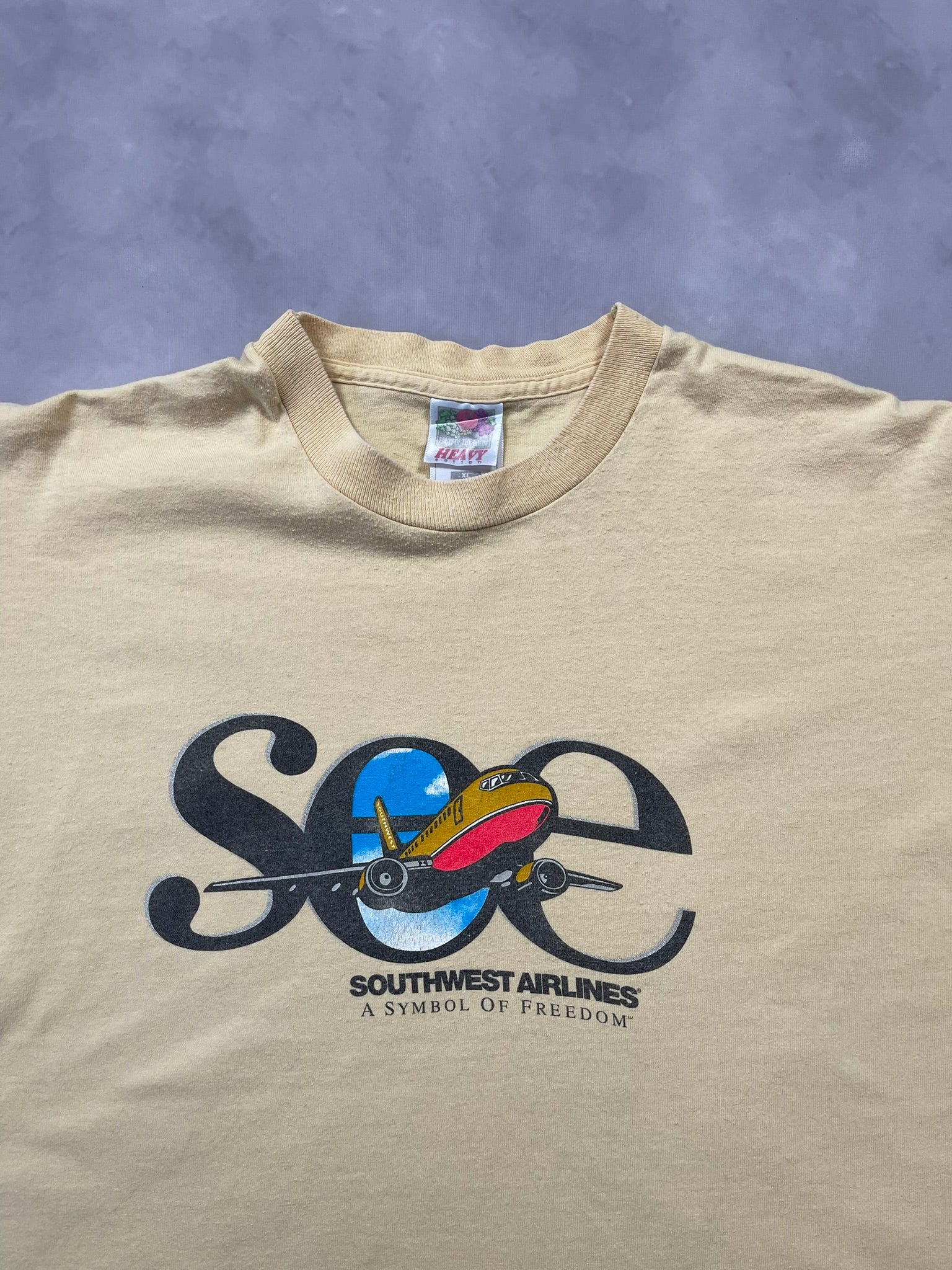 Late 90s to early 2000s Southwest Airlines “SEE – A Symbol of Freedom” tee on a pale yellow Fruit of the Loom Heavy Cotton blank, made in USA. Features the iconic desert gold and red plane graphic over bold black type — a nod to the airline’s long-running freedom-focused ad campaigns from the era. Softly worn with natural age toning, perfect for aviation collectors, promo tee fans, or anyone into vintage airline and travel merch.