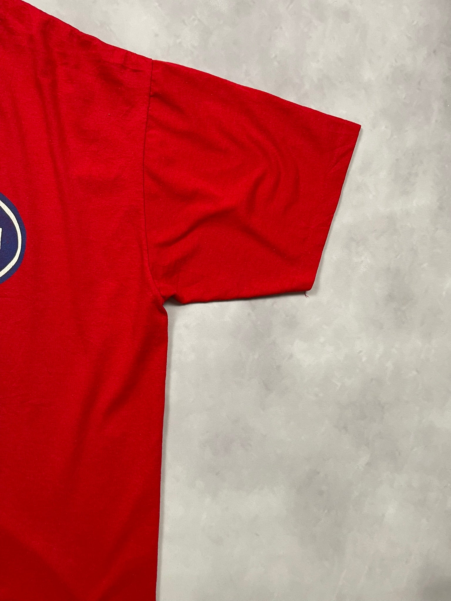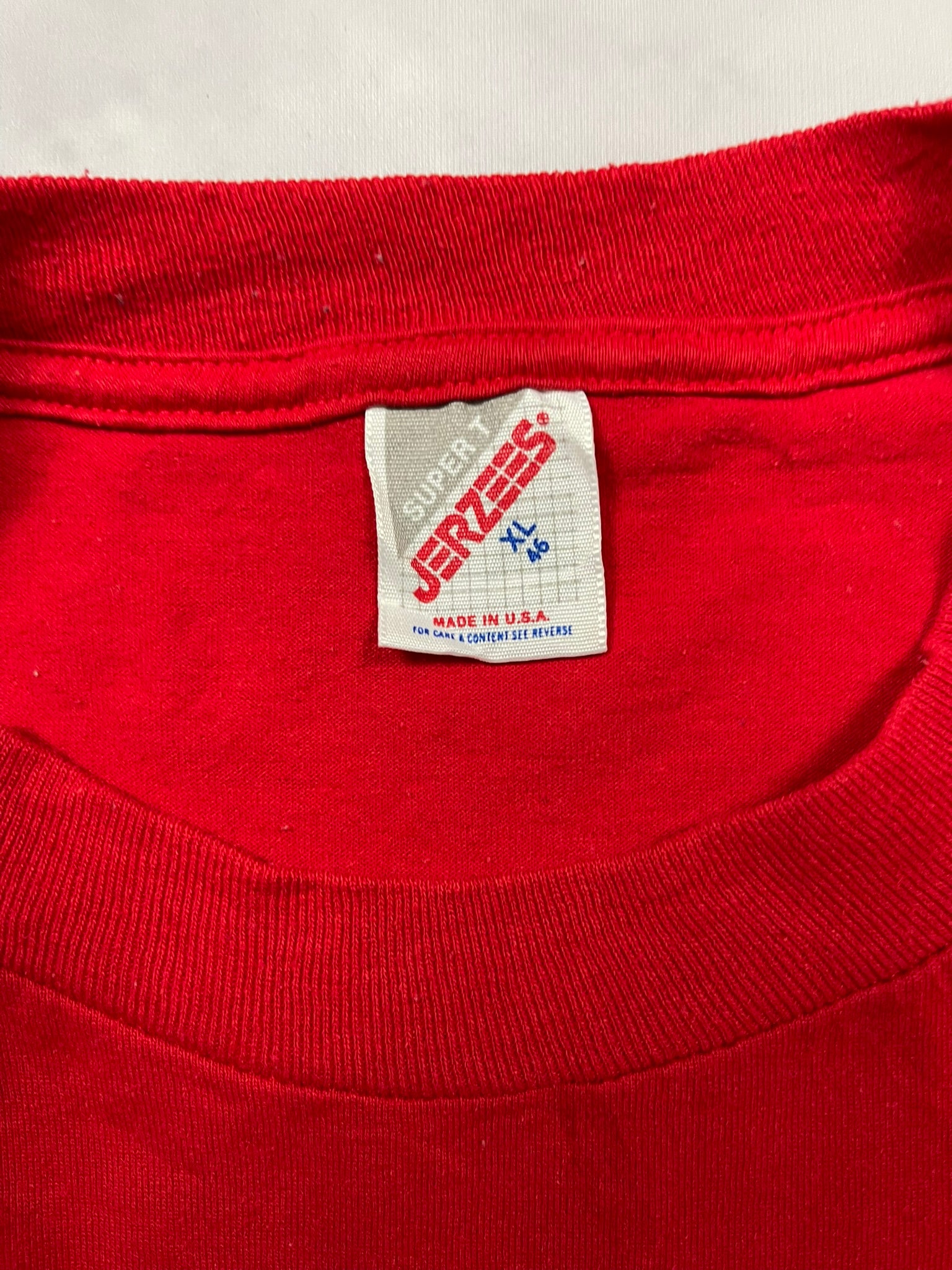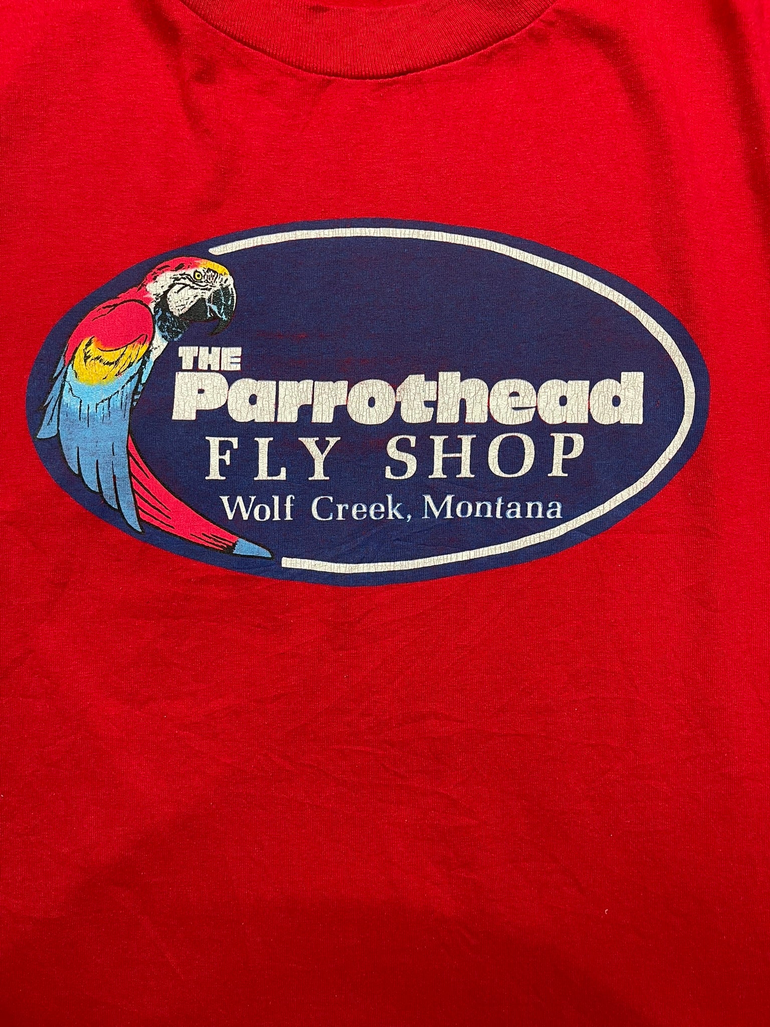 Early 90s Parrothead Fly Shop tee out of Wolf Creek, Montana — bold red on a Super Jerzees tag, made in USA. Oversized oval logo hit with a parrot graphic and puff print text for that classic tourist shirt energy. Great pickup for collectors of fly fishing tees, small-town outfitter merch, or anyone into niche regional graphics. Keywords: 90s souvenir shirt, fishing tee, made in USA, novelty graphic, puff print.