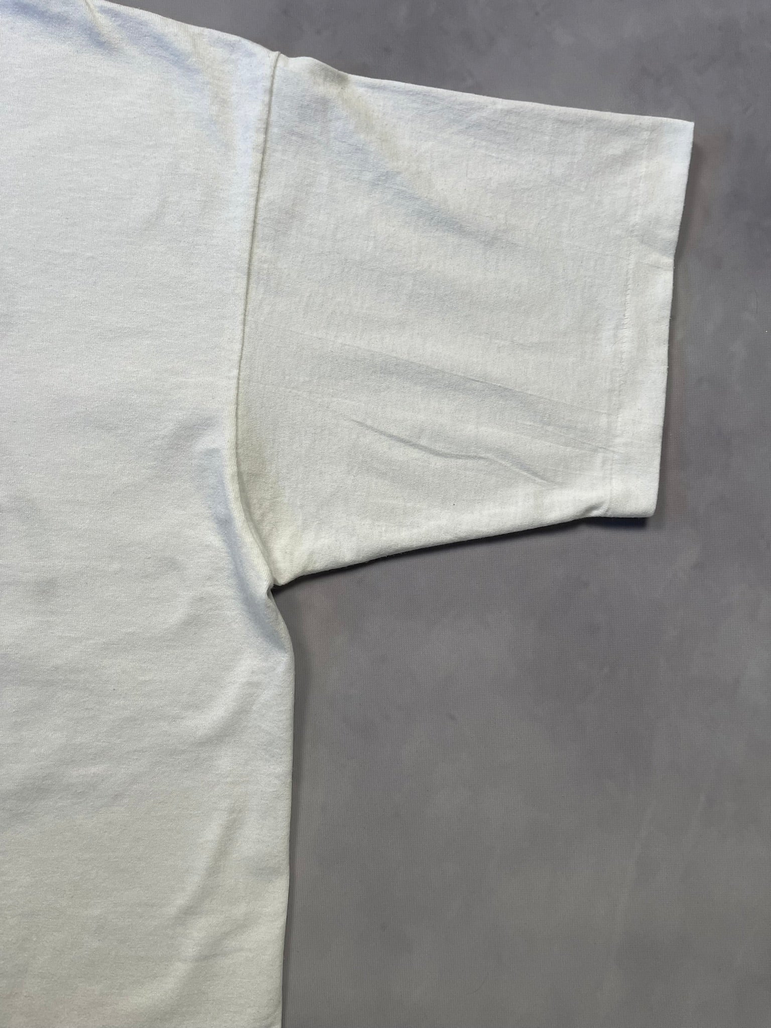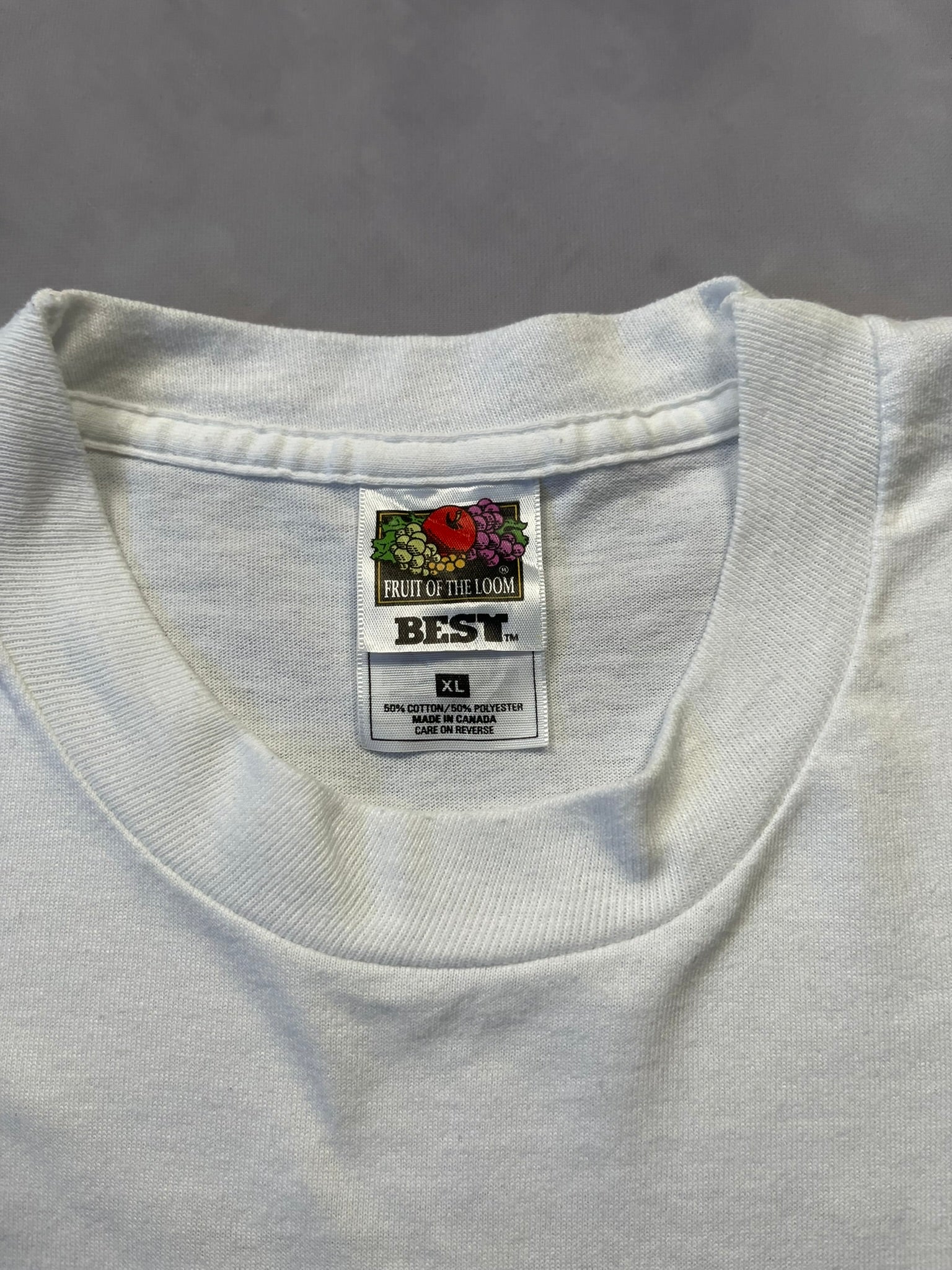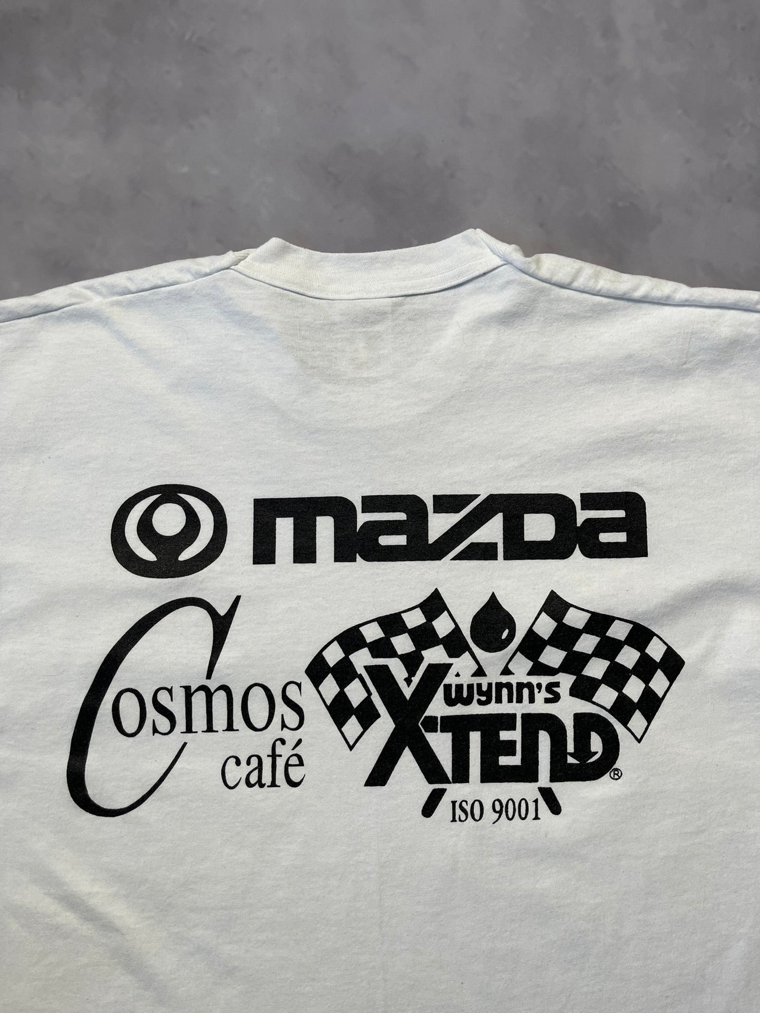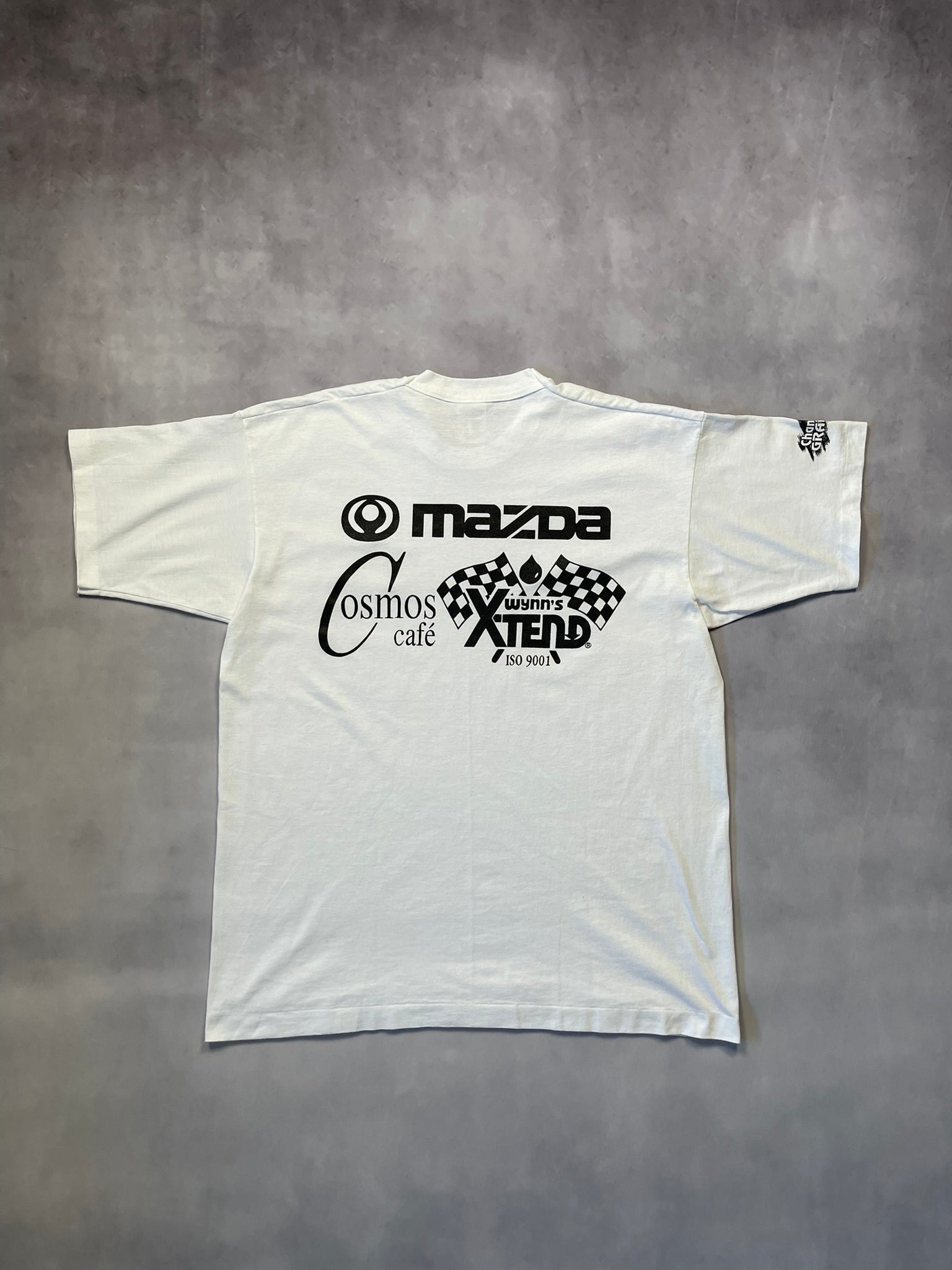 Early 90s Theetge Motorsports promo tee with clean monochrome sponsor hits — Mazda, Wynn’s Xtend, and Cosmos Café on the back with checkered flag flair. Front chest graphic keeps it classic with a sharp racing font and team number 16. Printed on a Canadian-made Fruit of the Loom BEST tag, soft 50/50 blend with that broken-in feel. Great pickup for vintage motorsport fans or racing crew tee collectors.