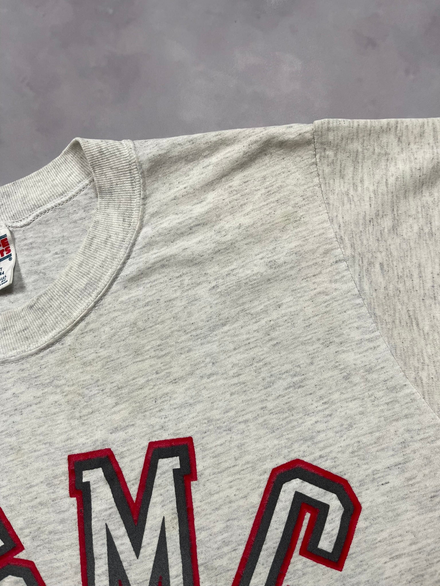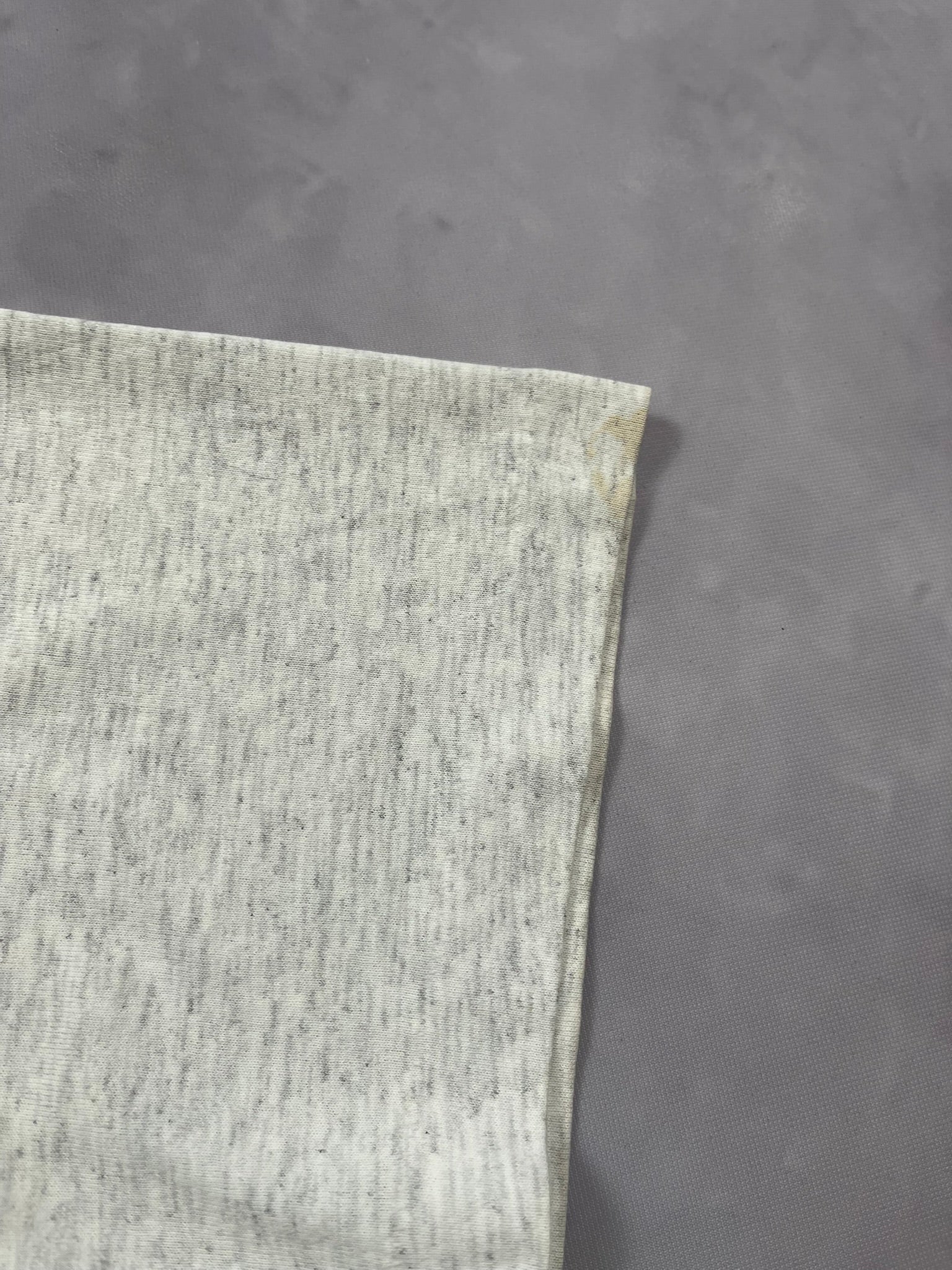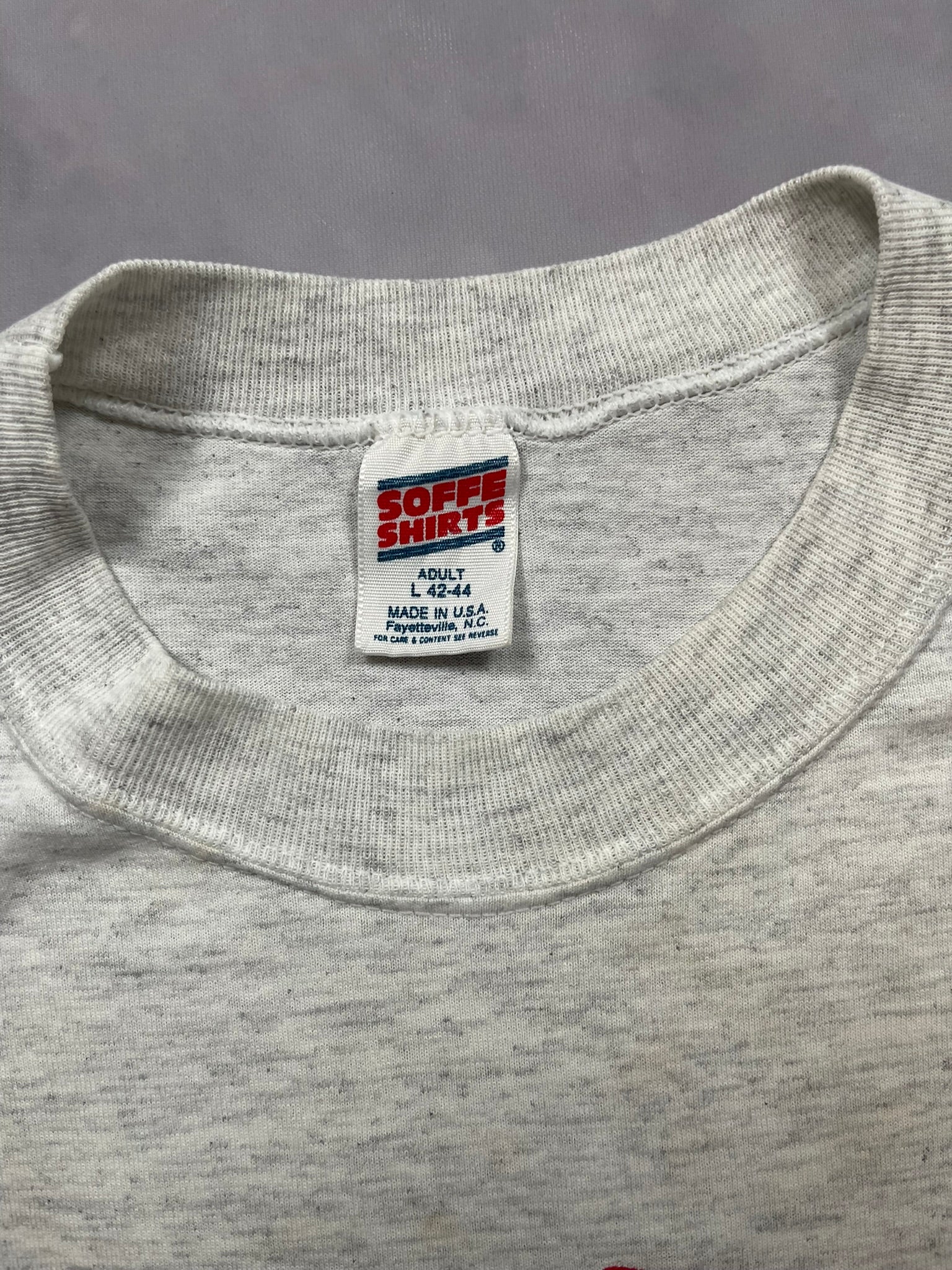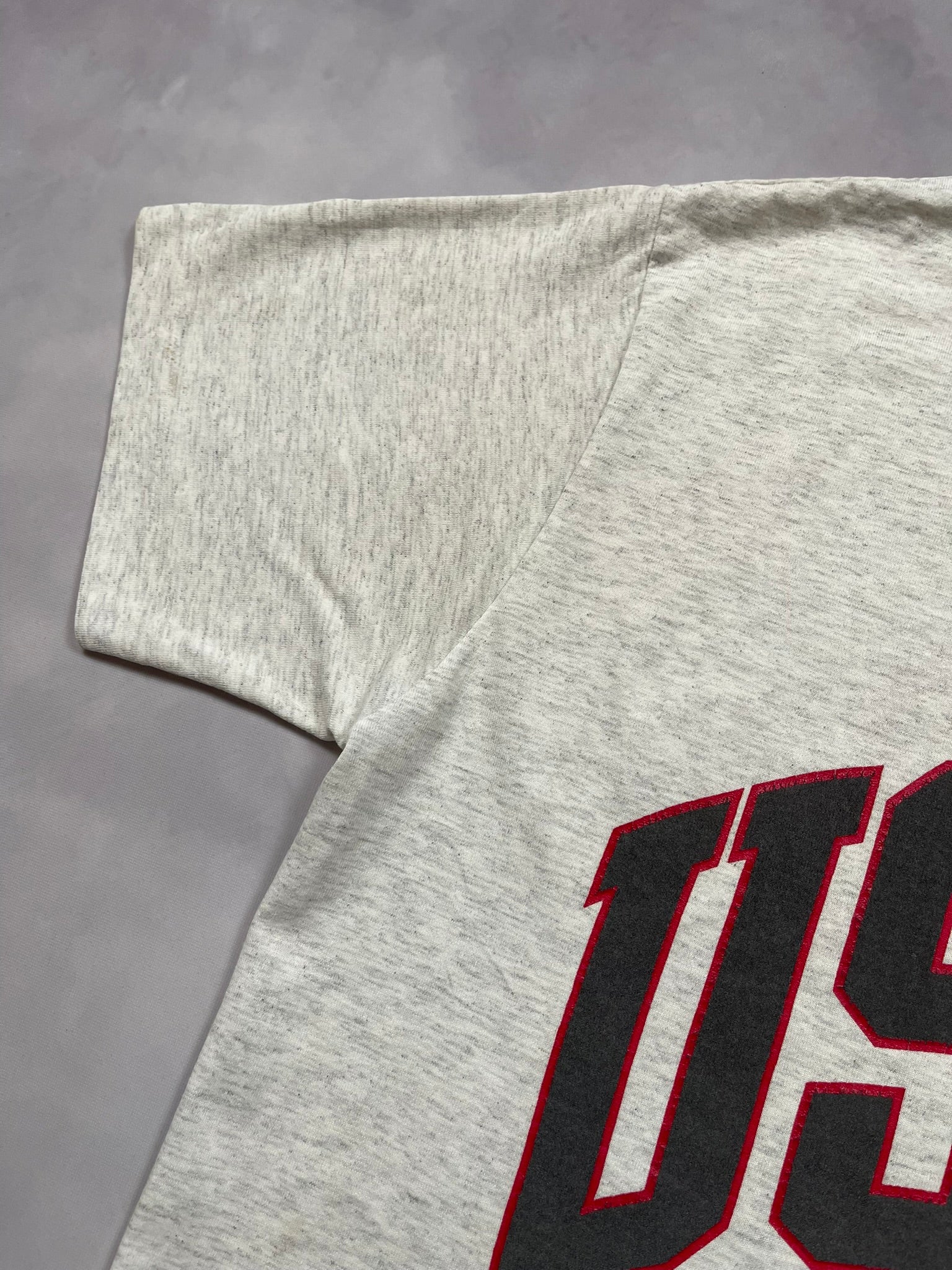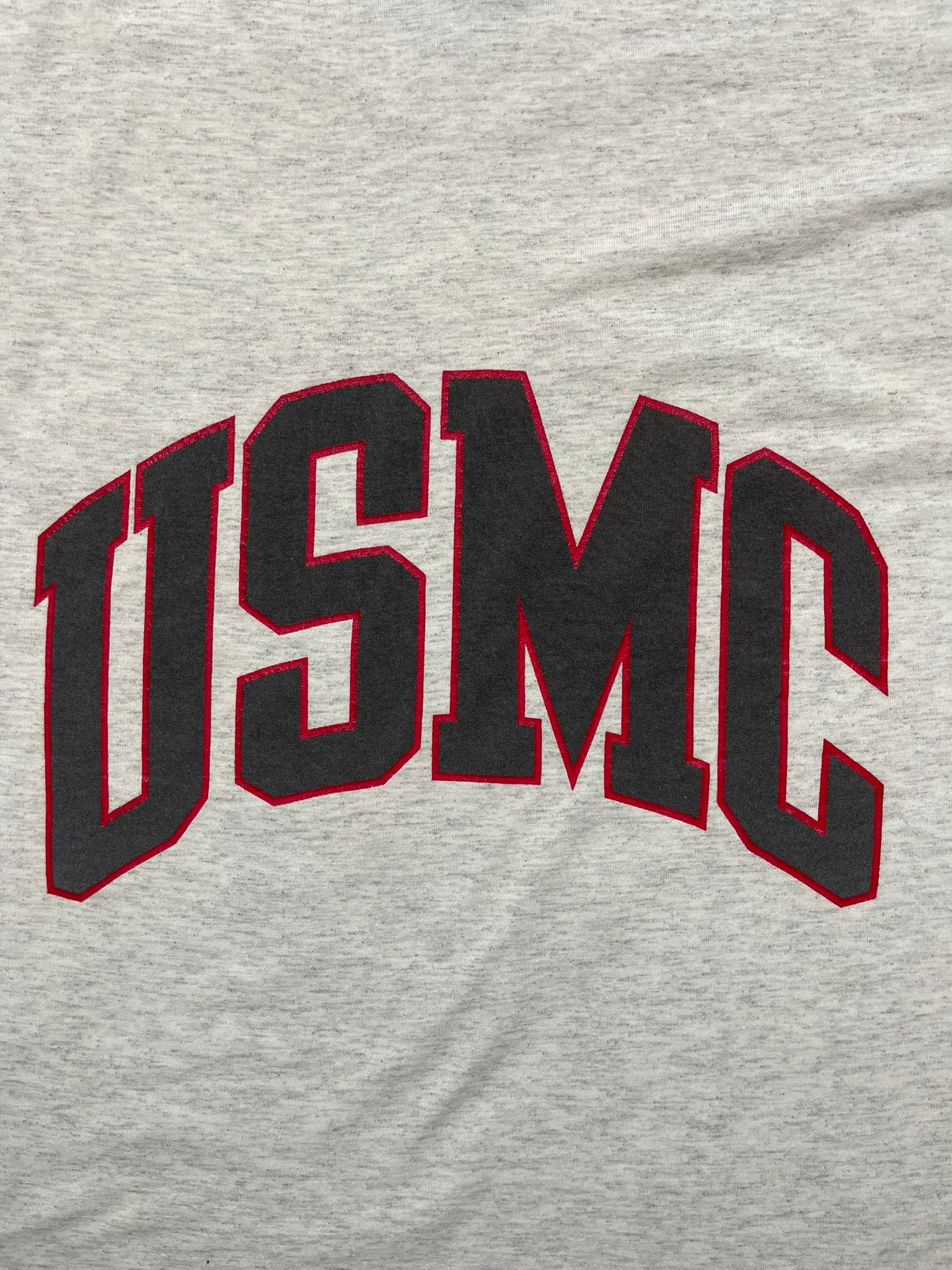 Mid to late 90s USMC t-shirt on a heather grey Soffe Shirts tag, made in USA. Classic double-sided Marine Corps print with bold arched USMC lettering front and back, plus the Eagle, Globe & Anchor emblem in red and black. Clean, military-issue style with a strong athletic cut and soft cotton-poly blend. Solid grab for collectors of vintage USMC gear, 90s military tees, or Made in USA basics with timeless appeal.