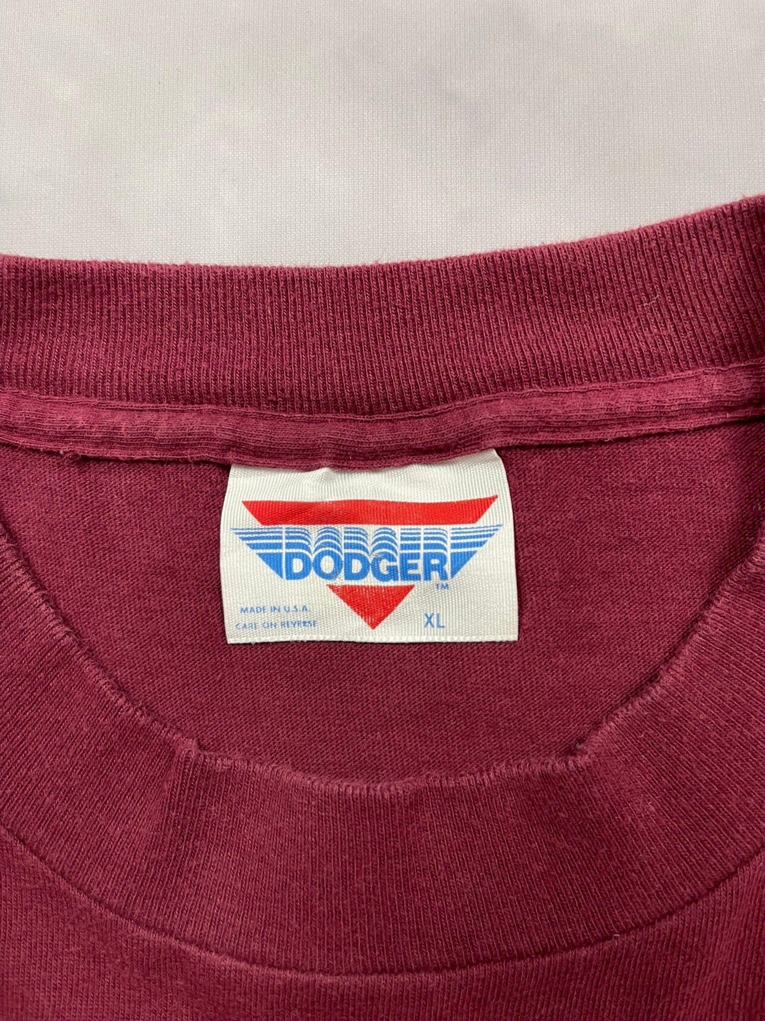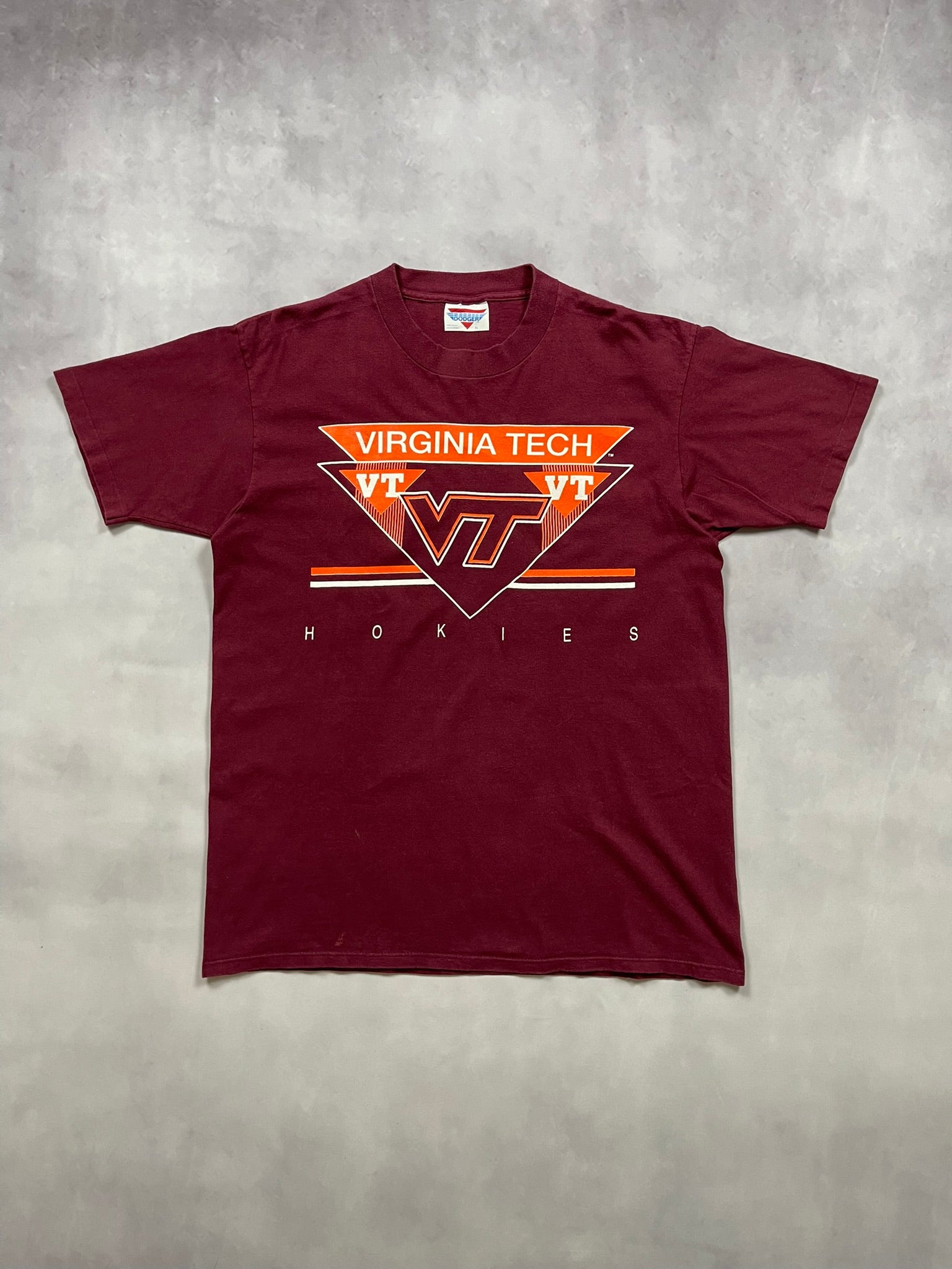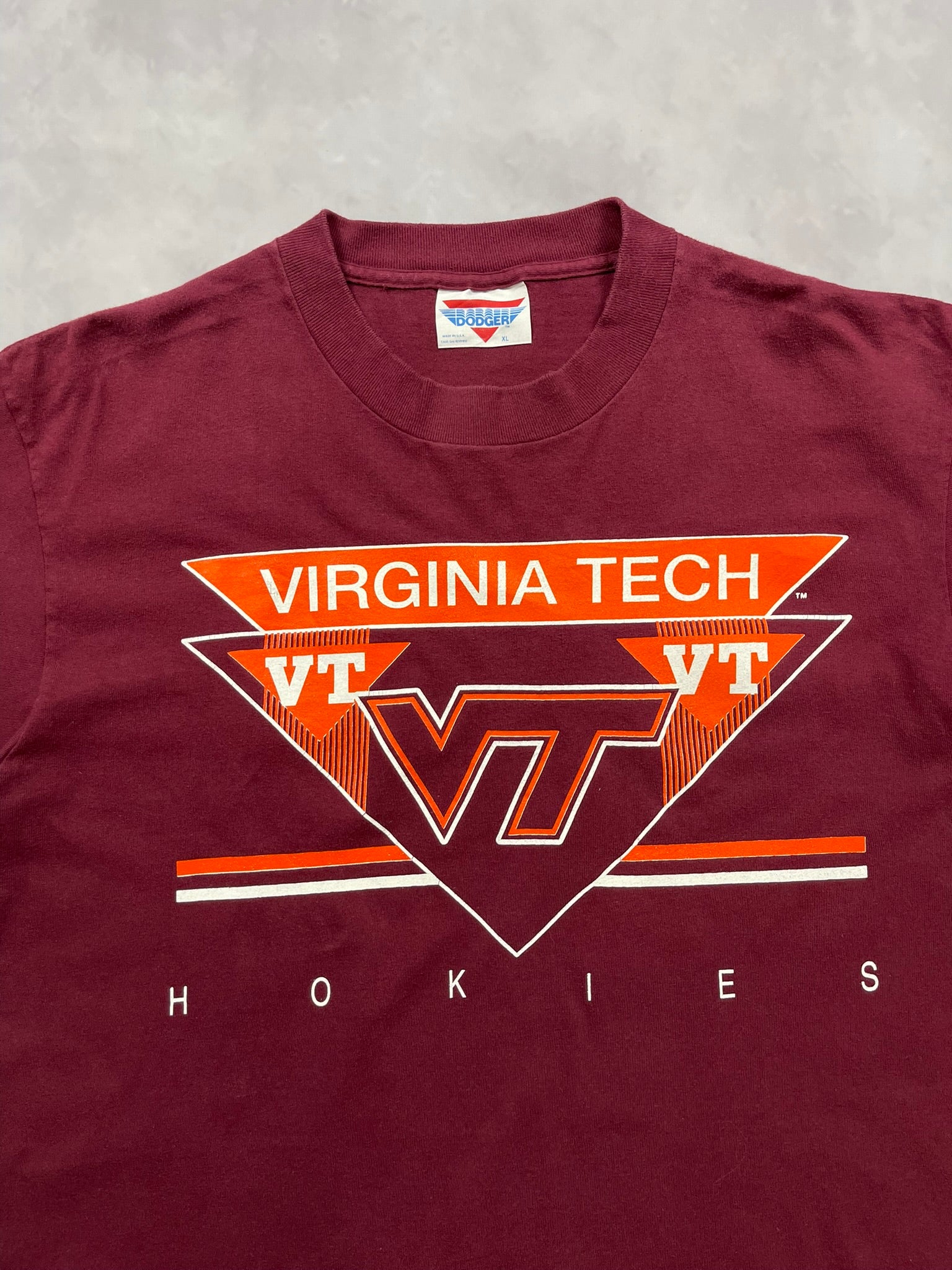 Classic 1990s Virginia Tech tee featuring a bold maroon and orange VT logo front and center, framed by sharp collegiate styling and the Hokies name spelled out across the bottom. This piece represents that golden era of NCAA fan gear, when college pride met heavyweight screenprinting and standout type design. Printed on a Dodger tag, made in USA, and tagged XL, this one features double-stitched hems, single-stitched sleeves and that sturdy vintage cotton feel. Perfect for Hokies fans, vintage sportswear collectors, or anyone after a clean and authentic 90s college tee with strong graphic presence.