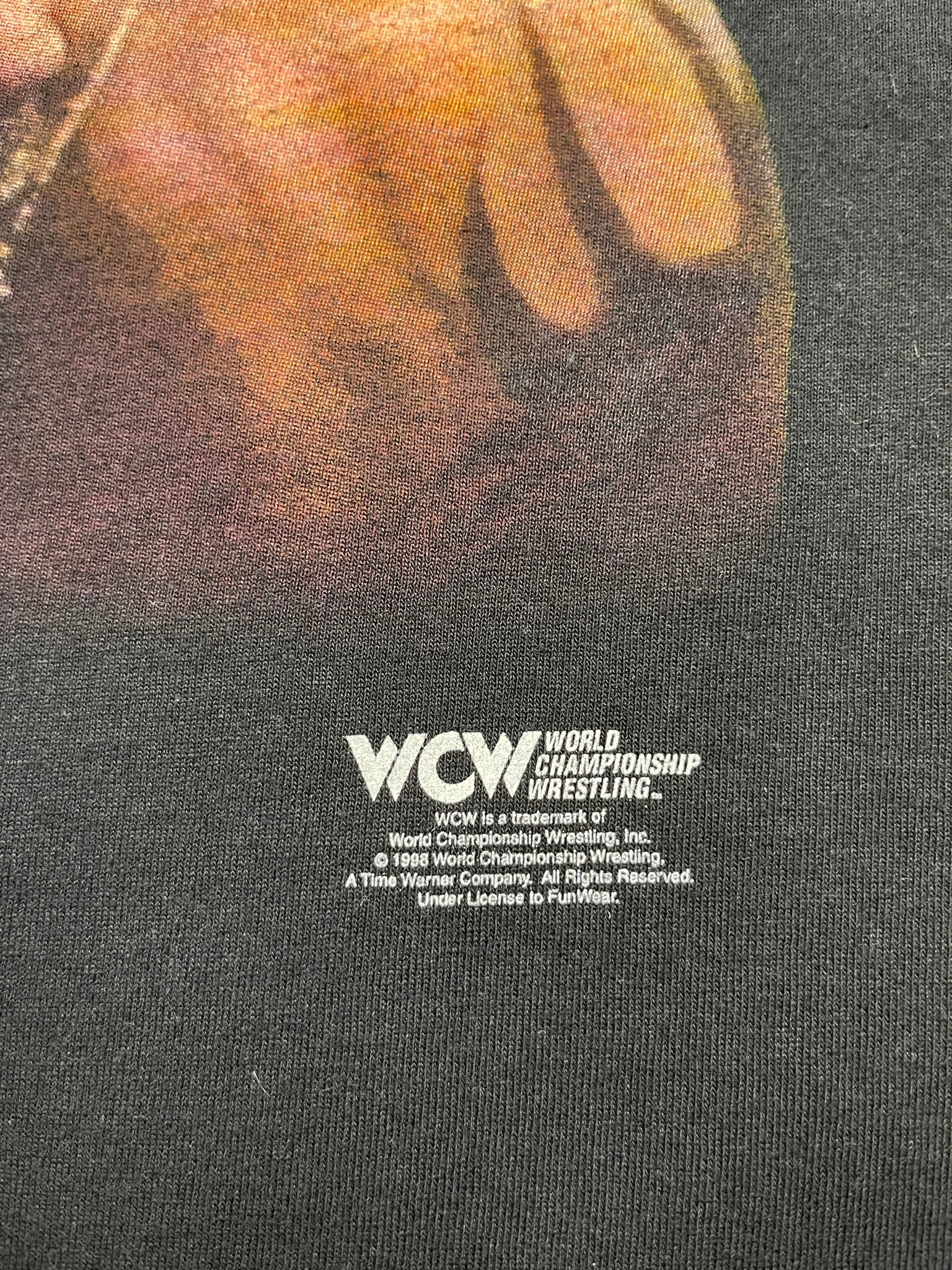 Original 1998 Goldberg wrestling tee from the peak WCW era with bold graphic and signature hit front and center. Officially licensed on a WCW tag, soft black cotton with single stitch construction and that true vintage fade. Perfect piece for fans of late 90s wrestling, Goldberg collectors, or anyone after a heavyweight 90s wrestling tee with iconic Attitude Era energy. Minor pinhole near the hem adds to the authentic worn-in look.