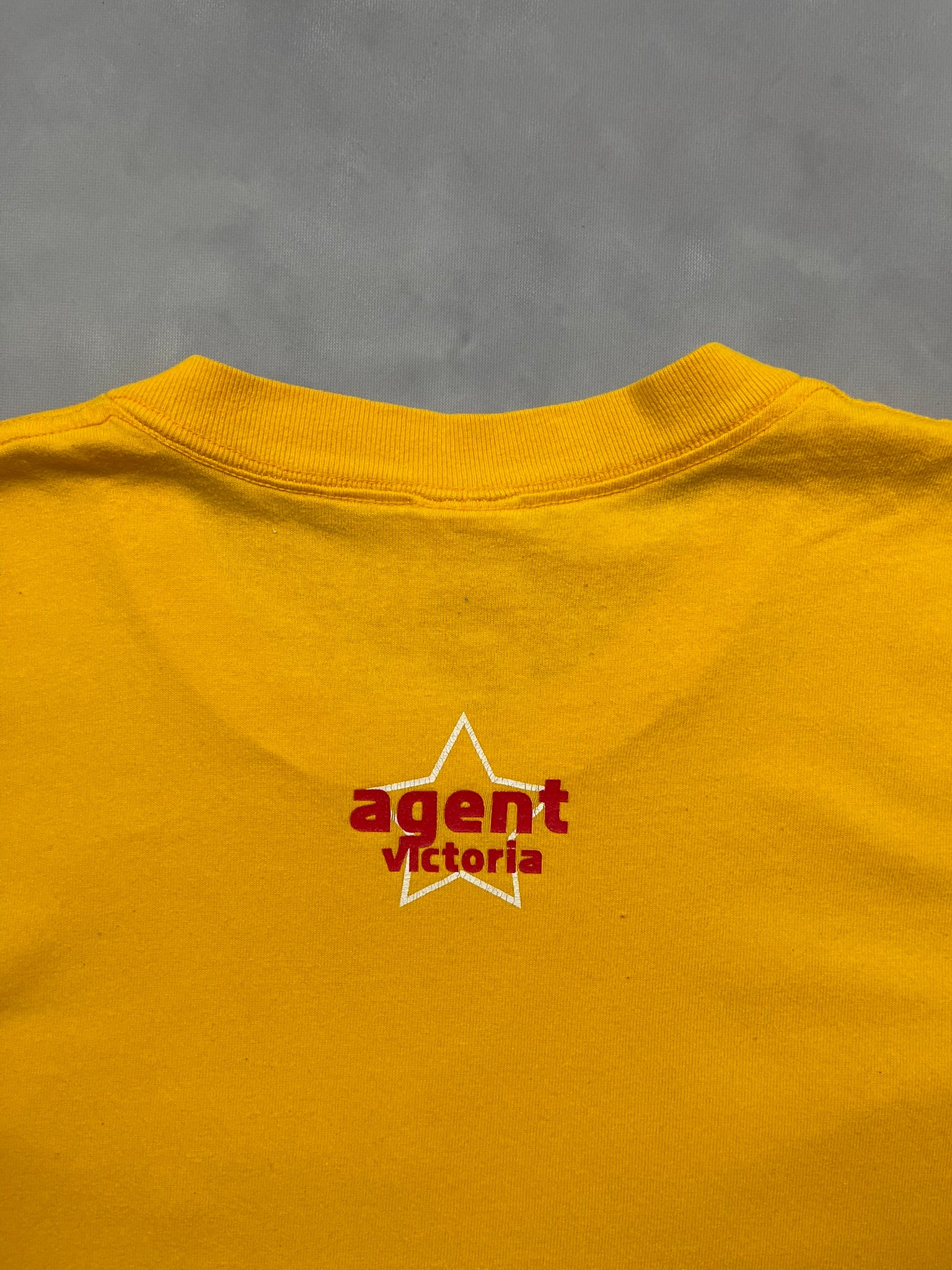 Bright 2000s “Froshstars” promo tee on a golden yellow Fruit of the Loom Heavy tag, made in Canada. Front hit with bold red-and-white star logo and small “agent victoria” print on the upper back. True early-2000s campus event or sponsor shirt with that thick cotton feel and crisp collegiate energy. Clean, vibrant, and ready for any Y2K streetwear rotation.