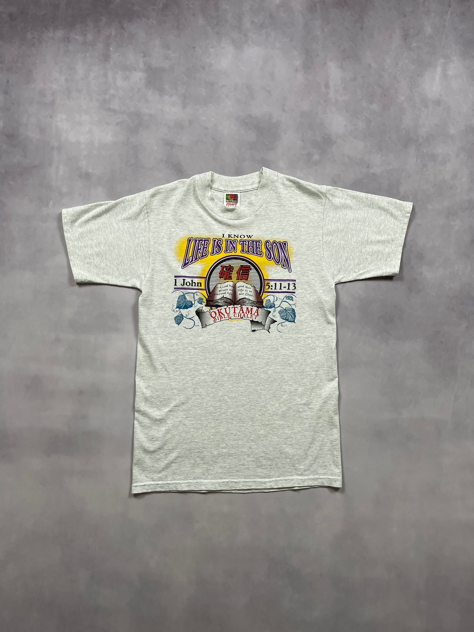 Early 2000s Fruit of the Loom tee with bold faith-based graphics tied to the Okutama Bible Chalet. Features a standout front hit with “Life Is in the Son” in purple and gold, plus scripture from 1 John 5:11–13 laid over an illustrated Bible and ivy scrolls. Heavy cotton with a clean heather grey base — solid pickup for Christian tee collectors