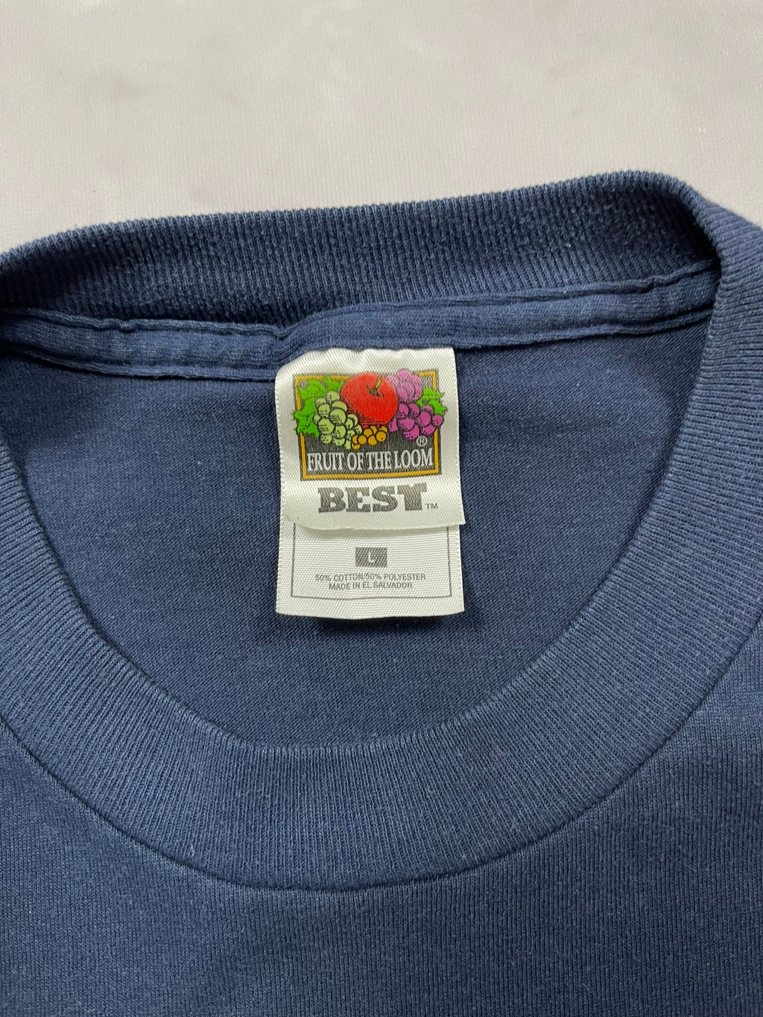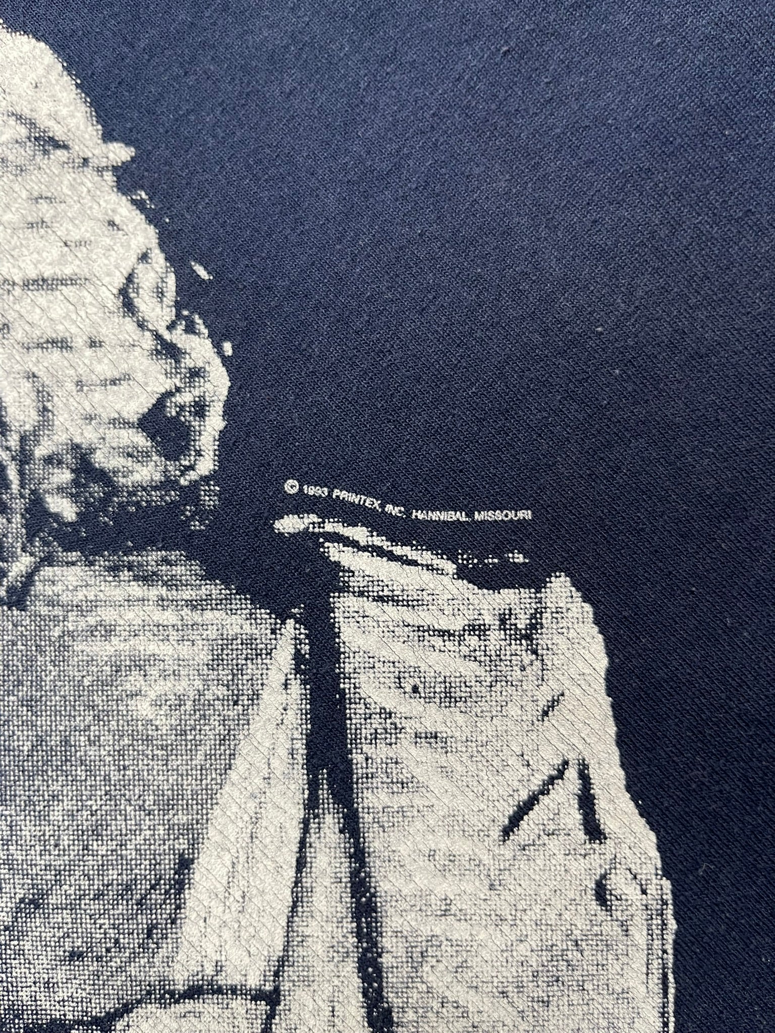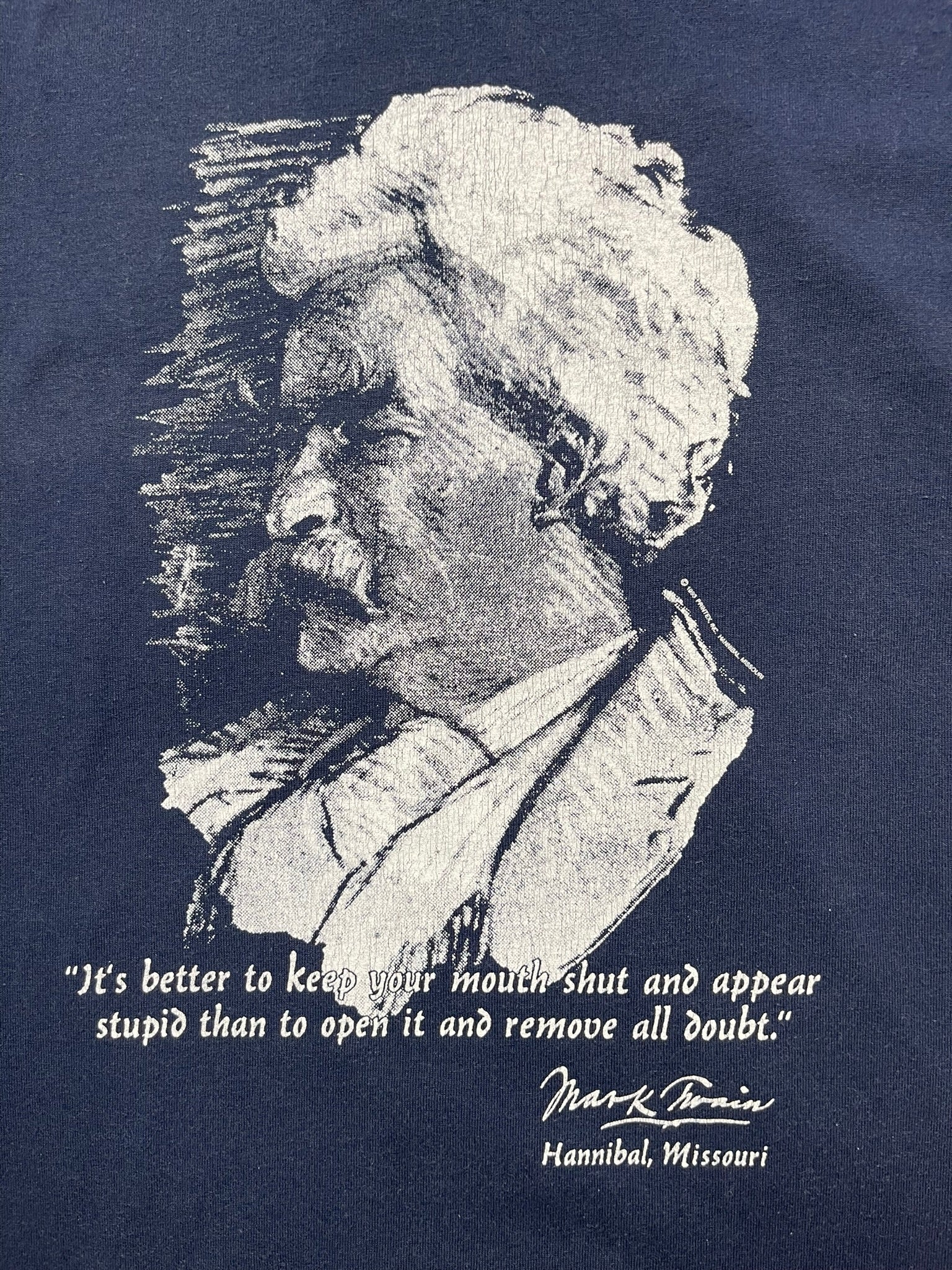 Late 90s or early 00s Mark Twain tee on a navy Fruit of the Loom BEST tag — classic 90s tourist print with a cracked portrait sketch and iconic quote: “It’s better to keep your mouth shut and appear stupid than to open it and remove all doubt.” Printed in Hannibal, Missouri, Twain’s hometown, and backed with that dry-wit Americana charm. Solid pickup for fans of literary tees, novelty quote shirts, or 90s souvenir graphics with brains behind the print.